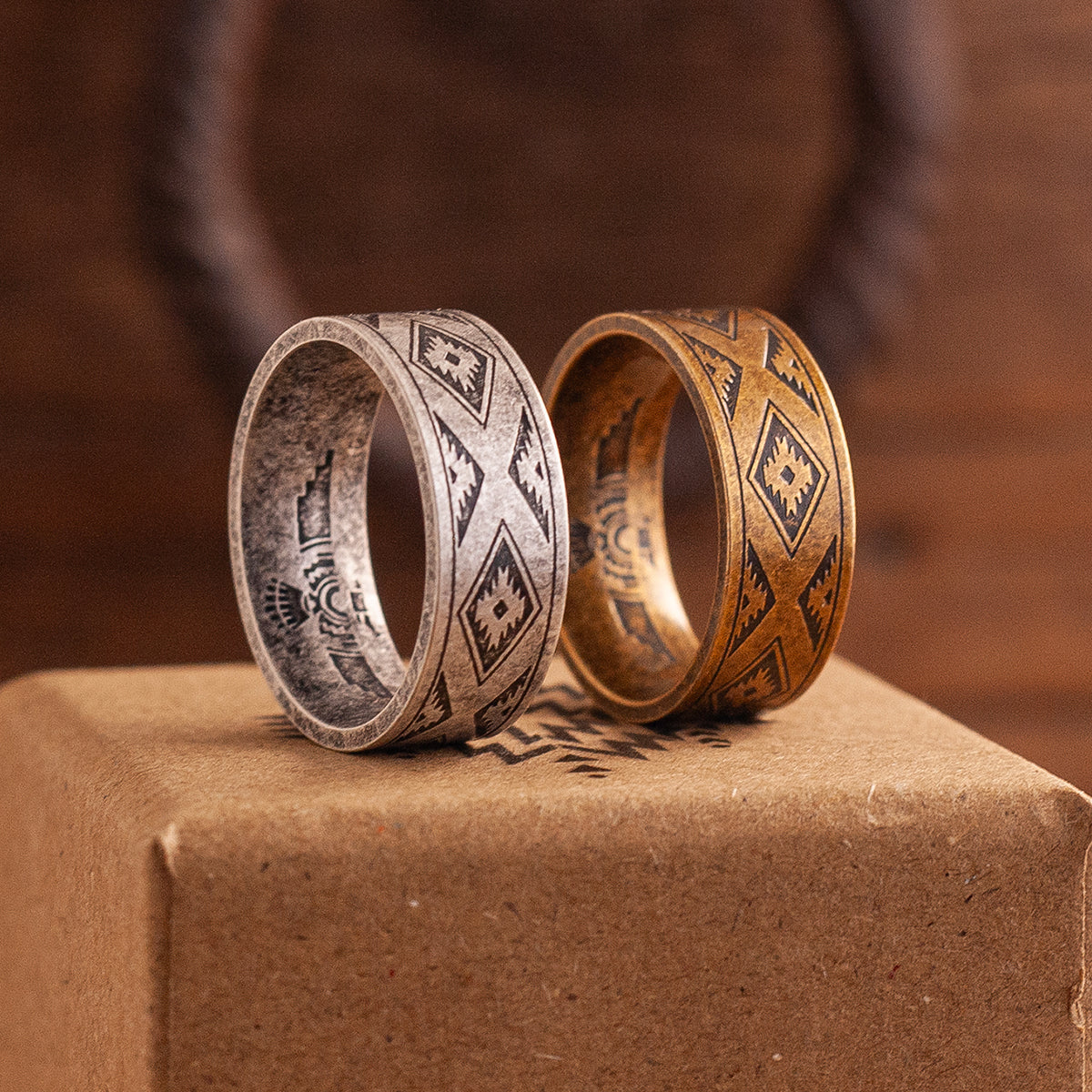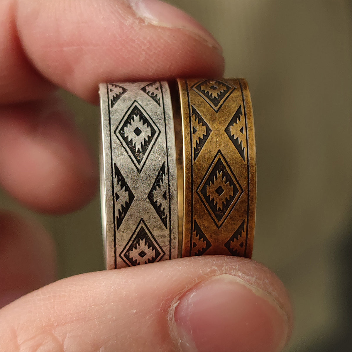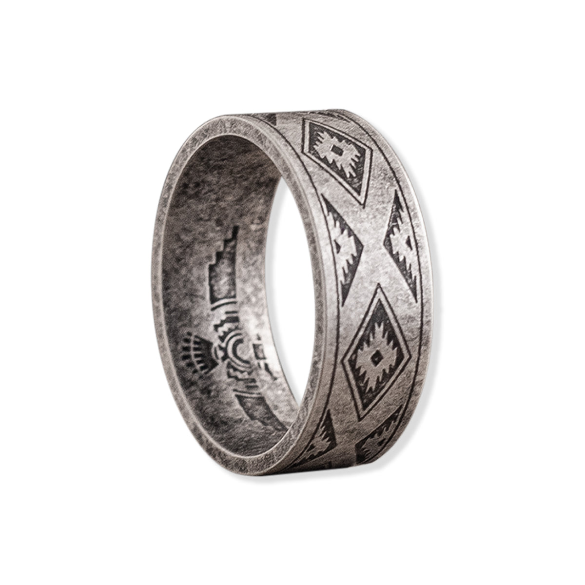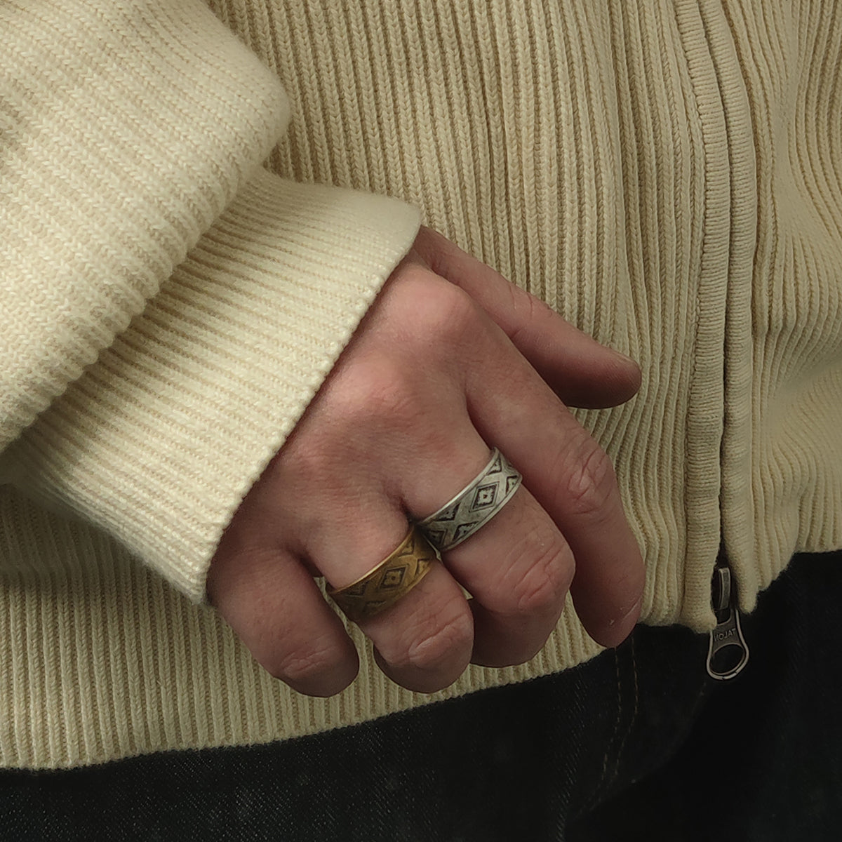 外側には力強いナバホ柄の幾何学模様、内側には守護を象徴するサンダーバード柄を刻み込んだチタンリング。表と裏で異なる表情を楽しめる一本に仕上げました。表面には味わい深いヴィンテージ加工を施し、長年使い込んだようなマットな質感と陰影を表現。ネイティブデザインの持つ力強さをより印象的に引き立てています。素材には軽量かつ高い強度を誇るチタンを採用し、耐久性・耐腐食性にも優れるため、日常使いでも気兼ねなく着用できます。外側の存在感と、内側に秘めたシンボリックな意匠が共存する、こだわりの一本です。
