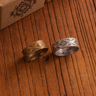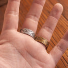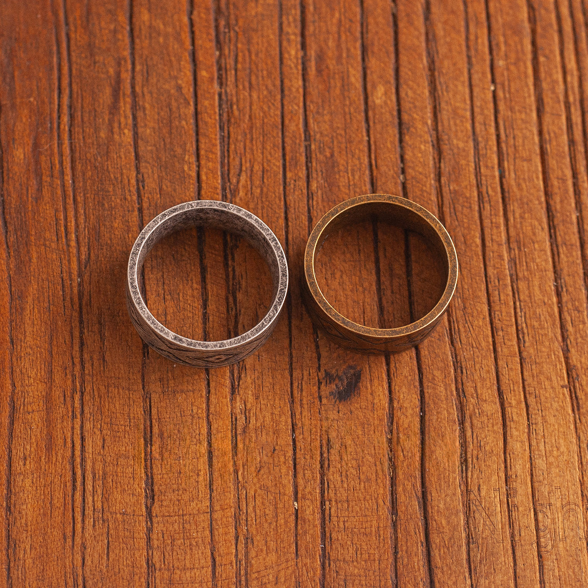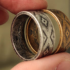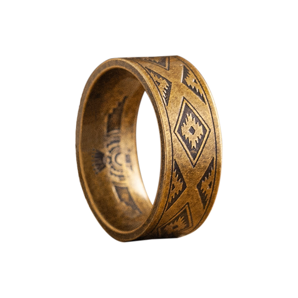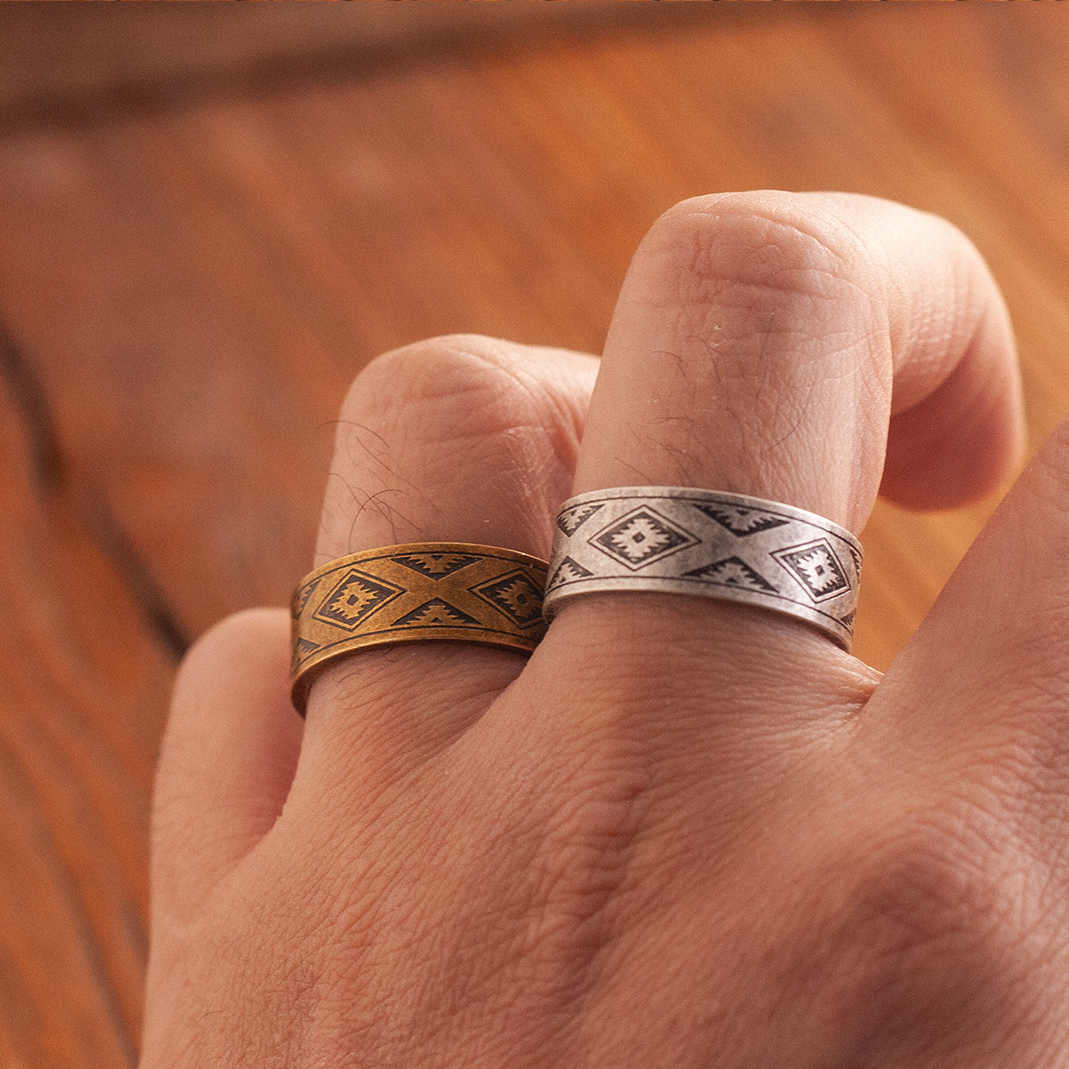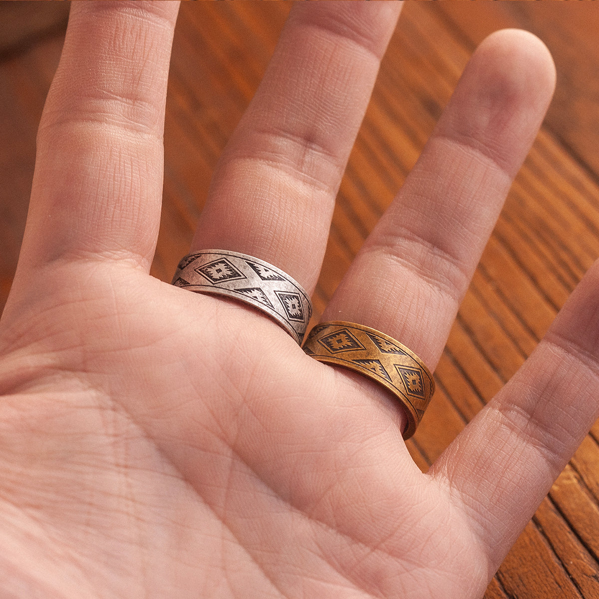 外側には力強いナバホ柄の幾何学模様、内側には守護を象徴するサンダーバード柄を刻み込んだチタンリング。表と裏で異なる表情を楽しめる一本に仕上げました。表面には味わい深いヴィンテージ加工を施し、長年使い込んだようなマットな質感と陰影を表現。ネイティブデザインの持つ力強さをより印象的に引き立てています。素材には軽量かつ高い強度を誇るチタンを採用し、耐久性・耐腐食性にも優れるため、日常使いでも気兼ねなく着用できます。外側の存在感と、内側に秘めたシンボリックな意匠が共存する、こだわりの一本です。