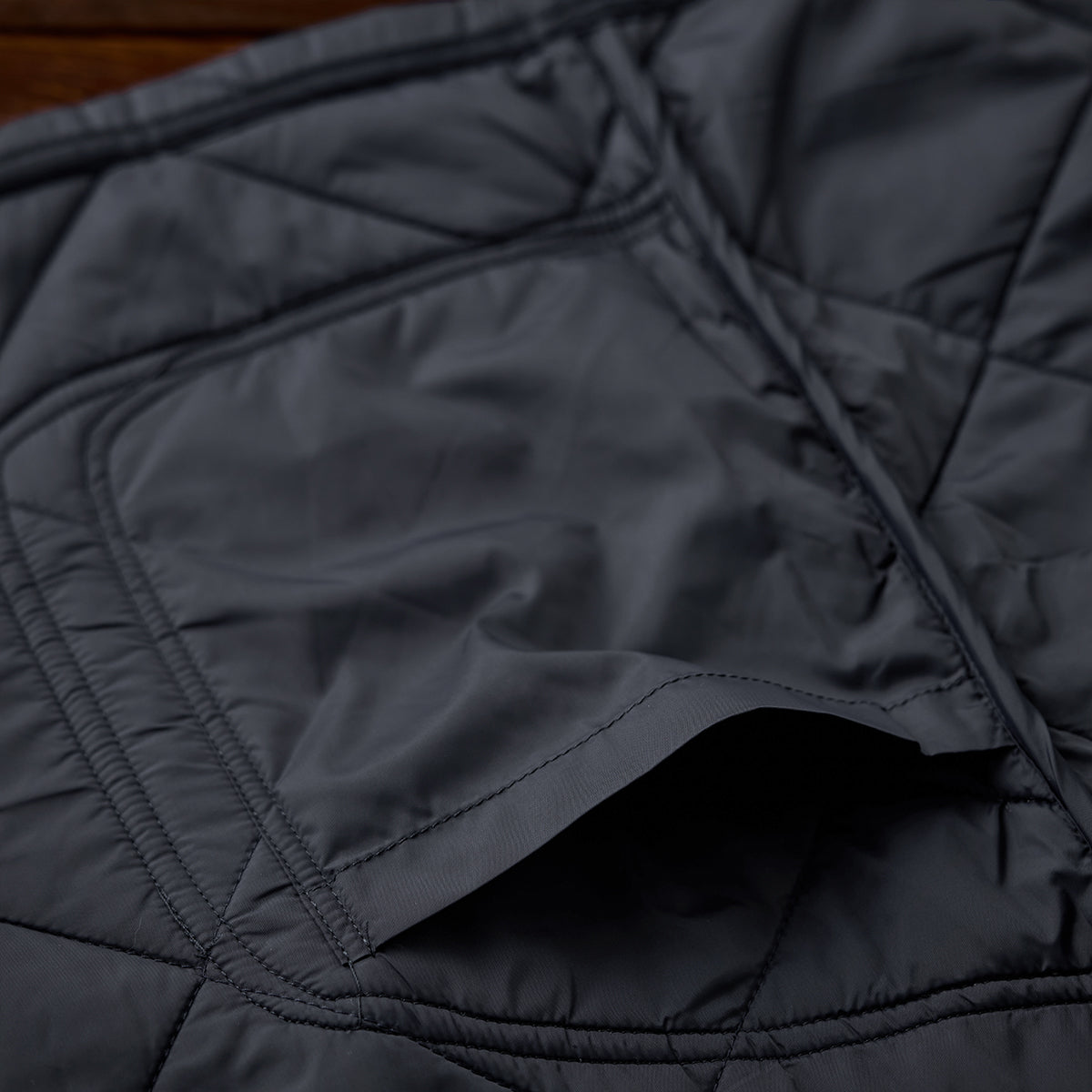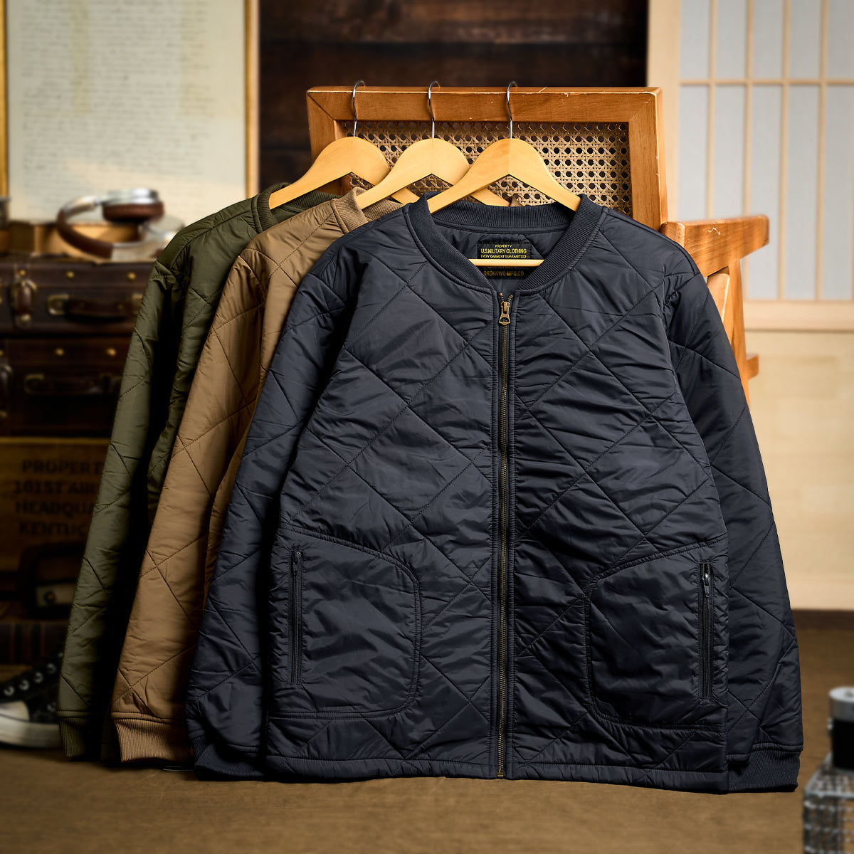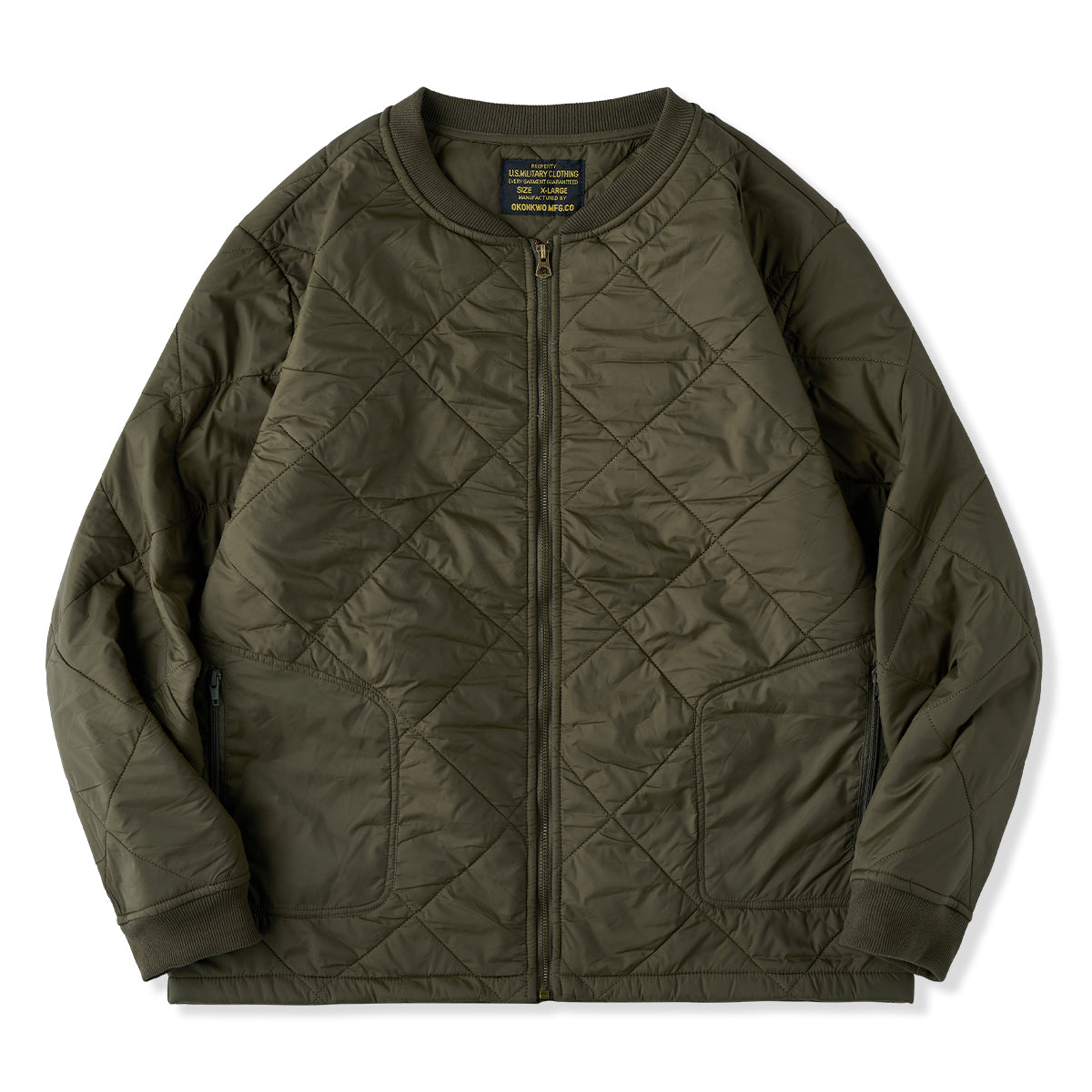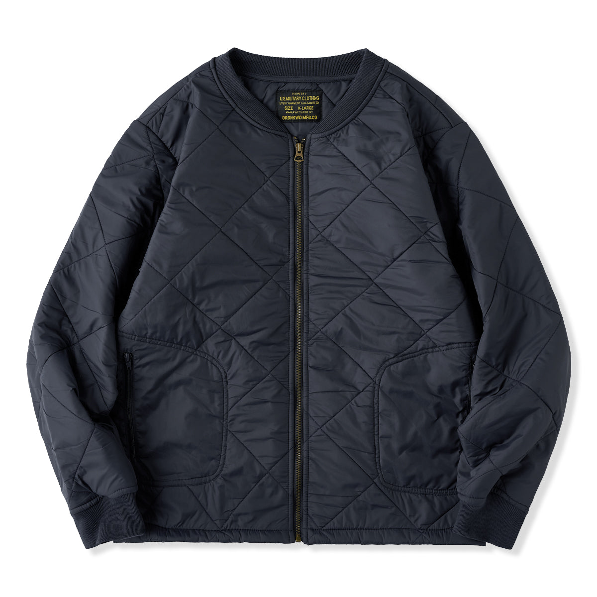 第二次世界大戦期の“M-43ジャケット”をベースに、現代のデイリーウェアとして再構築した改良型インナージャケット。クラシックなミリタリーの意匠を残しつつ、軽量で保温性に優れた中綿キルティングを採用することで、アウターにもインナーにも使える高い汎用性を実現しました。首元にはベースボールカラーを採用し、ミリタリーの武骨さに程よい抜け感をプラス。フロントは扱いやすいジップ仕様で、着脱がスムーズ。腰には実用性の高いポケットを配置し、ミリタリーらしい機能美を際立たせました。程よくゆとりを持たせたシルエットは、シャツやスウェットの上からも羽織りやすく、M-65やフィールドジャケットのライナーとしても相性抜群。