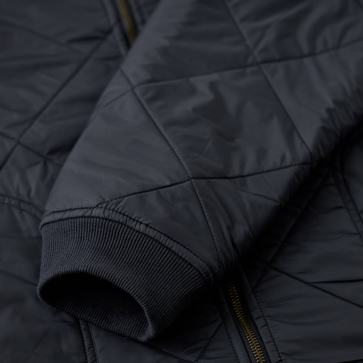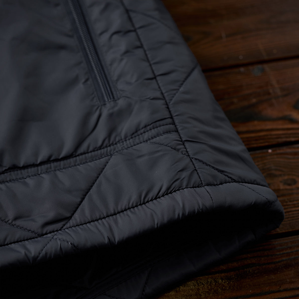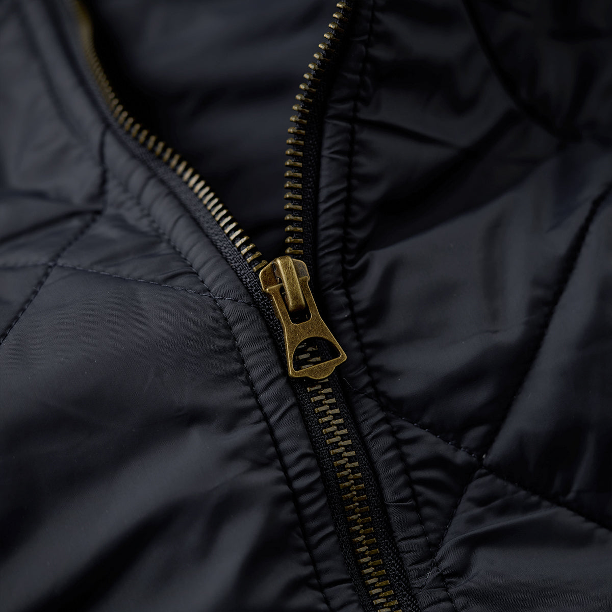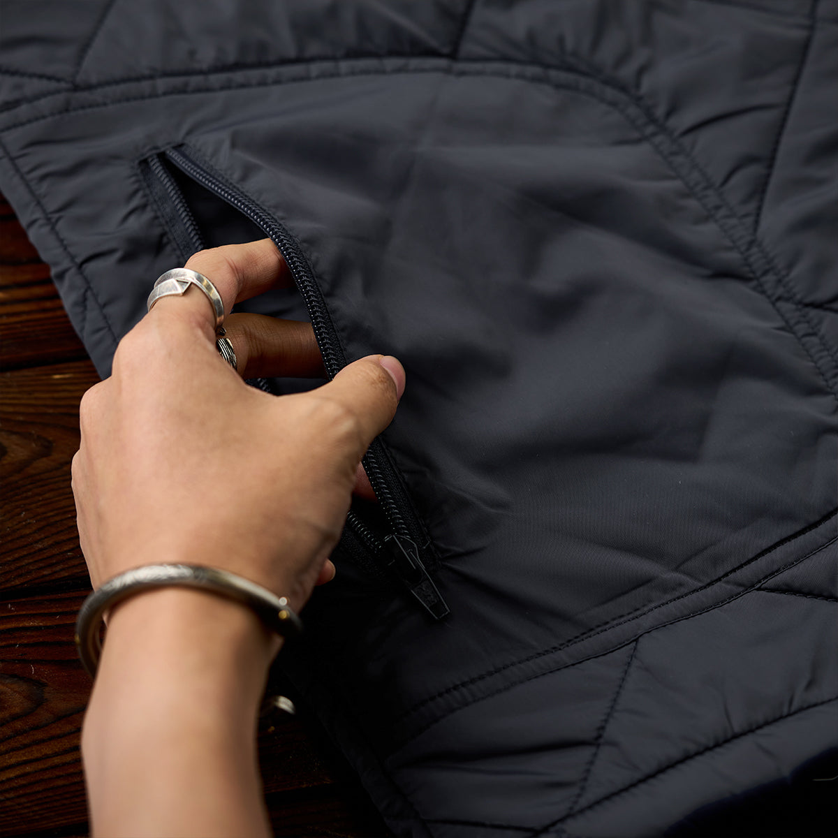 ボディには柔らかなポリエステル生地を使用し、見た目以上に軽い着心地。キルティングステッチが均一に熱をため込み、冬場のレイヤードでもストレスの少ない暖かさを提供します。