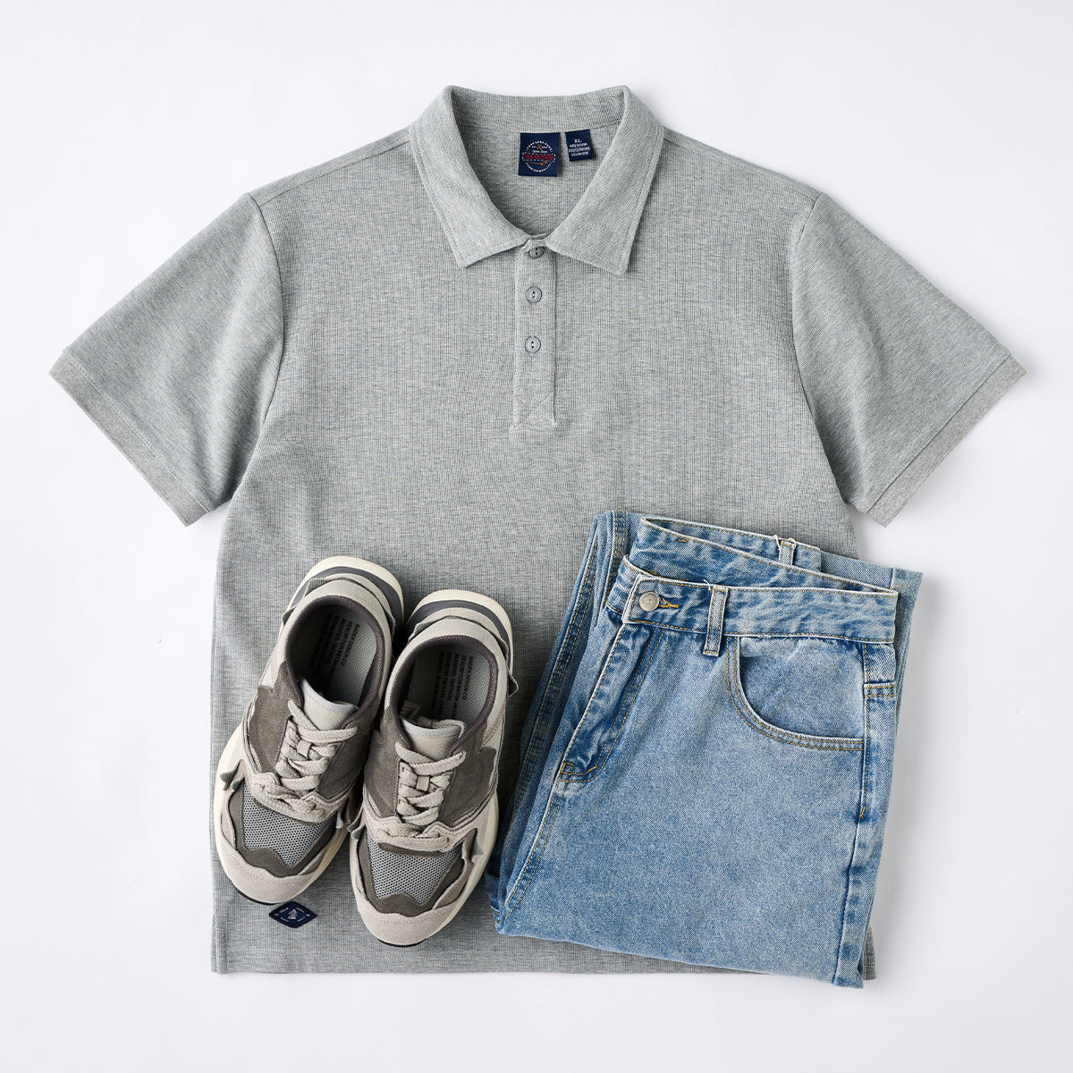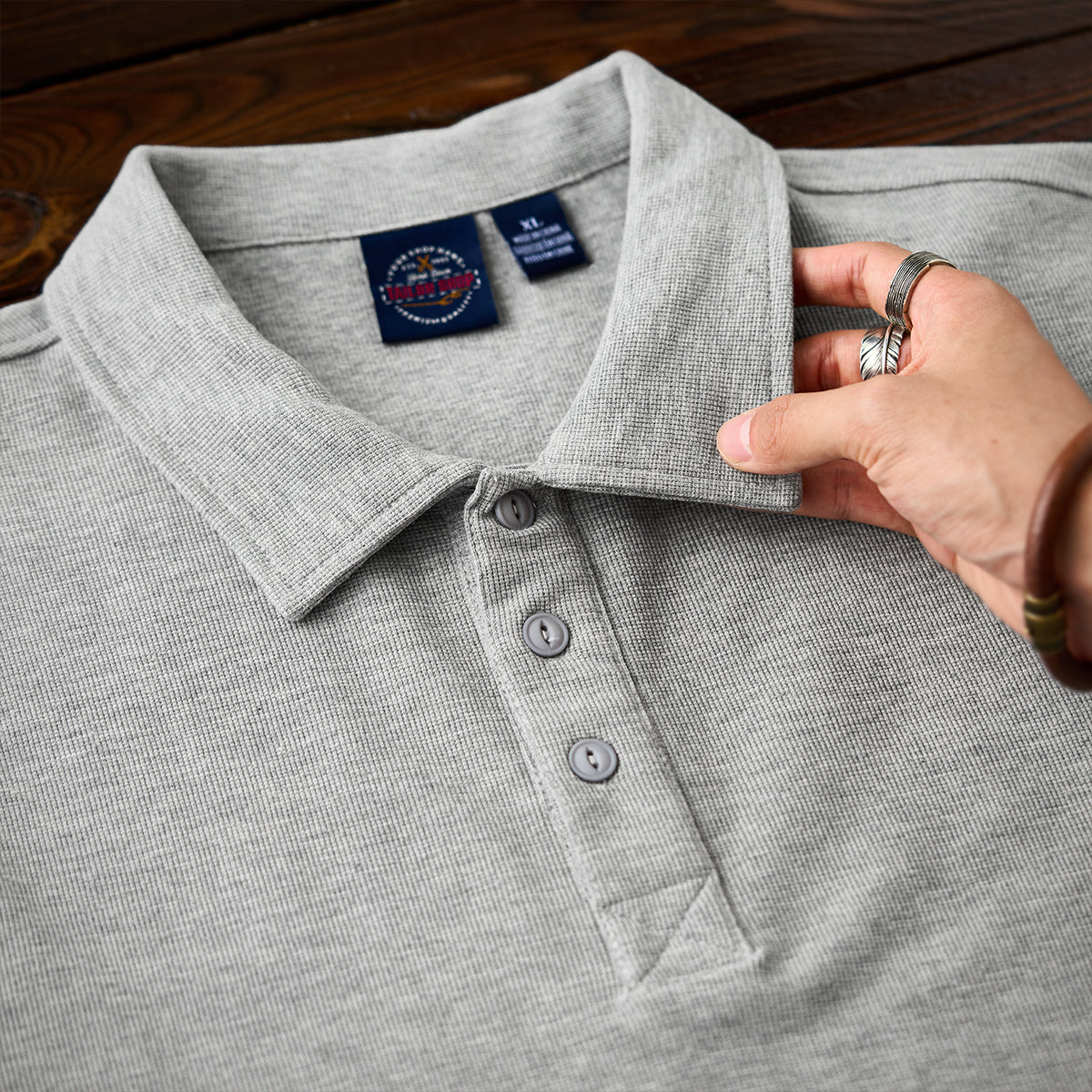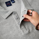 ポロのクラシックな襟元とボタンが特徴で、カジュアルながらも少しフォーマルな印象を与え、特に襟が強調されて、スタイル感をアップさせている。