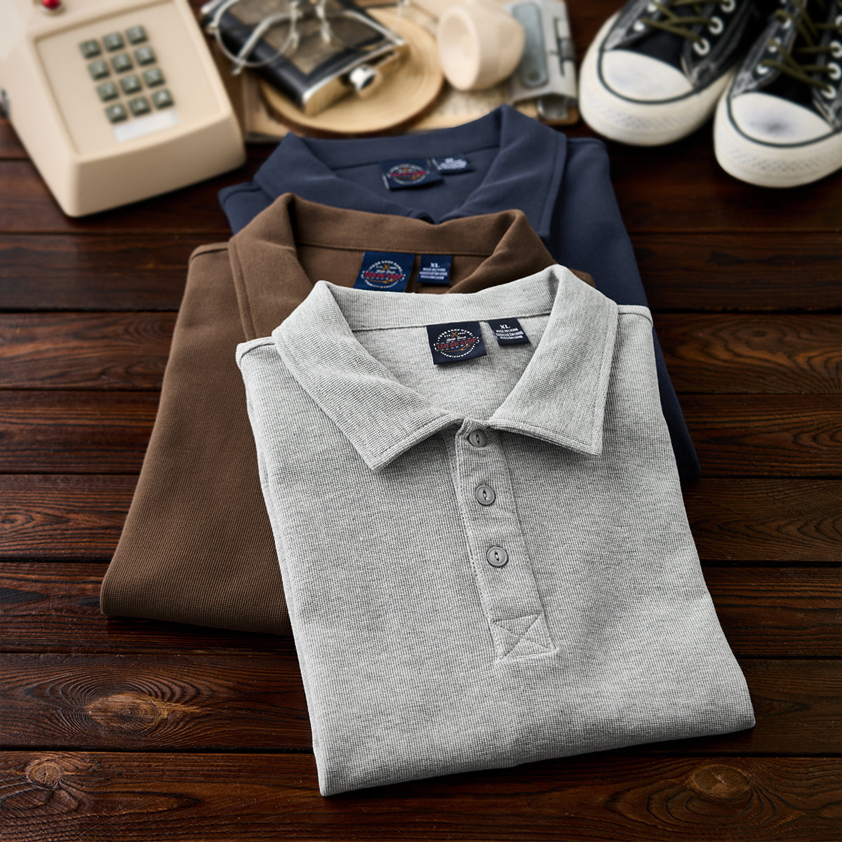 男らしさ満載のダークブルー、どんな色目とも相性のライトグレー、スタイリッシュな大定番のコーヒー3色展開で、落ち着いた色味なので、汎用性が高く合わせやすい。