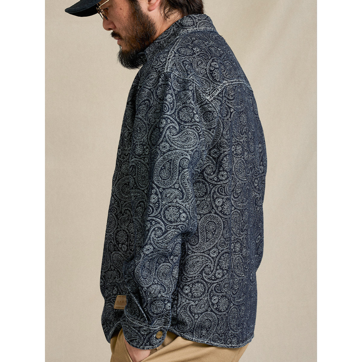 クラシカルなペイズリー柄を、ジャカード織りで立体的に表現したデニムプルオーバーシャツ。プリントでは味わえない、織りならではの奥行きと表情が、シンプルな中に確かな存在感を与えます。フロントはハーフボタン仕様を採用し、ヴィンテージワークシャツを思わせるクラシックな佇まいに。被りタイプならではのリラックス感がありつつ、首元の開閉で表情の変化も演出できます。一枚で主役になるのはもちろん、インナーとしても程よく映えるデザイン。素材感と柄の奥行きを楽しみたい、大人のためのデニムシャツです。