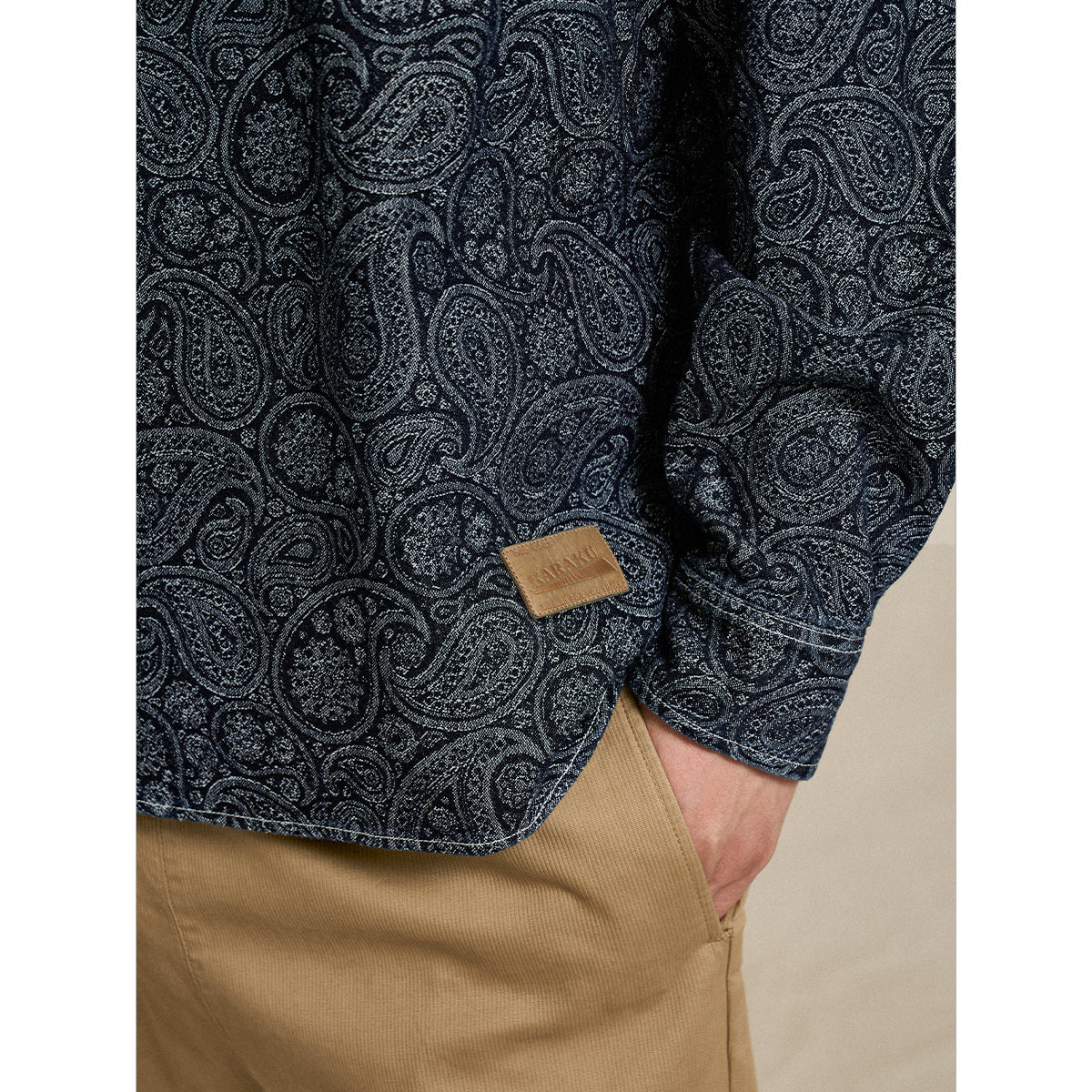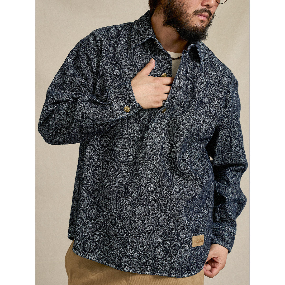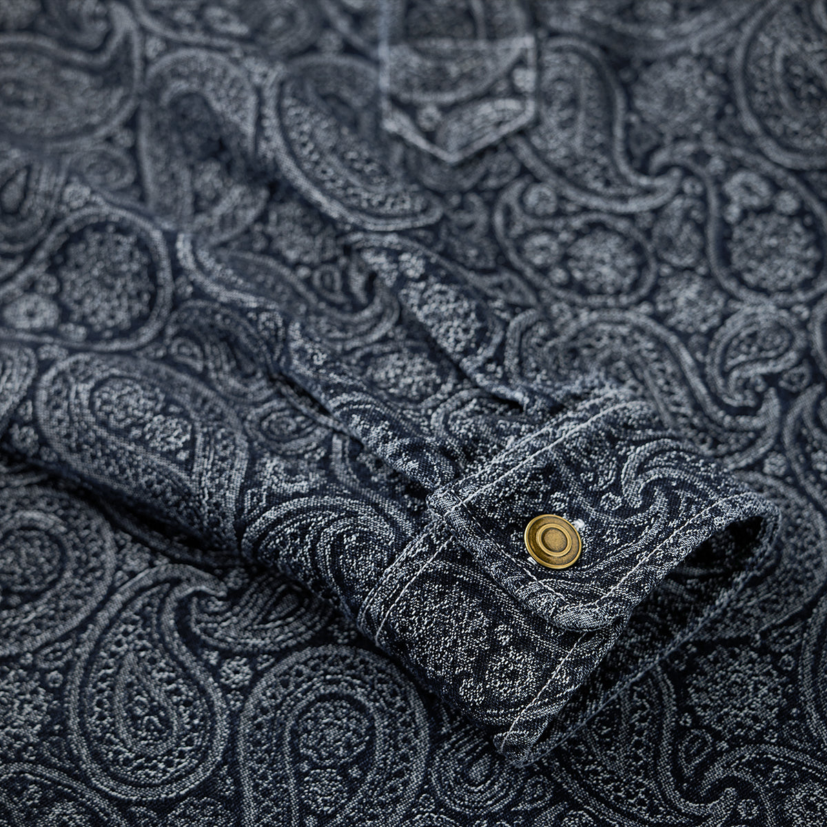 ペイズリー柄ジャガード織りデニム ハーフボタンデニムプルオーバーシャツ