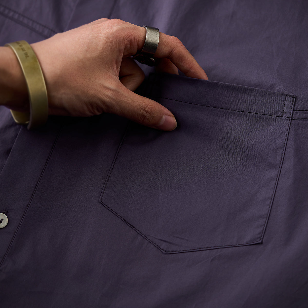 胸元に配置されたウェーブステッチラインは、視覚的にシャツのラインを引き締め、洗練された印象を与えます。左胸にワンポケットが付いており、シンプルながら実用性をプラスしています。