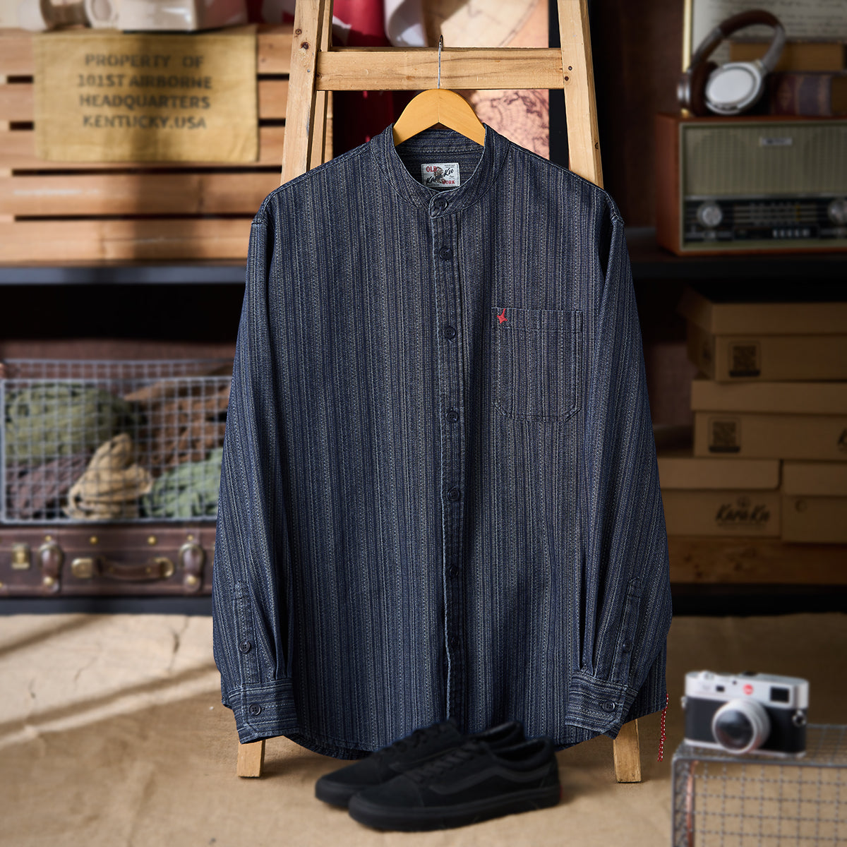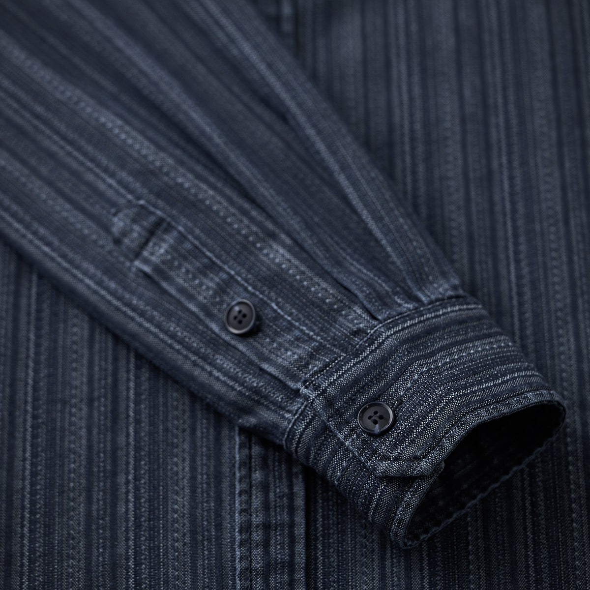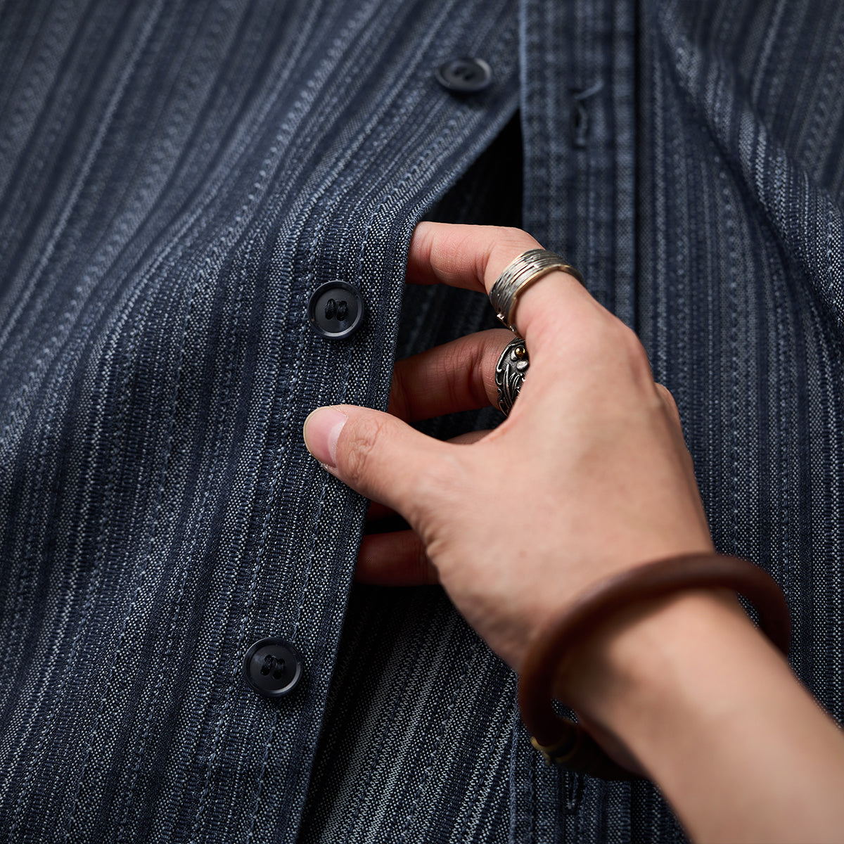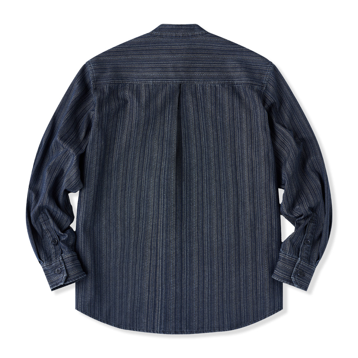 バンドカラー仕様で、カジュアルながら洗練された印象です。ジャカード織りによるストライプが施されており、奥行きのあるテクスチャが生地に高級感を与えています。