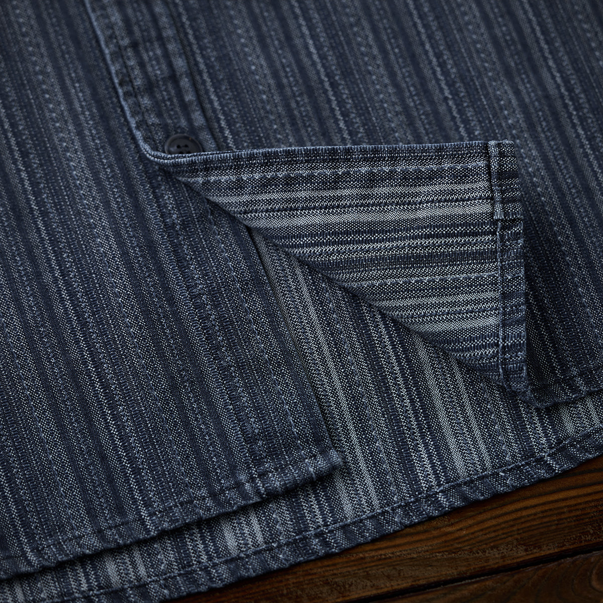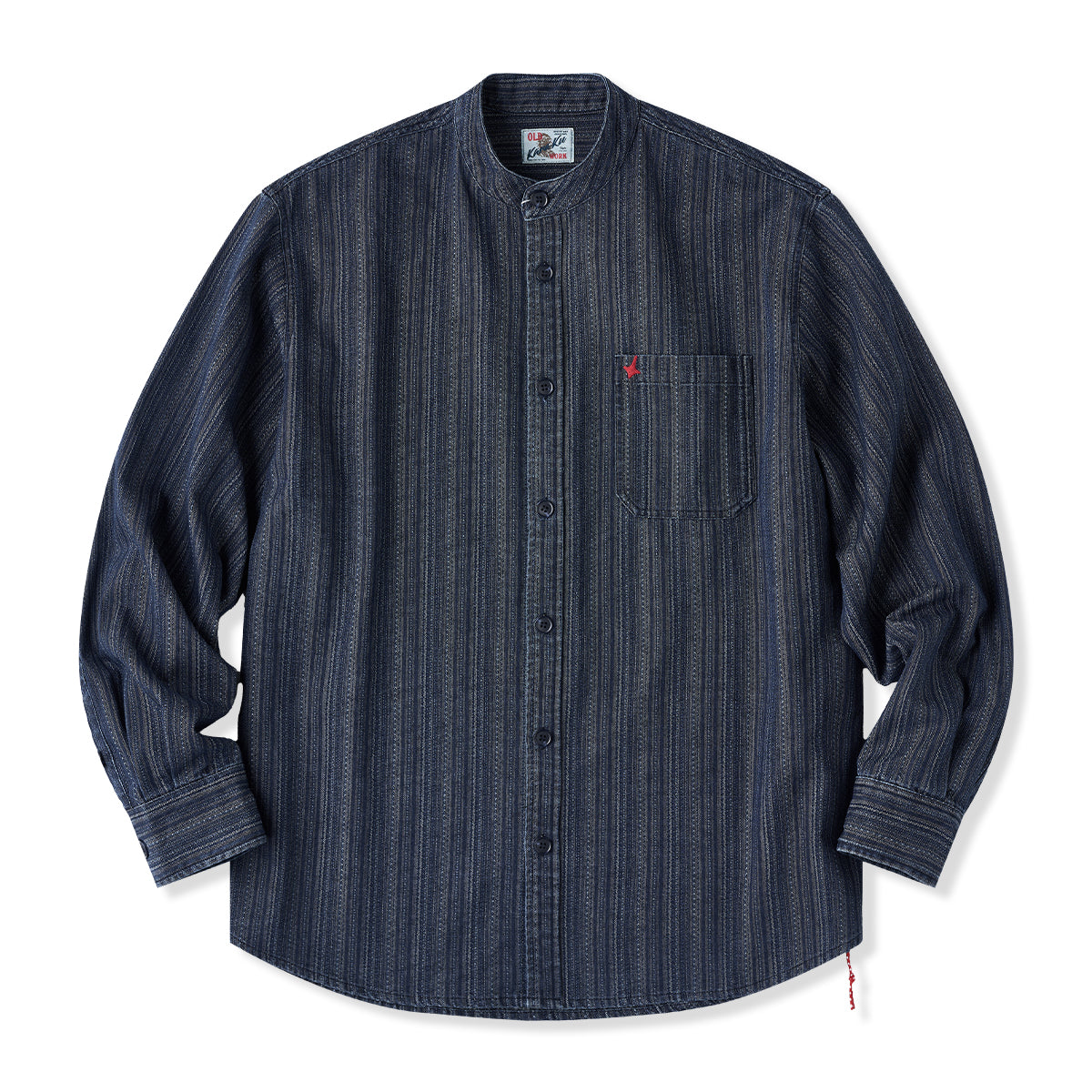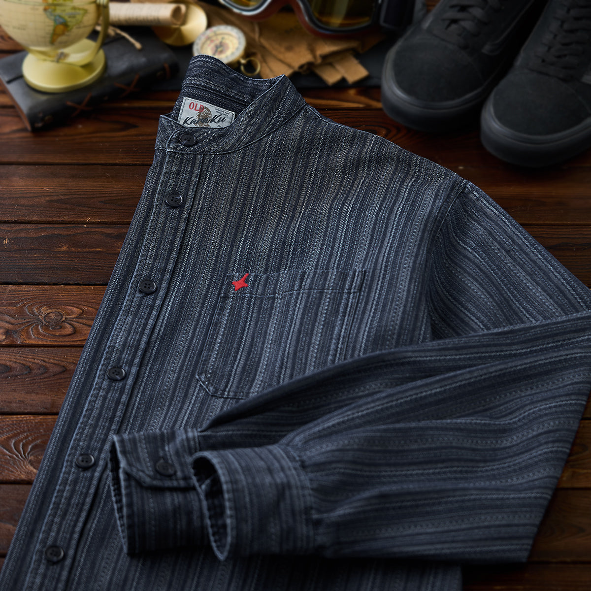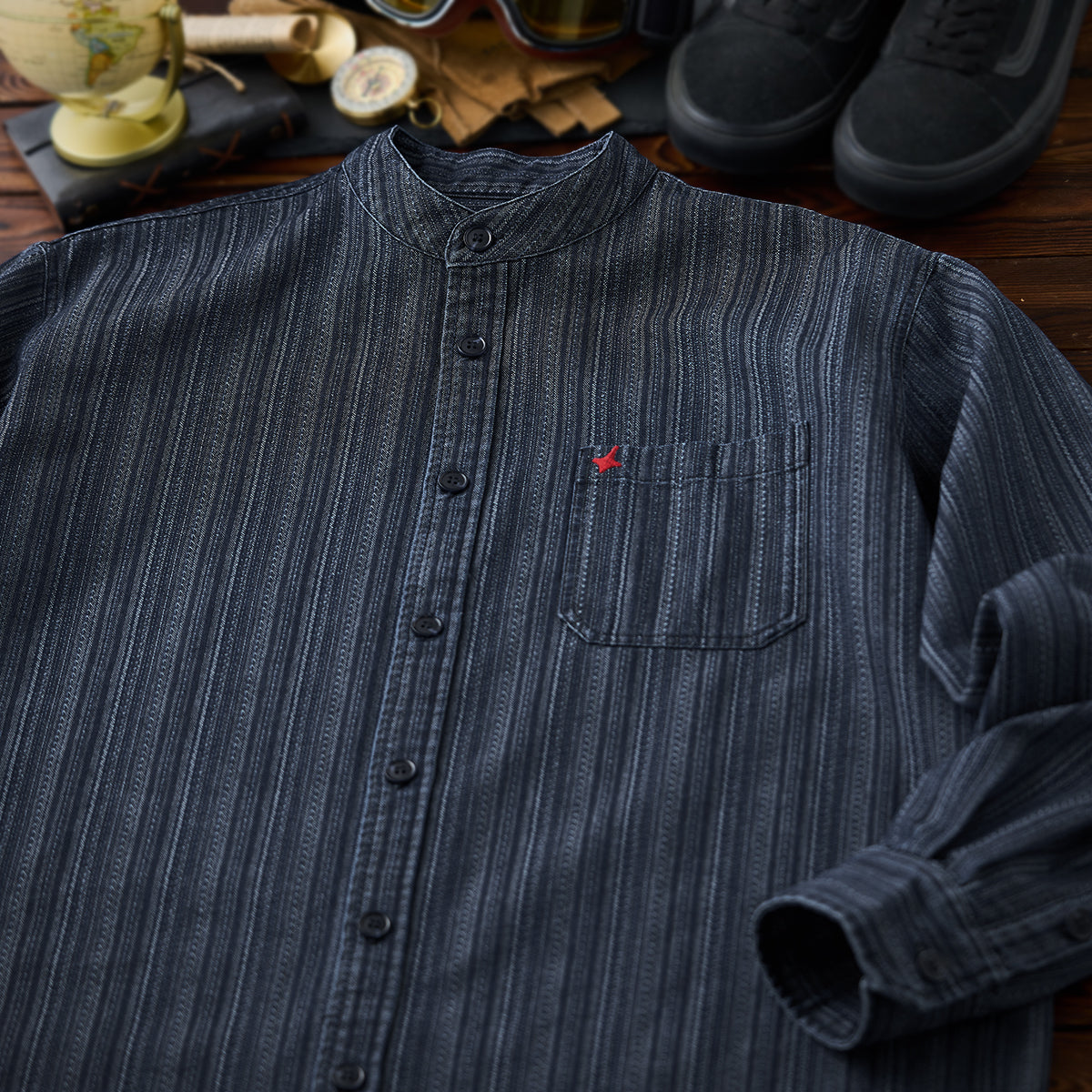 バンドカラー仕様で、カジュアルながら洗練された印象です。ジャカード織りによるストライプが施されており、奥行きのあるテクスチャが生地に高級感を与えています。