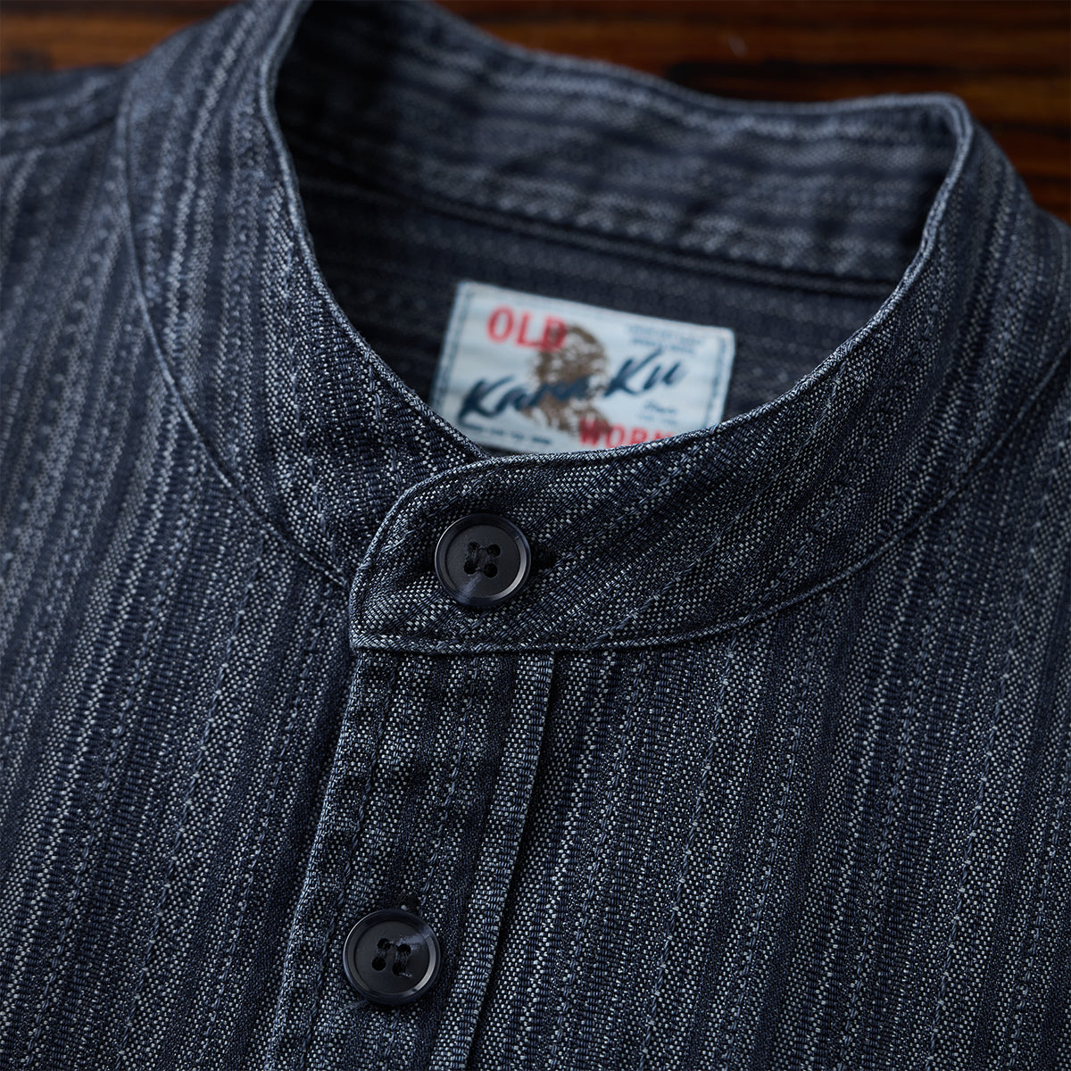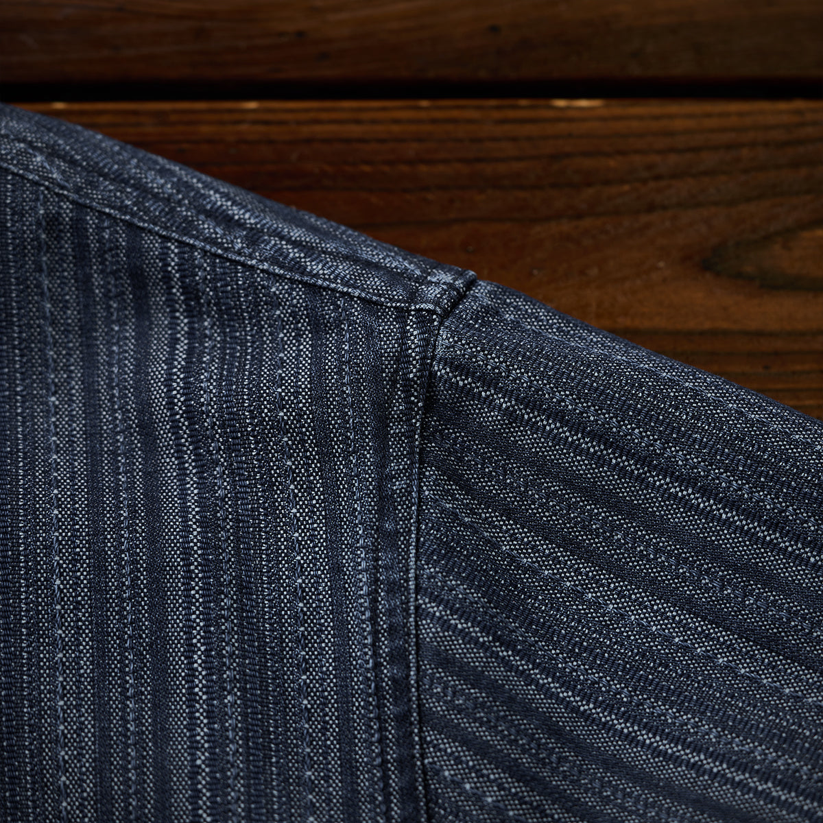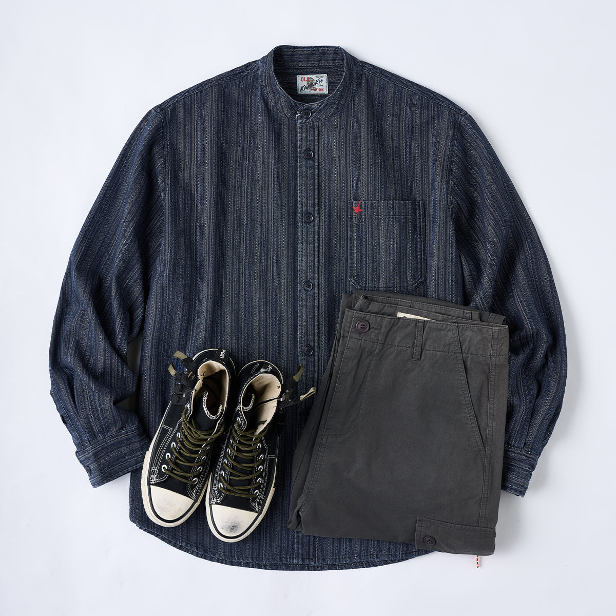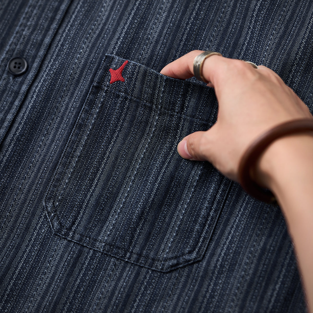 バンドカラー仕様で、カジュアルながら洗練された印象です。ジャカード織りによるストライプが施されており、奥行きのあるテクスチャが生地に高級感を与えています。