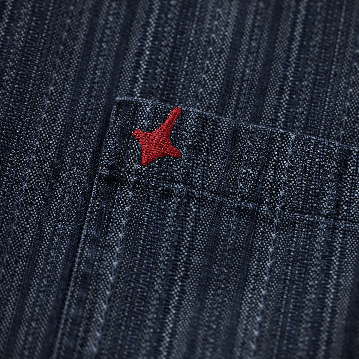 胸ポケットに施された赤いブランドロゴがアクセントとなり、シンプルなデザインに個性を加えています。背中にプリーツが入り、動きやすさを確保しています。