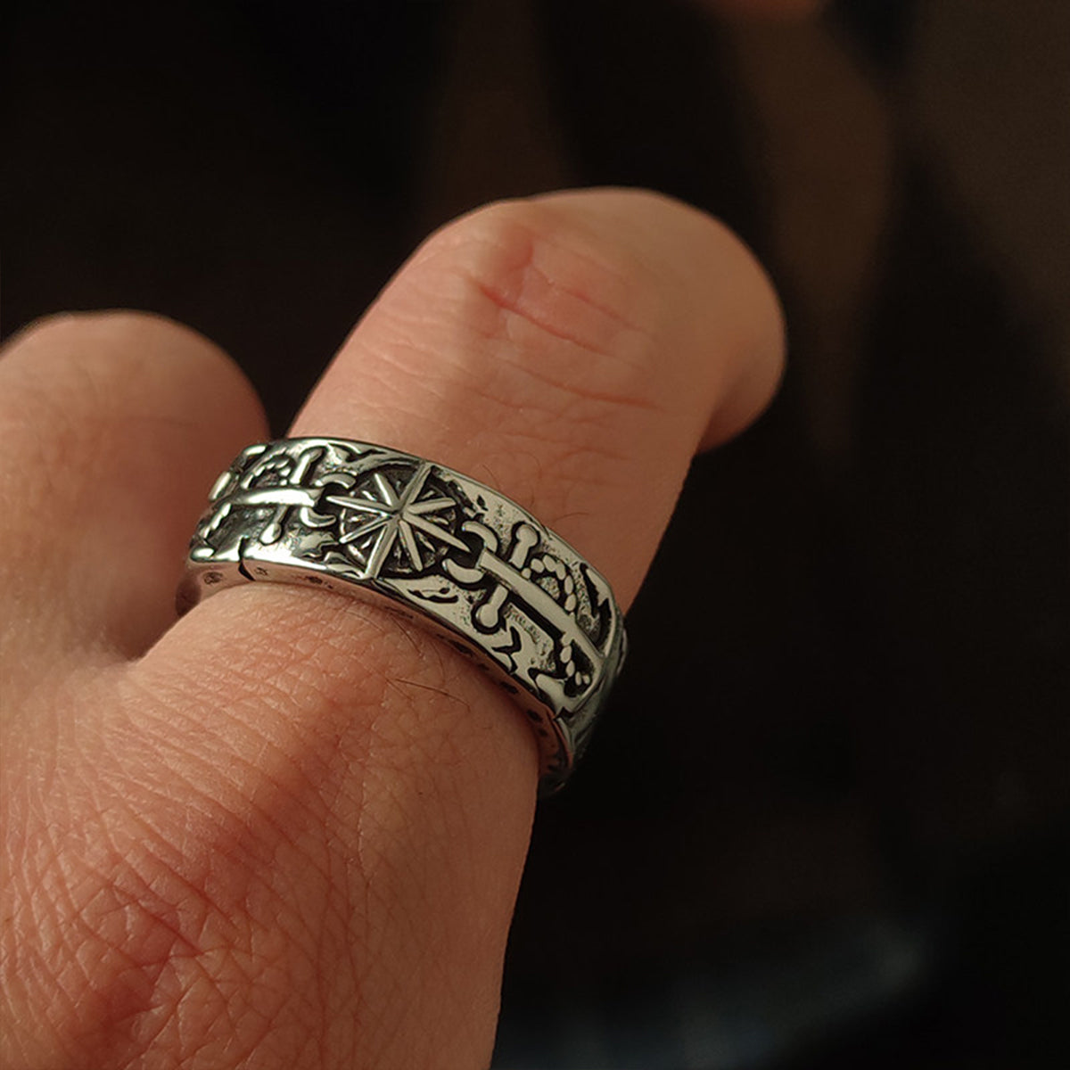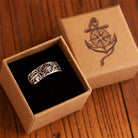 軽量で耐久性に優れたチタン製のアンカーリングです。アンカー、コンパスの浮彫を施し、細部までこだわったデザインに仕上げました。正面・側面には裂け目のようなテクスチャーを入れ、部分的にヴィンテージ加工を施すことで、立体感と歴史を感じさせる重厚な雰囲気を演出。手元に着けるだけで、海の冒険心やロマンをさりげなく表現できる一品です。チタン製なので軽く、長時間の着用でも快適にお使いいただけます。
