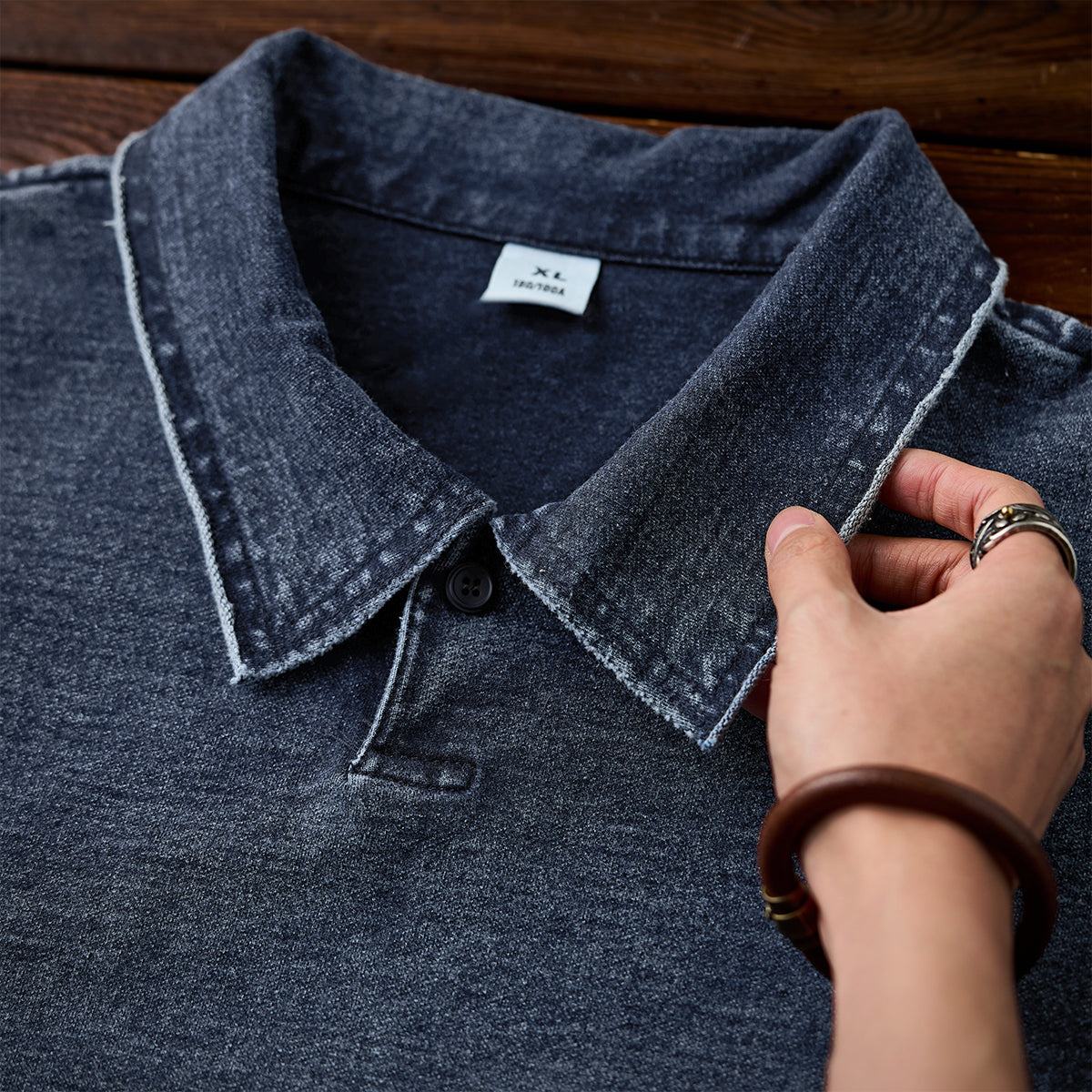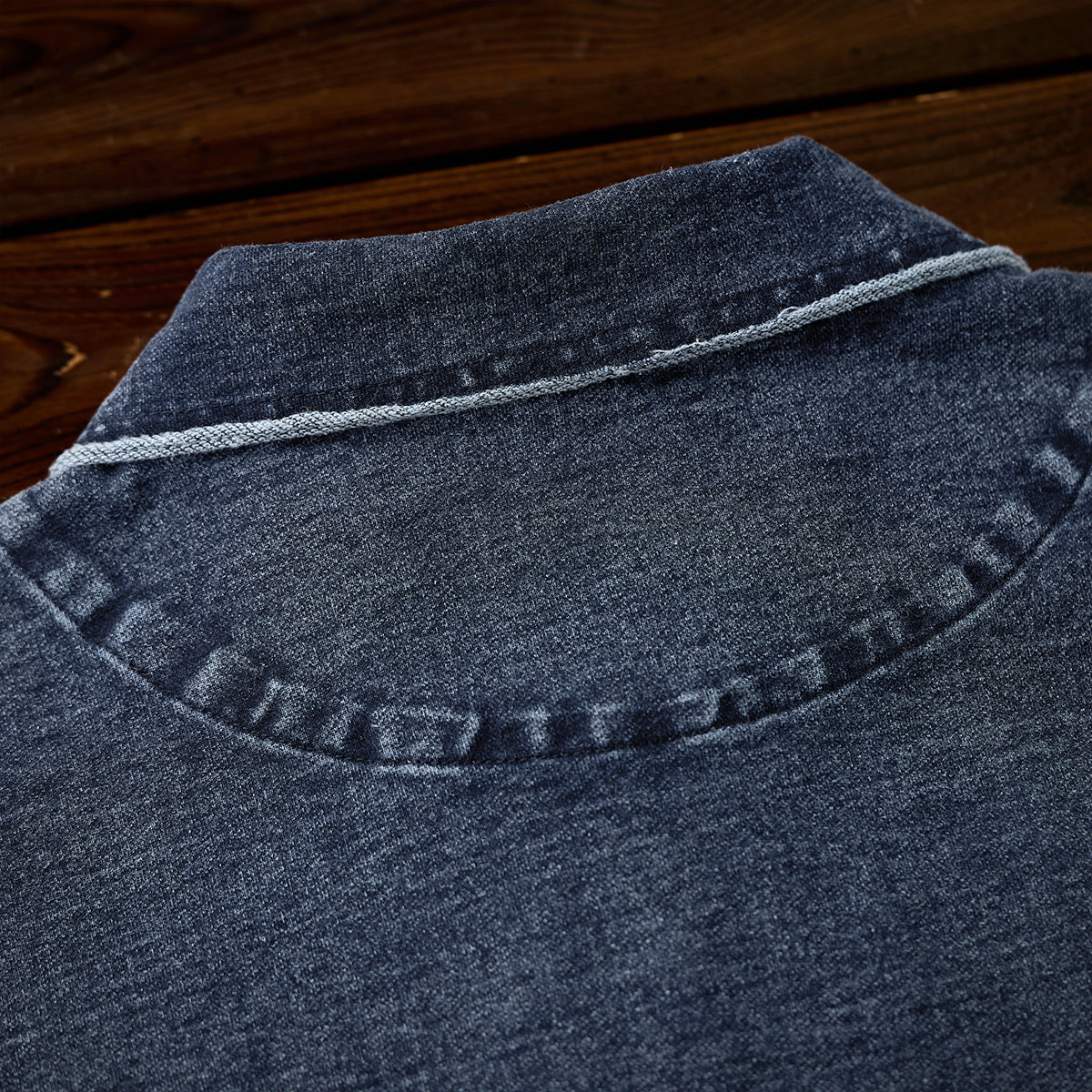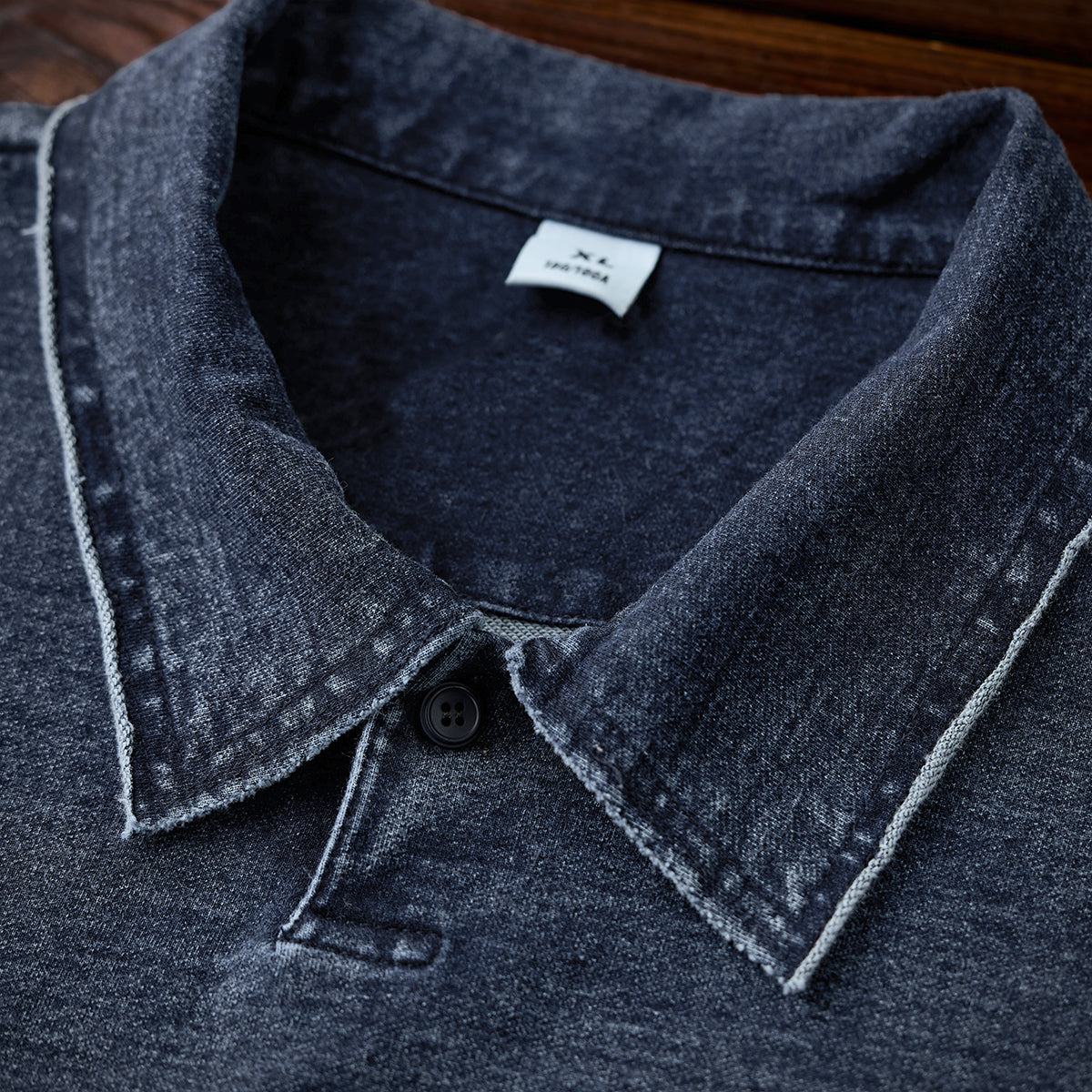 襟周辺や肩の縫い目では、切りっぱなしのような加工が施され、適度なユーズド感を演出しています。ポロカラーが付いており、襟元のボタンは1つだけで、シンプルかつミニマルです。ボタンを留めるか開けるかで印象を変えることが可能です。