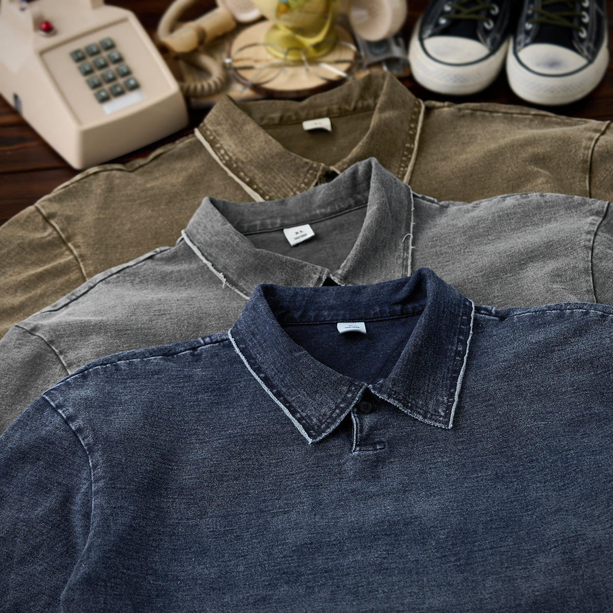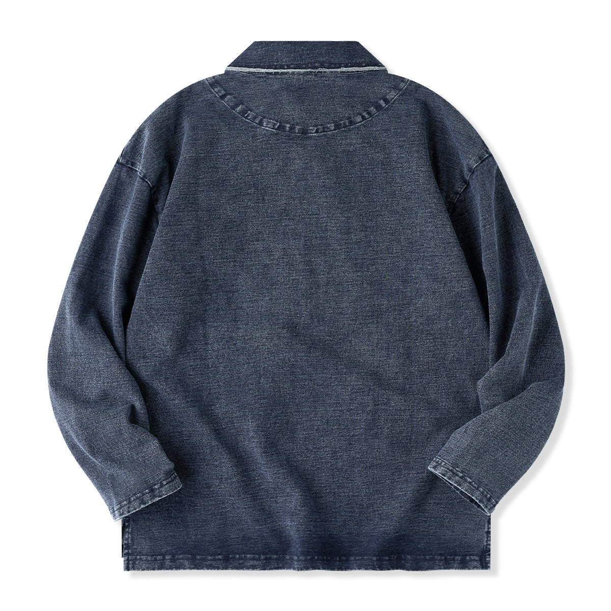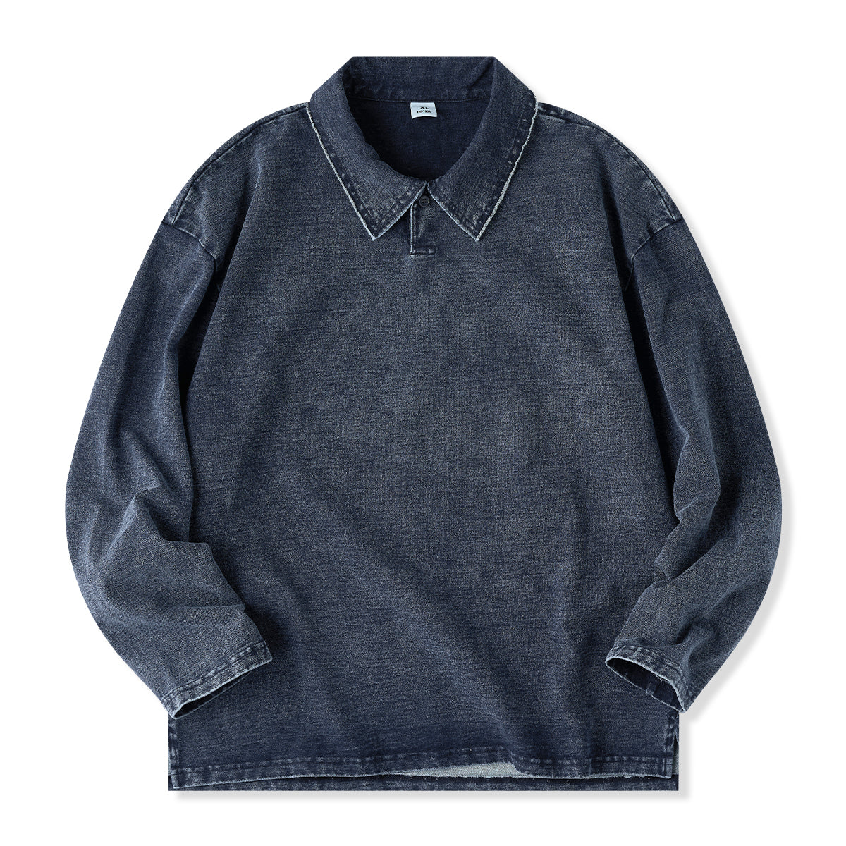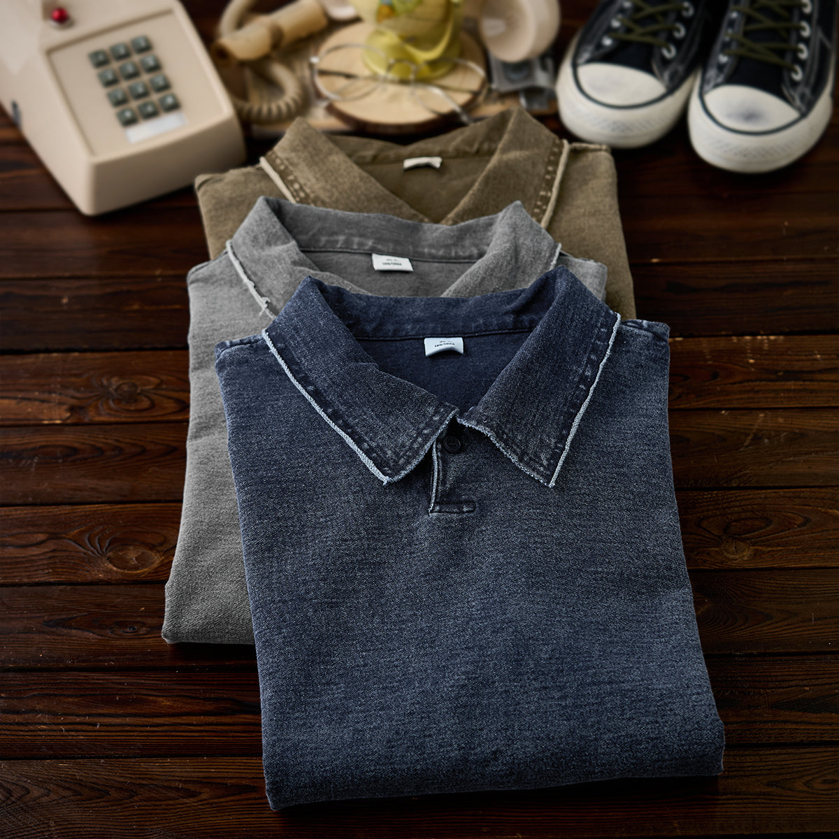 襟周辺や肩の縫い目では、切りっぱなしのような加工が施され、適度なユーズド感を演出しています。ポロカラーが付いており、襟元のボタンは1つだけで、シンプルかつミニマルです。ボタンを留めるか開けるかで印象を変えることが可能です。