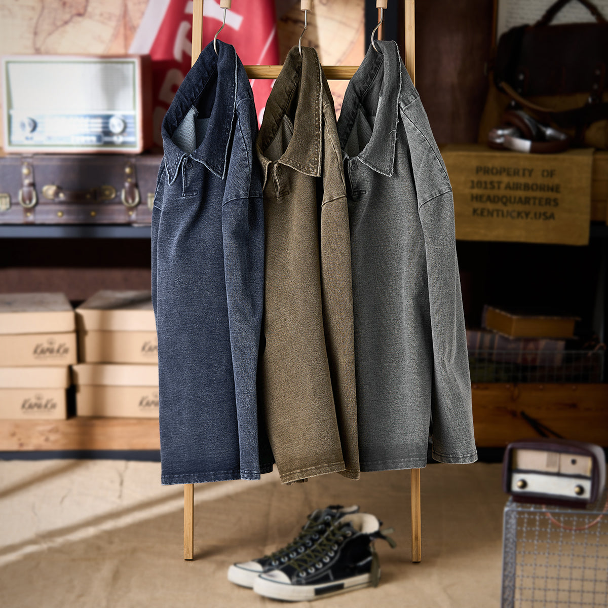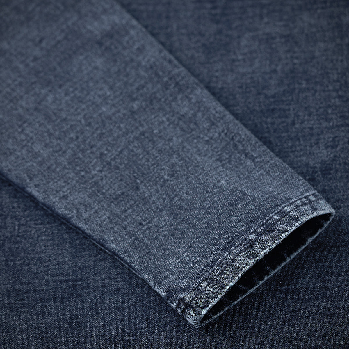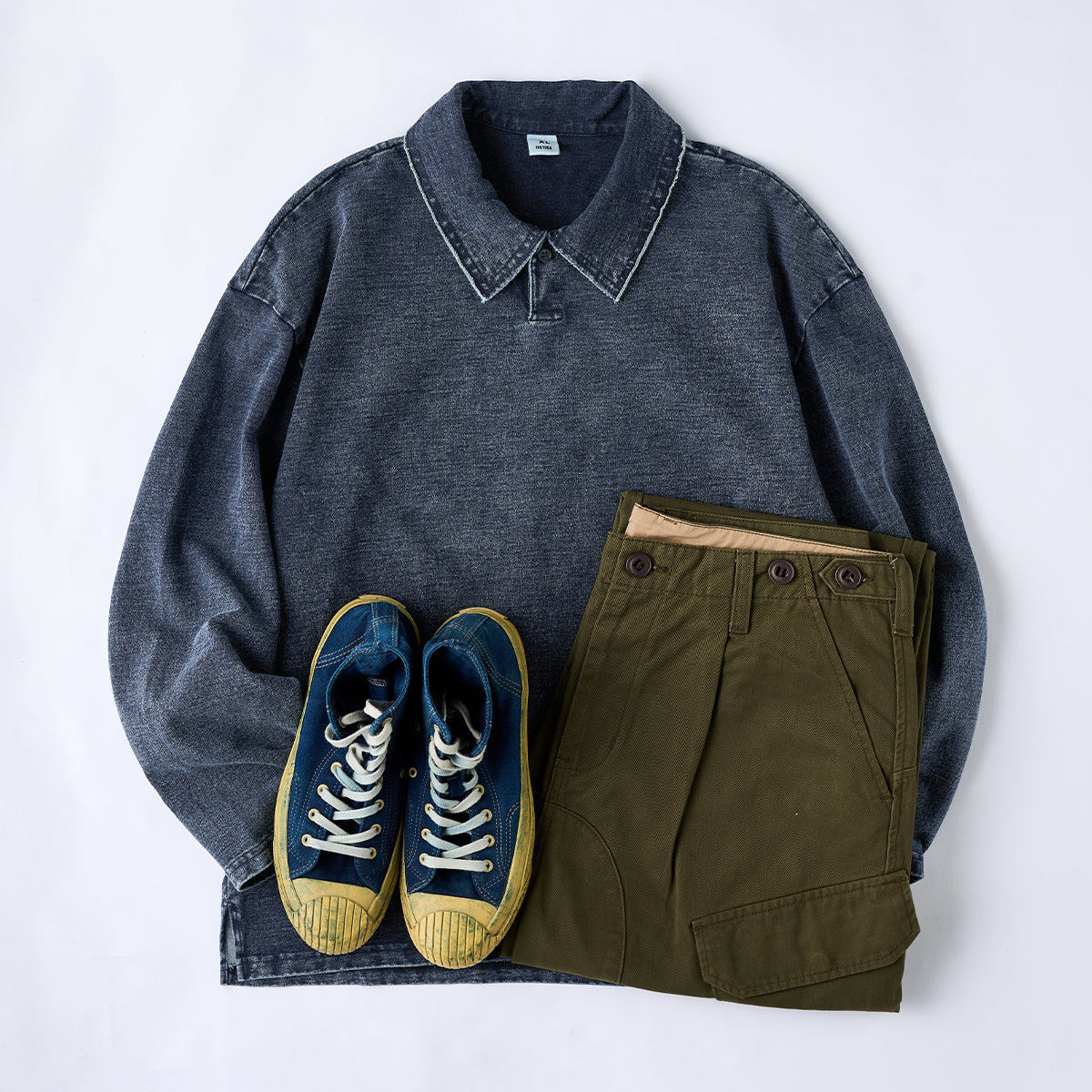 外観はデニムのような雰囲気を持ちながら、表面にはウォッシュド加工が施されており、クタっとした質感と色むらが独特の味を生み出しています。