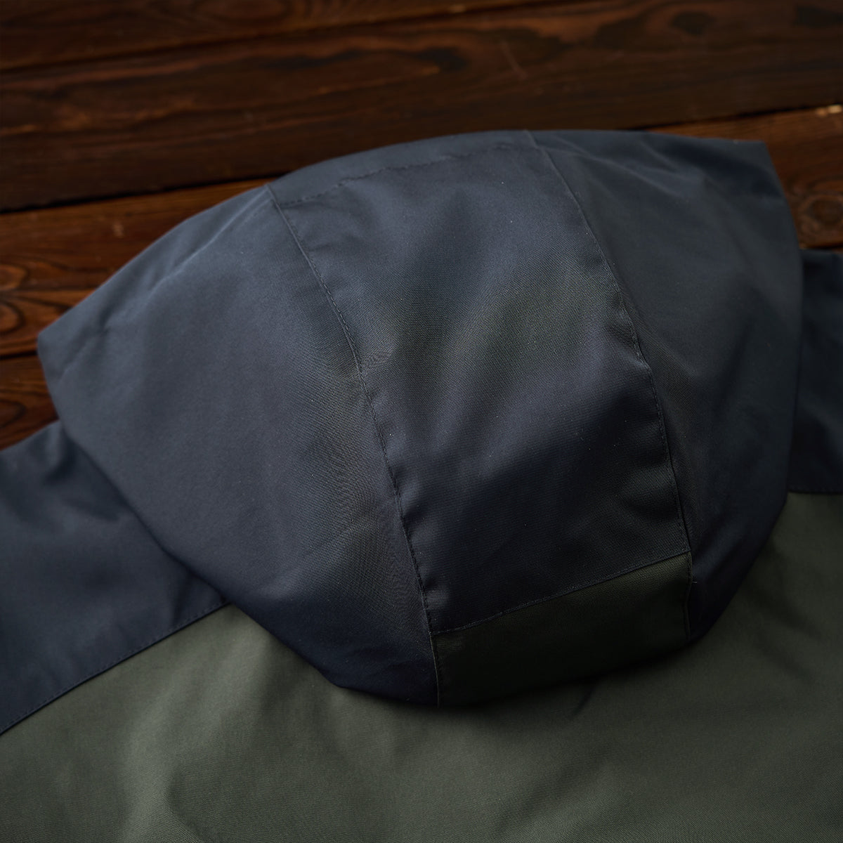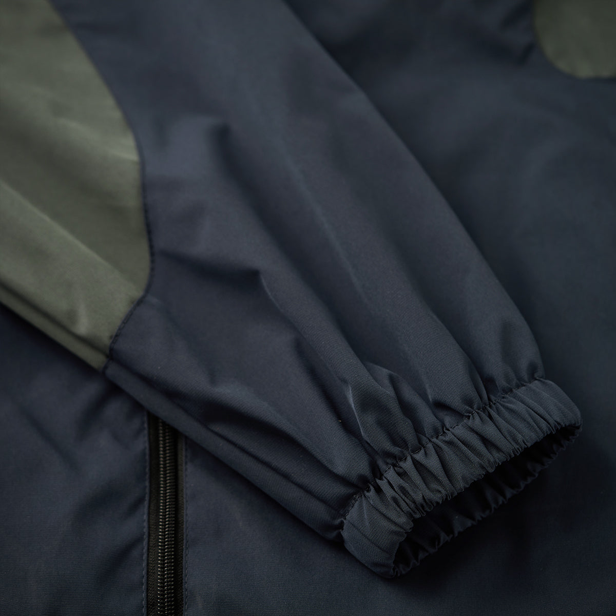 首元は顎下まで立ち上がる襟元とフードが一体化した特徴、袖口にリブを備えて、