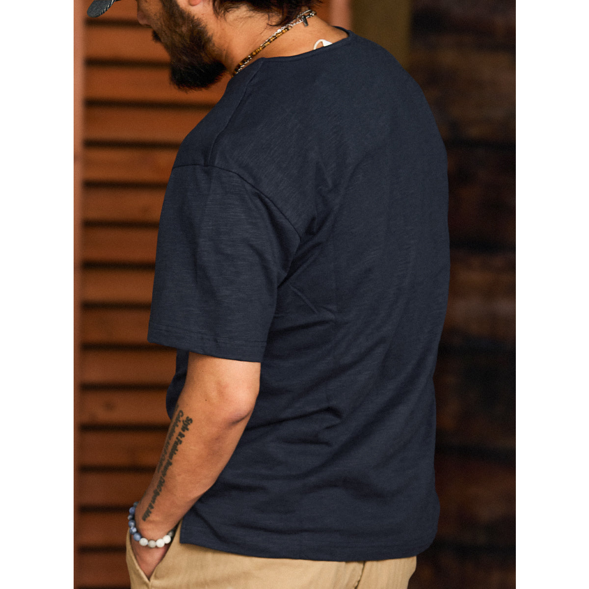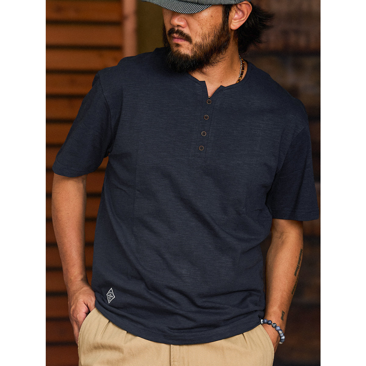 A henley neck T-shirt with a design that creates the charm of an adult man, combining the dressiness of a shirt and the casualness of a cut and sewn shirt. If you open the button and wear it, it will give you a wild and masculine impression. It goes well with military outerwear (army), leather blouson (leather jacket) and denim blouson (G jacket). This item is especially suitable for people with wild, masculine, and rugged atmospheres.