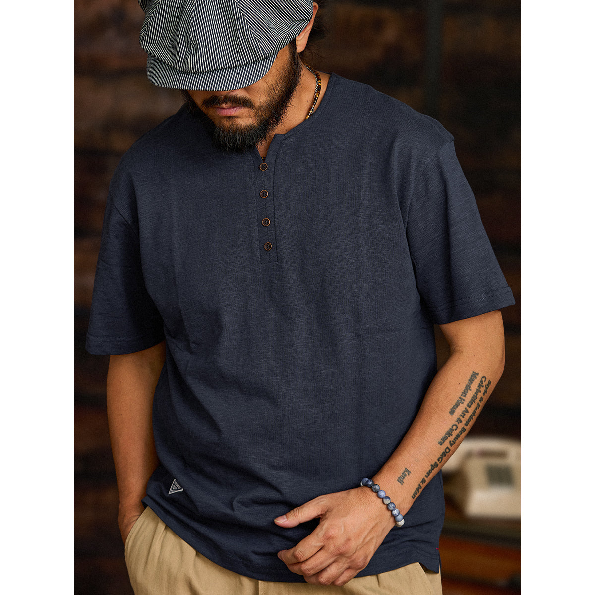 Henley neck T-shirts are perfect for American casual coordination. Even a single T-shirt will look good, but it is especially useful as an inner layer for a vest or shirt! The collar is buttoned, so it doesn't fall apart and doesn't get sloppy.