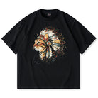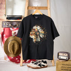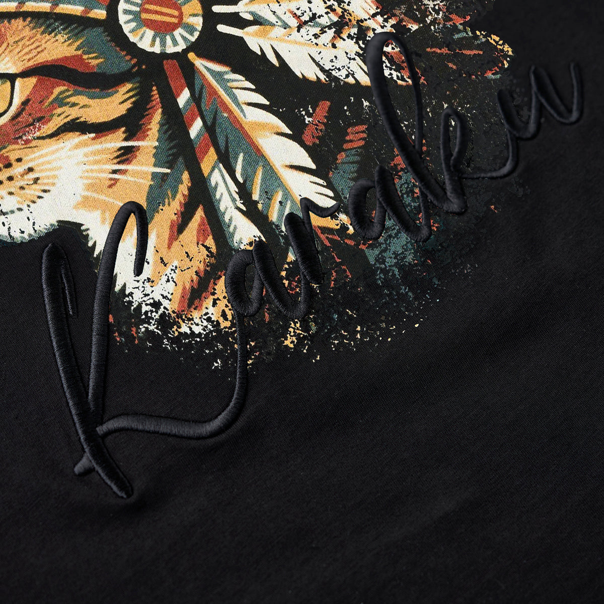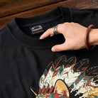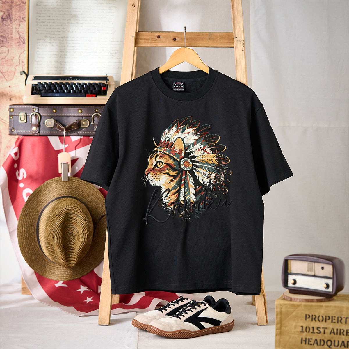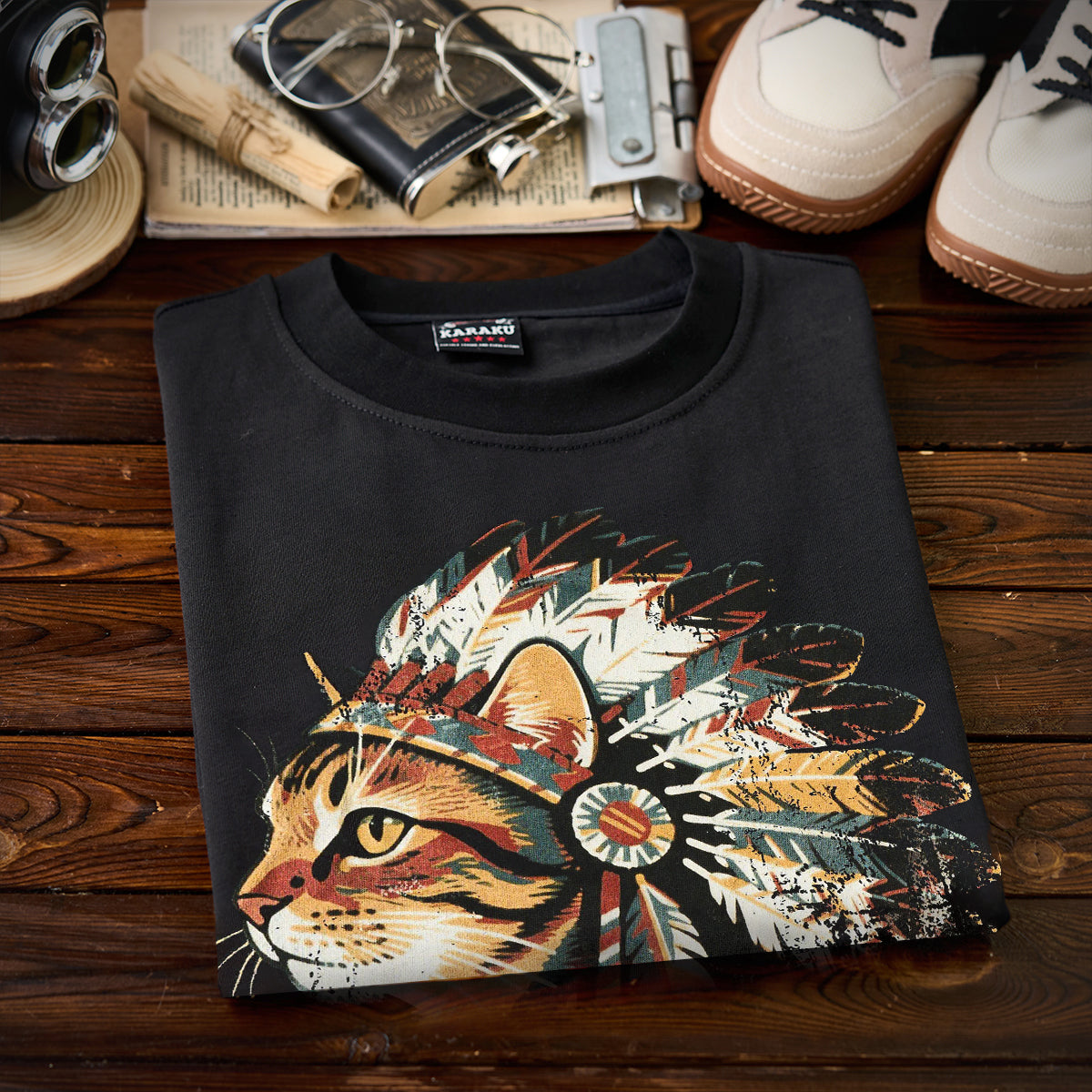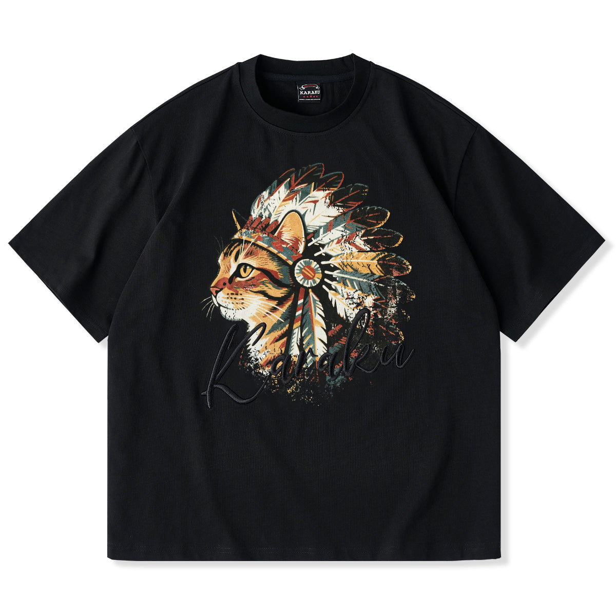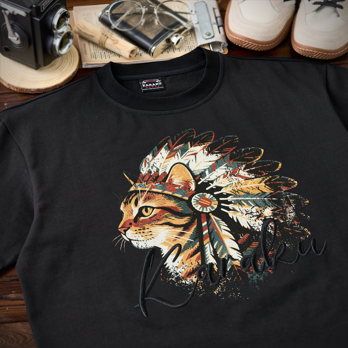 「インディアン酋長猫」プリント&karaku刺繍入りコットンTシャツ