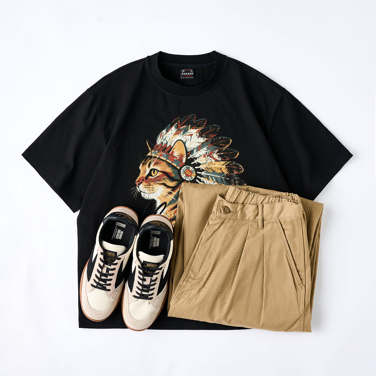 フロントには、インディアンの酋長のような羽飾りをまとった“猫”の大胆なプリント。どこか誇り高くもユーモラスな表情が、見る人の心をくすぐります。プリントの下には「karaku」のロゴ刺繍をあしらい、ブランドらしいこだわりと個性をしっかり主張。程よくゆとりのあるシルエットで、1枚着はもちろん、ジャケットのインナーとしても映える仕上がり。ユーモアとアートを兼ね備えた、karakuらしい遊び心満載のTシャツ。コーディネートの主役にどうぞ。