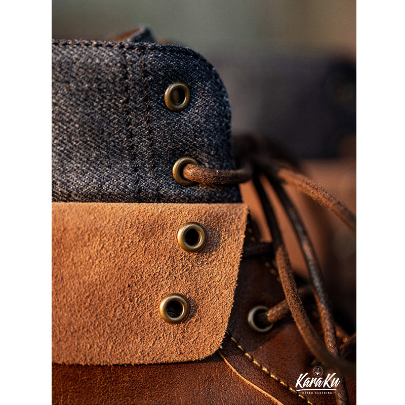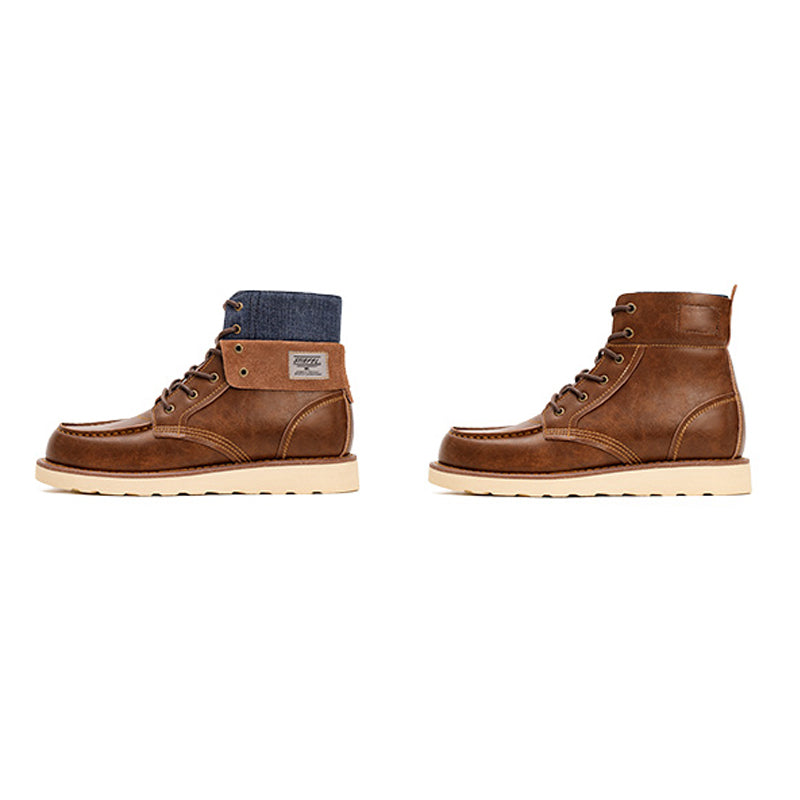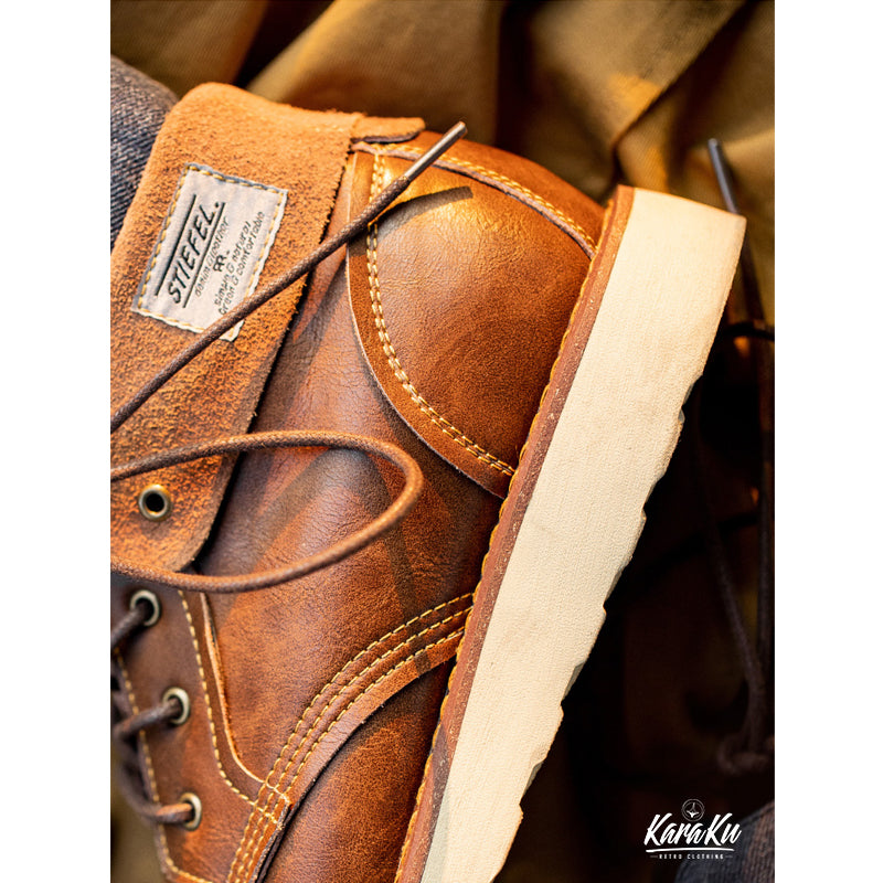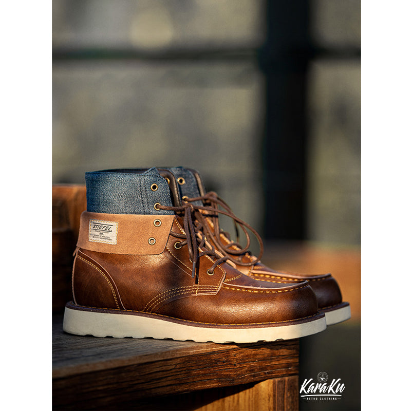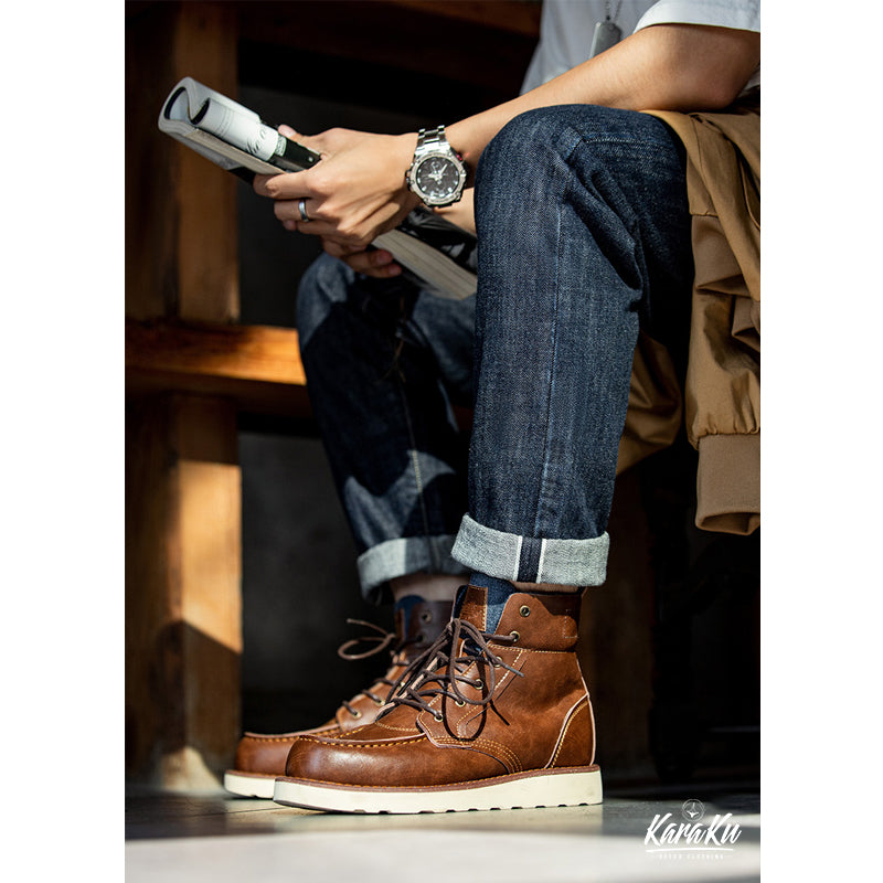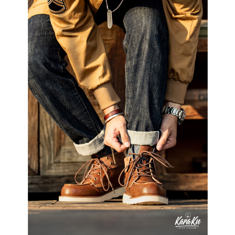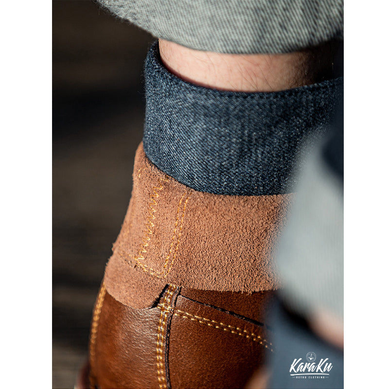 履き口のデニム生地がアクセントで、履き口のレザー部分を折り曲げると、中のデニムが見えてくるので、いつものワークブーツを新鮮な表情にアレンジ。1足で2通りのデザインを楽しめる、その日の気分で違う雰囲気が楽しめる一点です。洗練された美しいフォルムが様々なコーデにマッチしヘビロテ必死ブーツというよりはスニーカー感覚で履ける。アッパーは柔らかく高品質マイクロファイバー革を使用、つま先やアウトソールとの連結をステッチで縫製されたタフな作り、路面からの衝撃を吸収し防滑仕様もあるアウトソール高級感もあり年齢も問わずに履き込めるジーンズなどのアイテムと相性が良く、幅広い使い方ができるアイテムです。シンプルなTシャツ、デニムコーデに合わせるのが最高にオシャレな着こなし。シンプルのワークパンツやシャツと合わせても、オシャレなコーデのポイントになりますので、レトロ風の愛好家たち是非見逃さないでください。