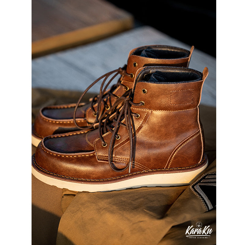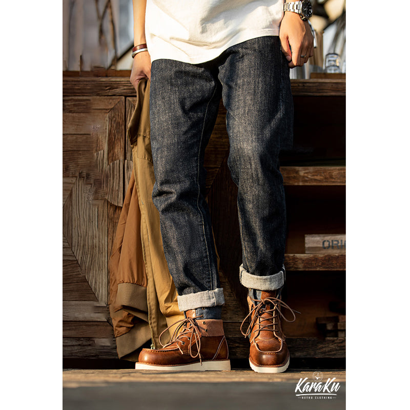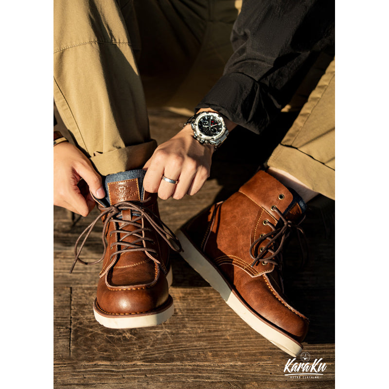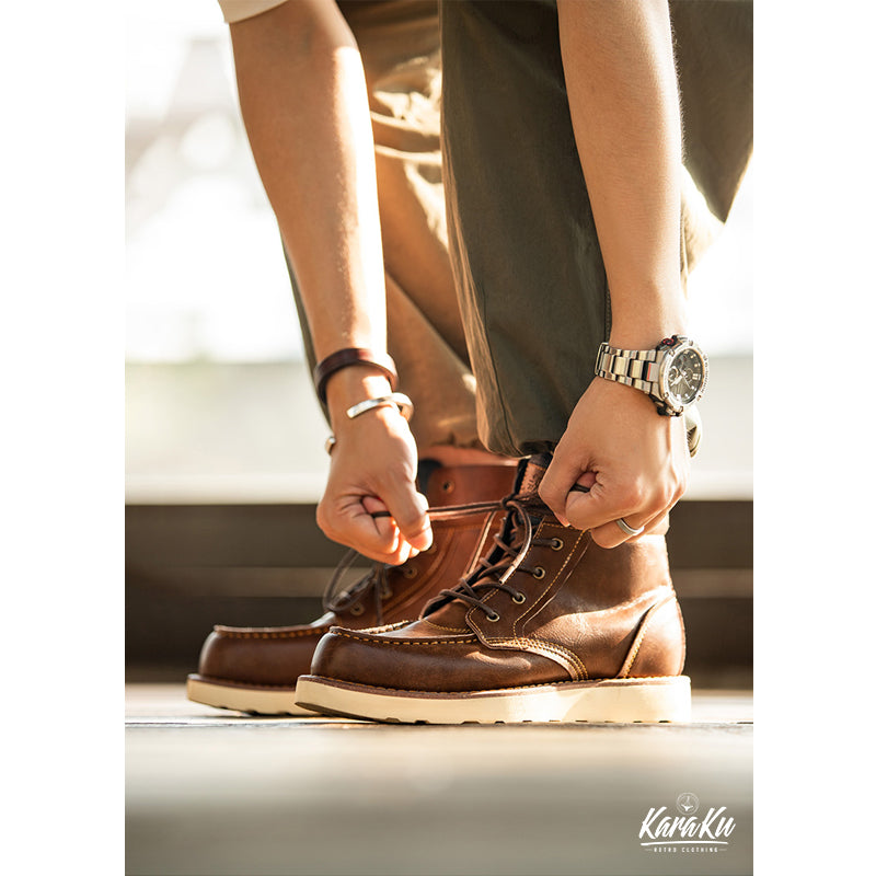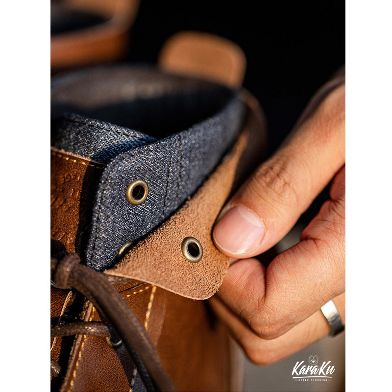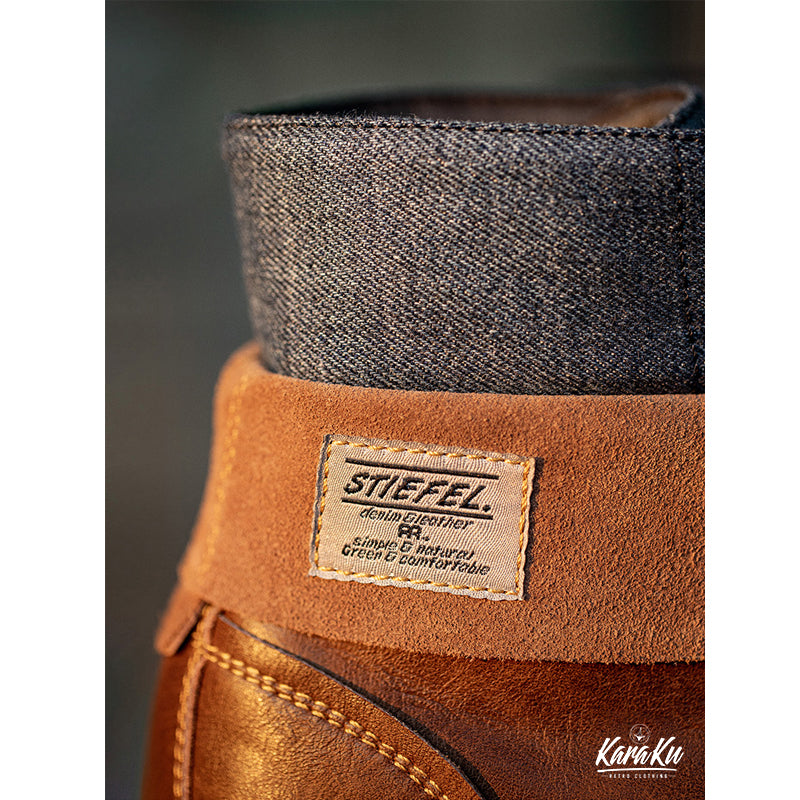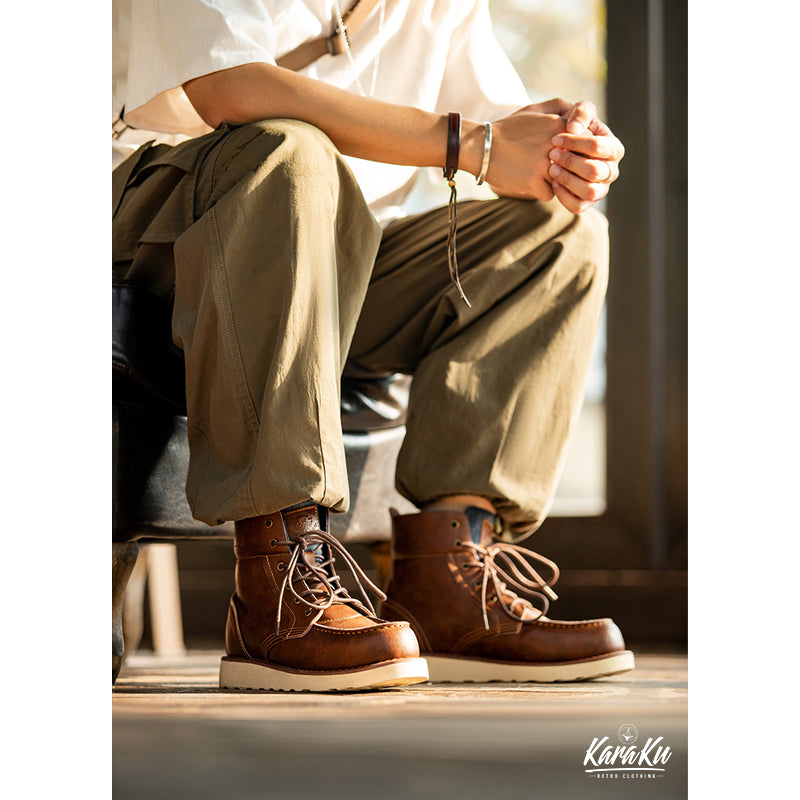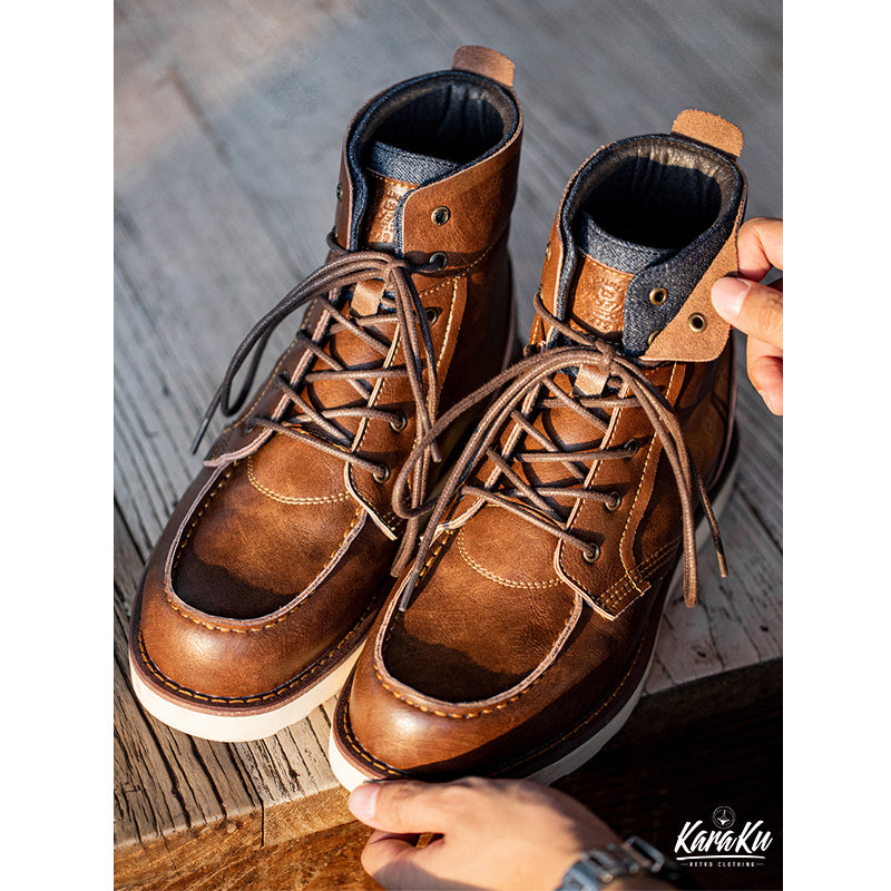 履き口のデニム生地がアクセントで、履き口のレザー部分を折り曲げると、中のデニムが見えてくるので、いつものワークブーツを新鮮な表情にアレンジ。1足で2通りのデザインを楽しめる、その日の気分で違う雰囲気が楽しめる一点です。洗練された美しいフォルムが様々なコーデにマッチしヘビロテ必死ブーツというよりはスニーカー感覚で履ける。アッパーは柔らかく高品質マイクロファイバー革を使用、つま先やアウトソールとの連結をステッチで縫製されたタフな作り、路面からの衝撃を吸収し防滑仕様もあるアウトソール高級感もあり年齢も問わずに履き込めるジーンズなどのアイテムと相性が良く、幅広い使い方ができるアイテムです。シンプルなTシャツ、デニムコーデに合わせるのが最高にオシャレな着こなし。シンプルのワークパンツやシャツと合わせても、オシャレなコーデのポイントになりますので、レトロ風の愛好家たち是非見逃さないでください。