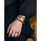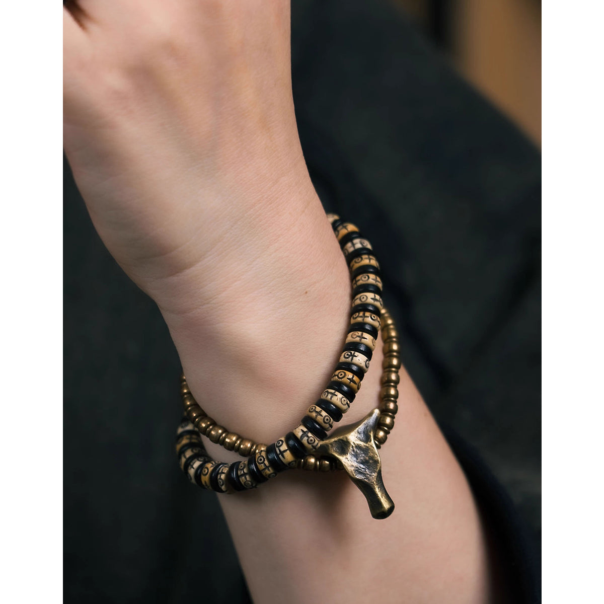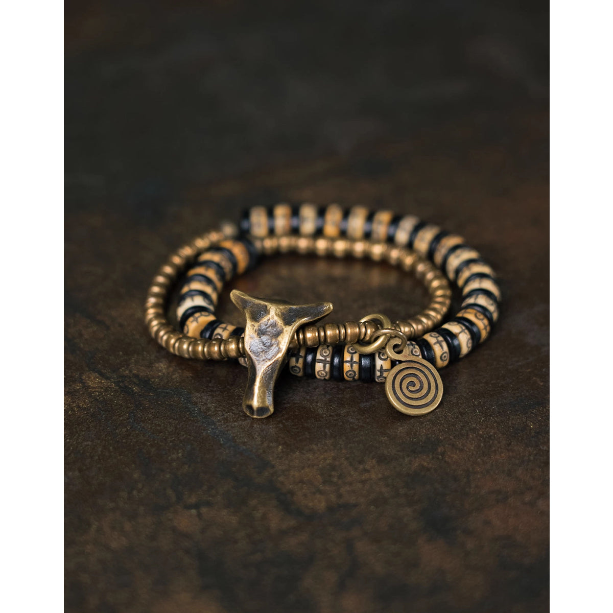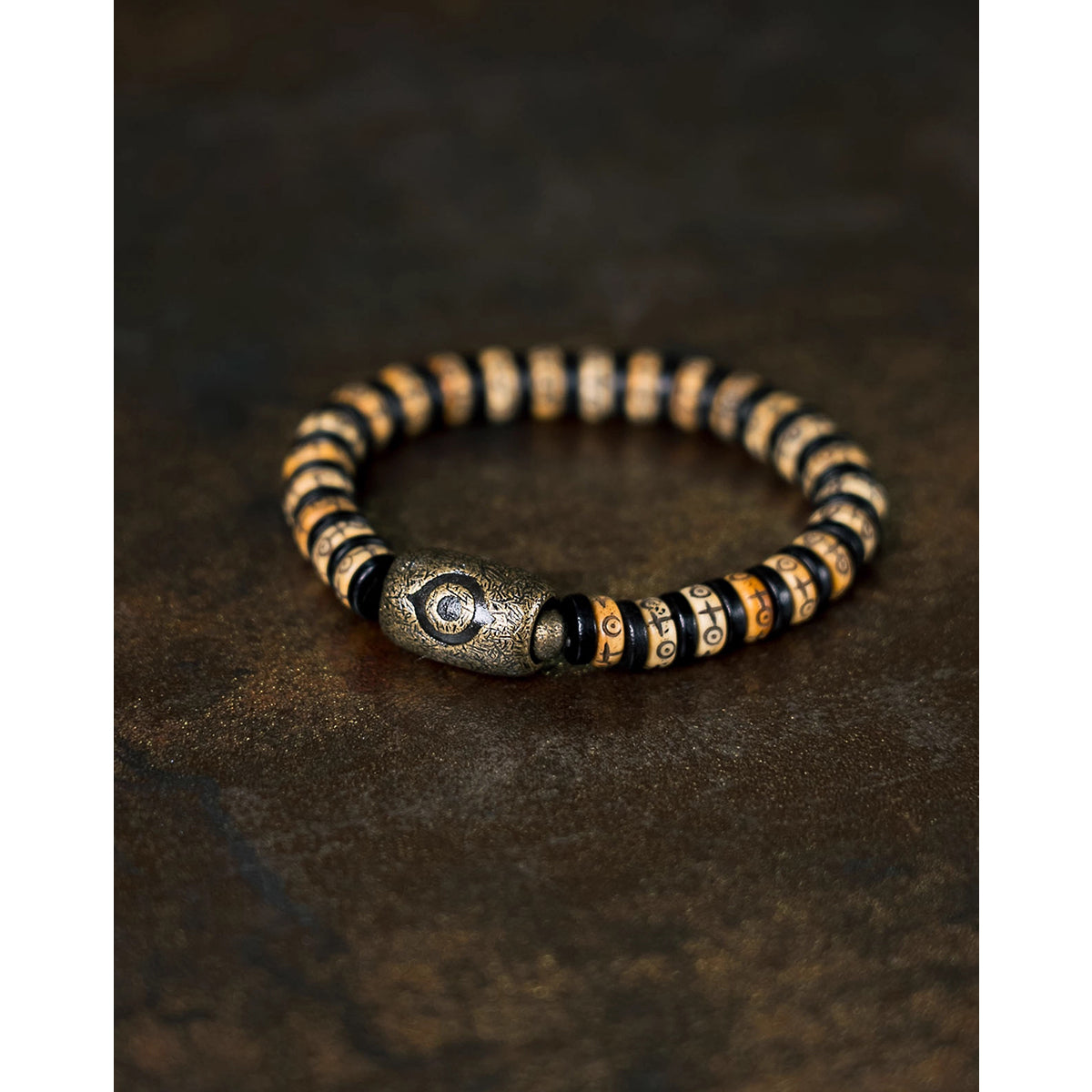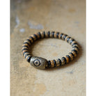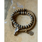 重厚感のある黒檀ビーズに、経年で深みを増す真鍮パーツと温かみのあるカウボーンビーズを組み合わせたブレスレット。異素材が織りなすコントラストは、ナチュラルでありながら存在感を放ち、スタイルに大人の落ち着きを添えます。2タイプからお選びいただけるデザインで、シンプルな装いのアクセントとしてはもちろん、重ね付けでも個性を引き立てる万能アイテムです。男女別にサイズをご用意し、手首に程よくフィットする着け心地を実現。単体使いはもちろん、時計や他のブレスレットとの重ね着けにも好相性。カジュアルからエスニックまで、幅広いスタイリングに映えるアクセサリーです。