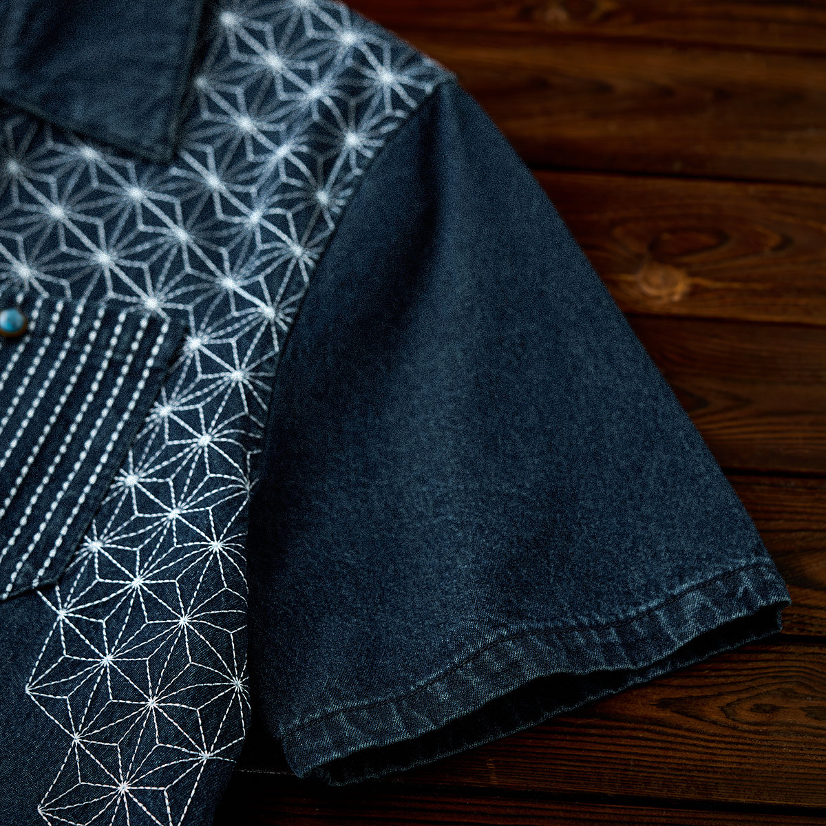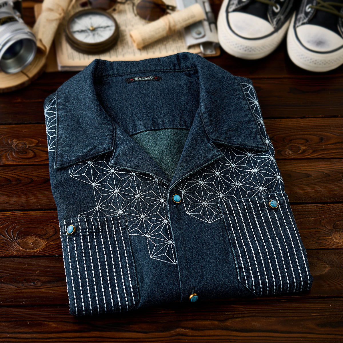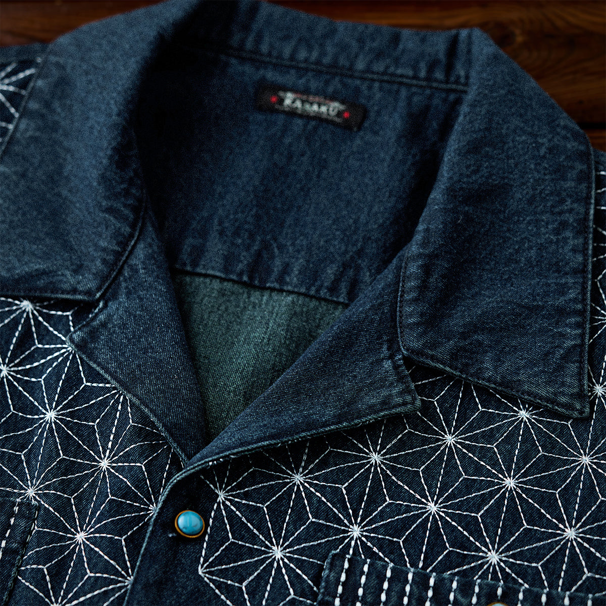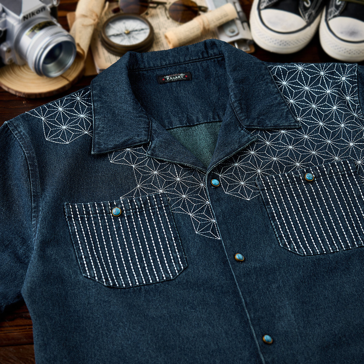 【予約】襟コーデュロイ 裏エスニック柄プリントデニムワークシャツ