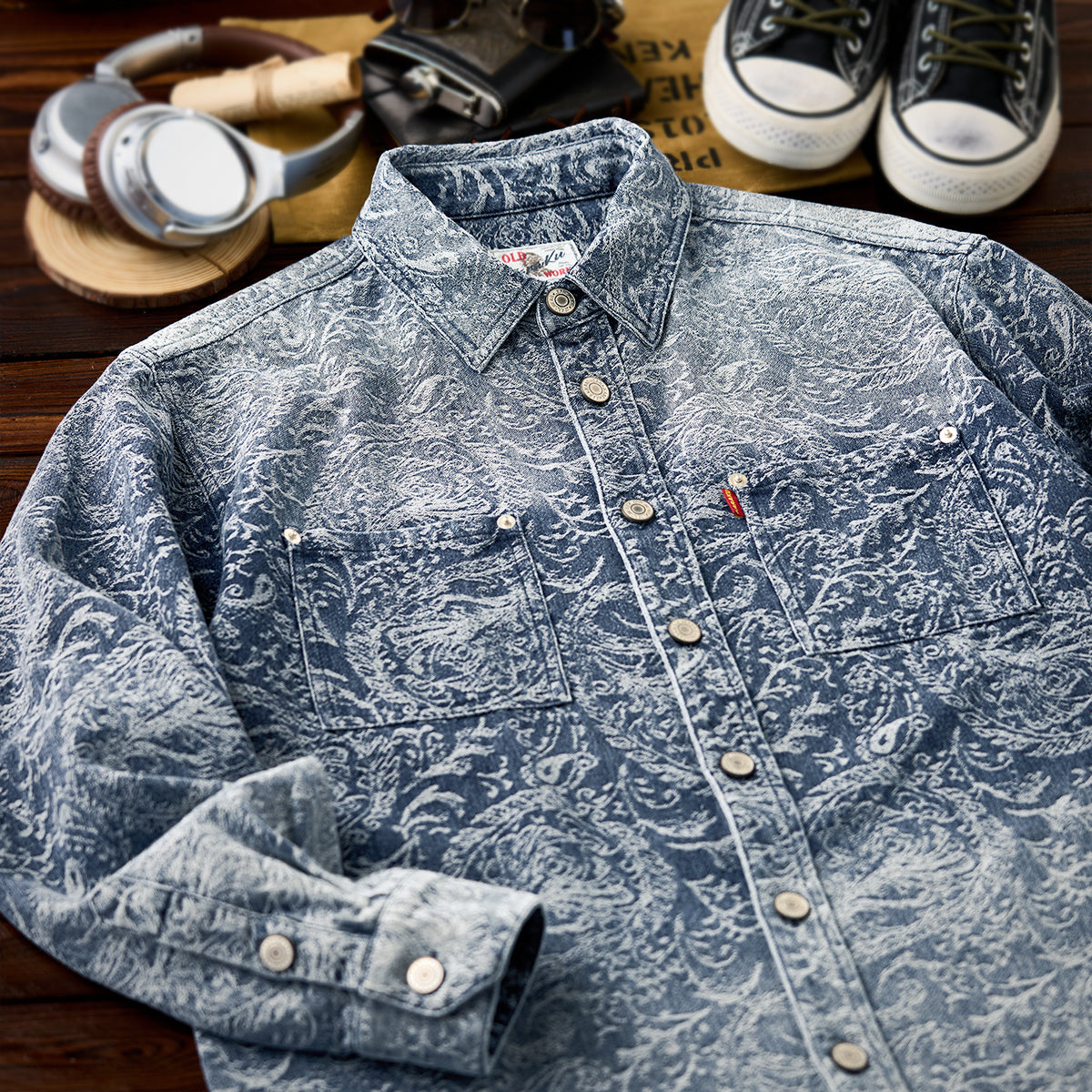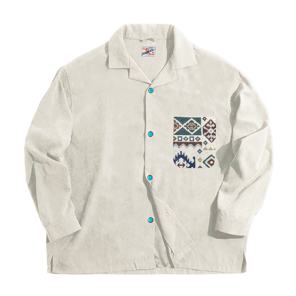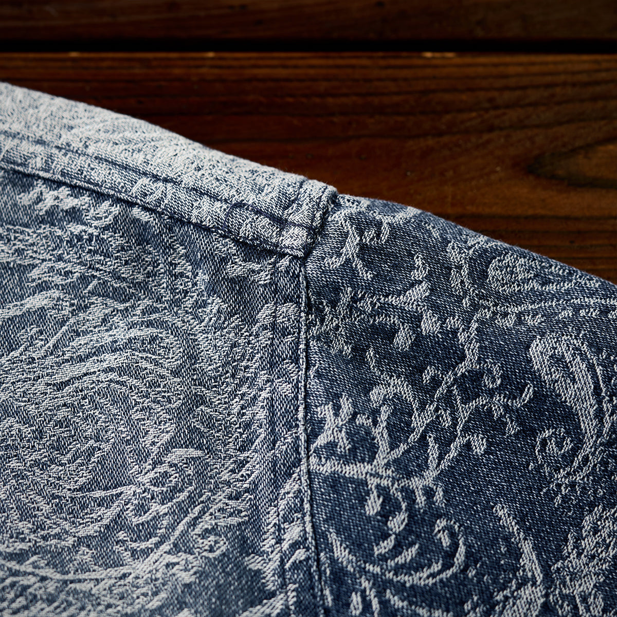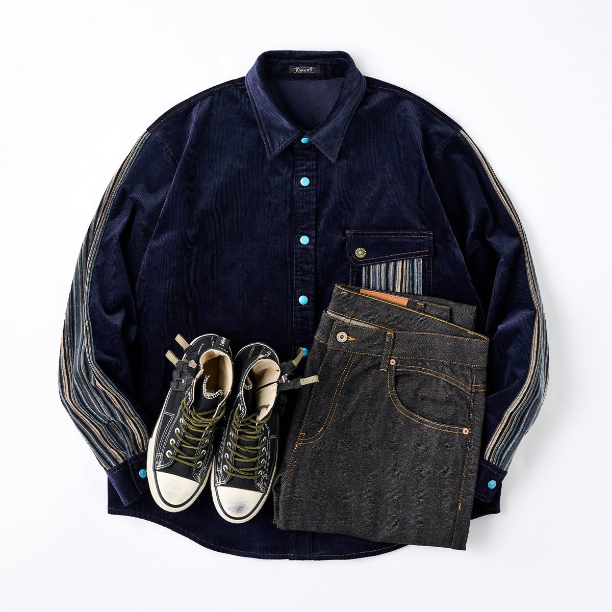 【予約】襟コーデュロイ 裏エスニック柄プリントデニムワークシャツ
