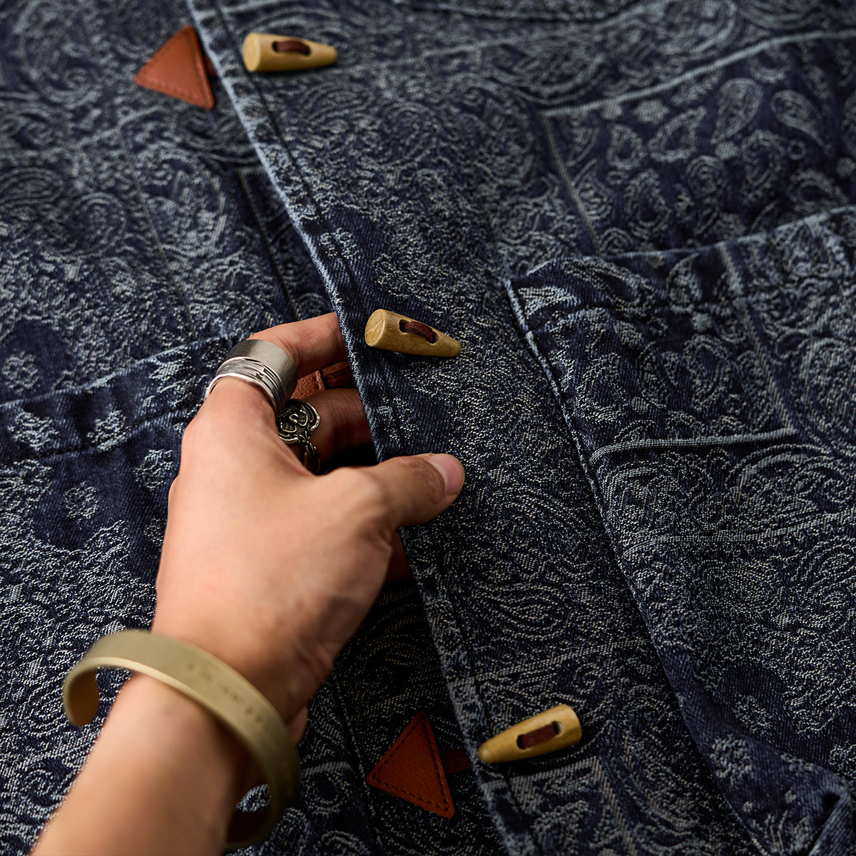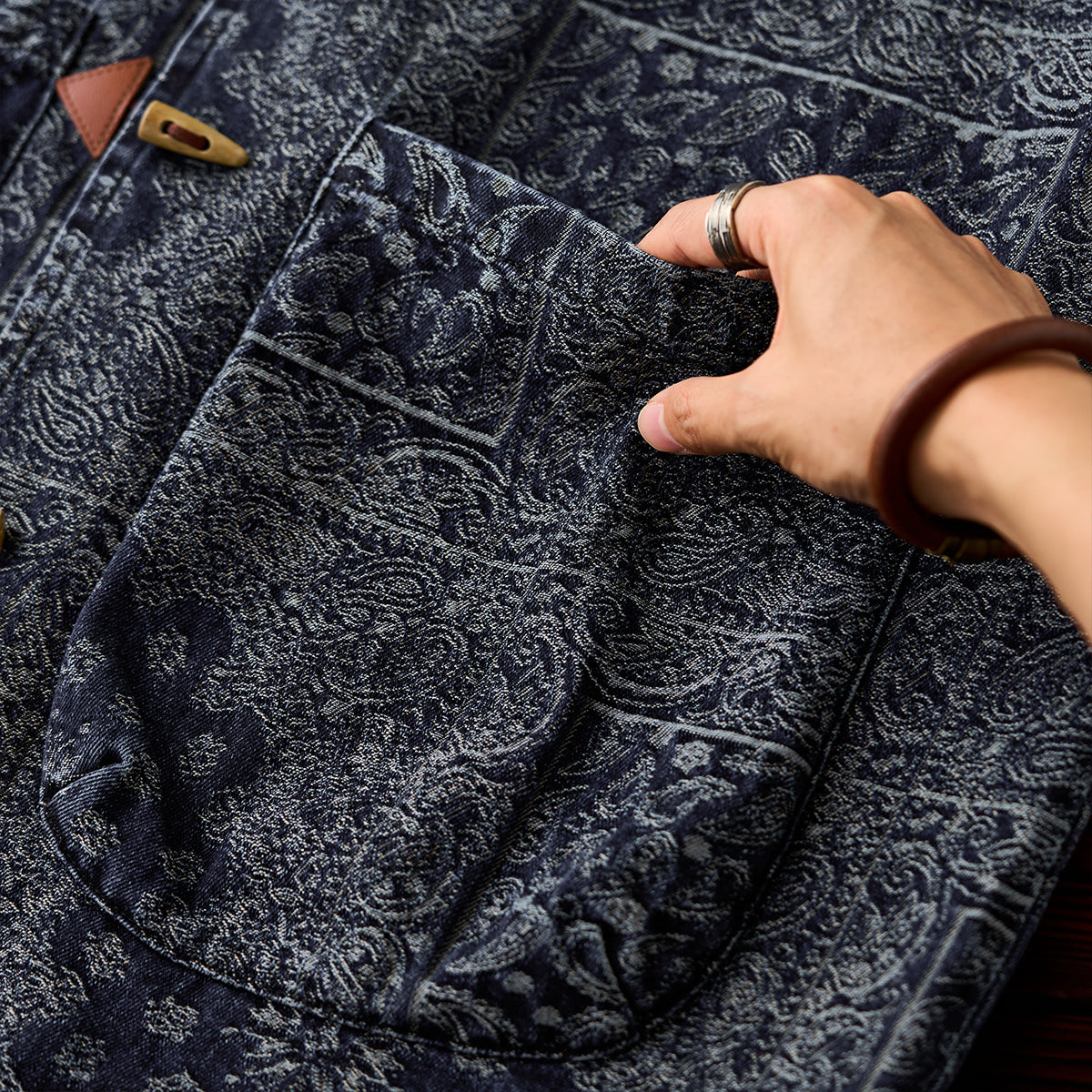 【予約】「Karaku」刺繡ロゴ 裏エスニック調柄フード付きデニムジャケット