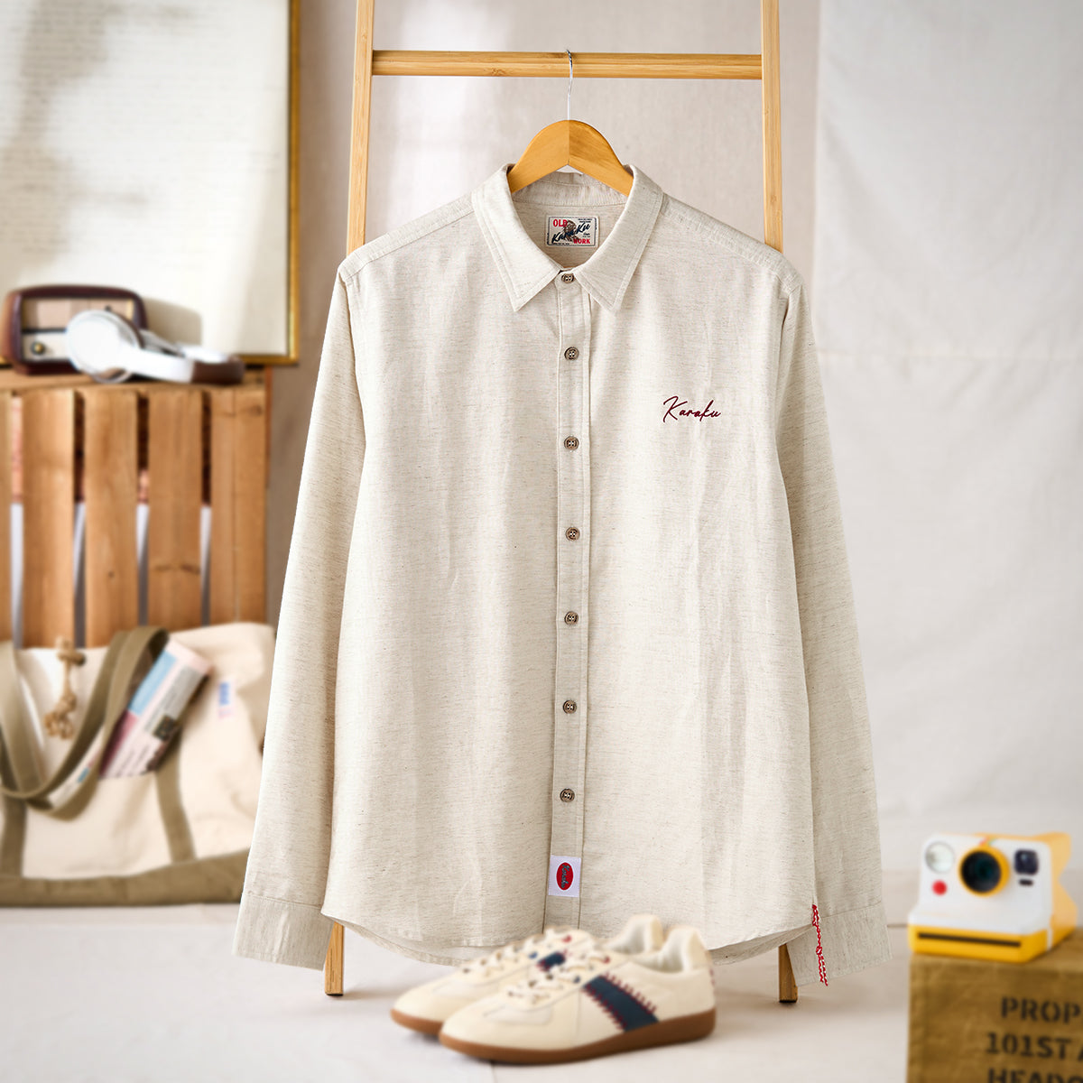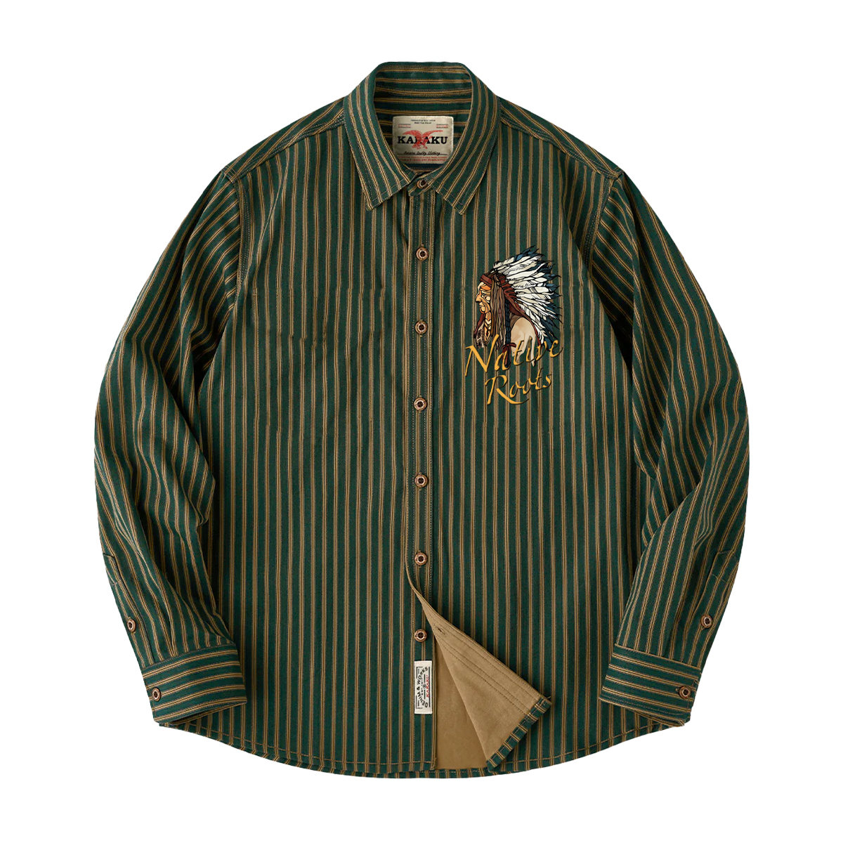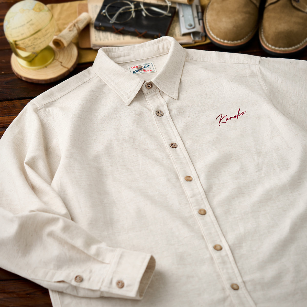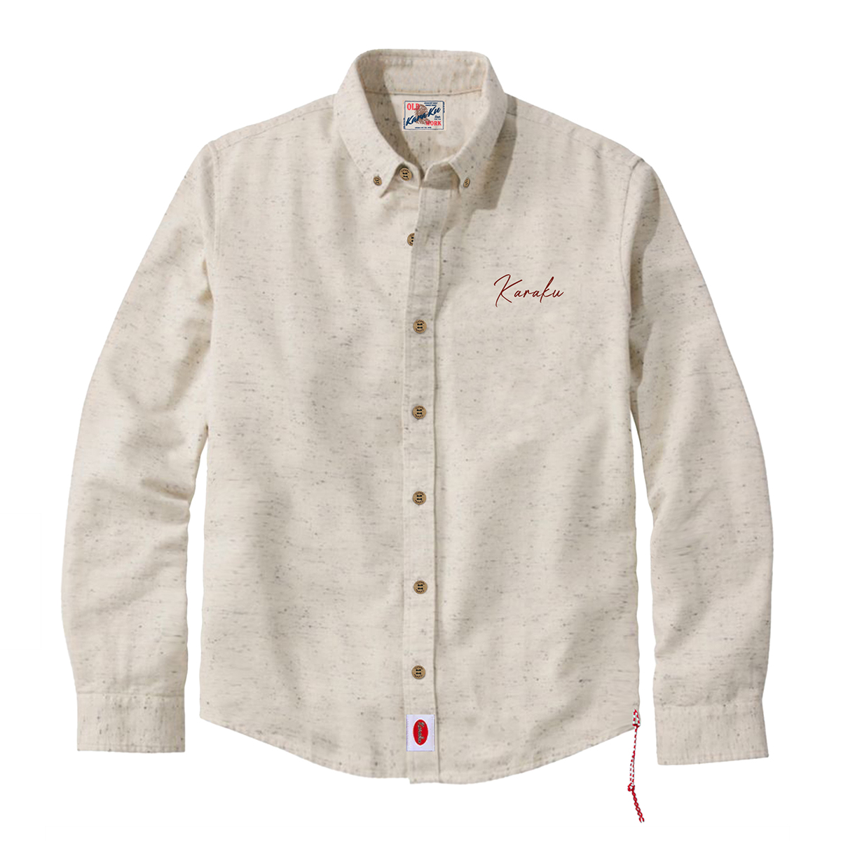 【予約】紅白ヒモ付き 「Karaku」刺繡ロゴ 先染めストライプ長袖シャツ