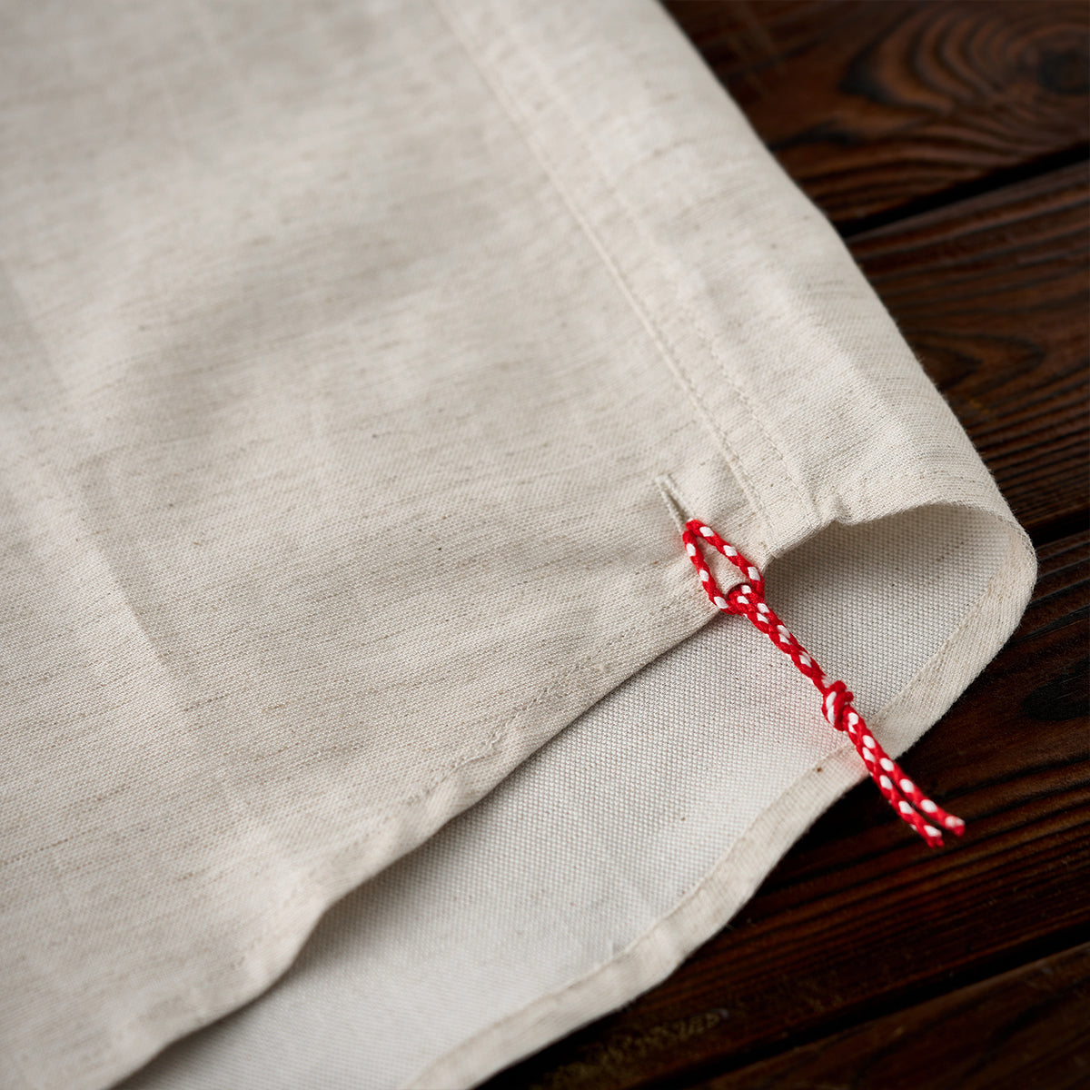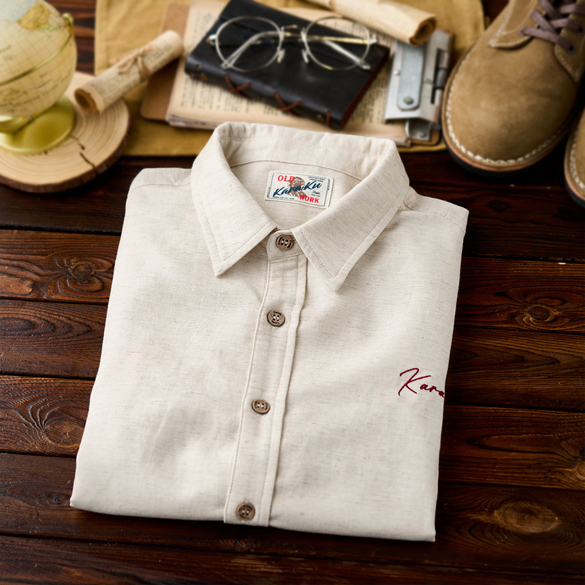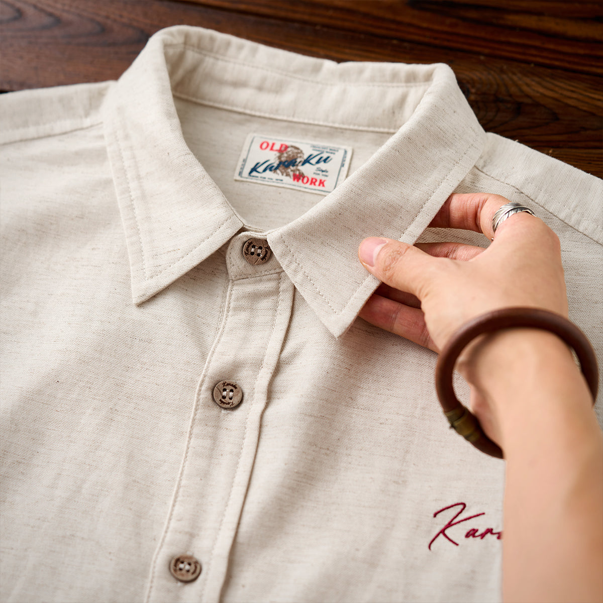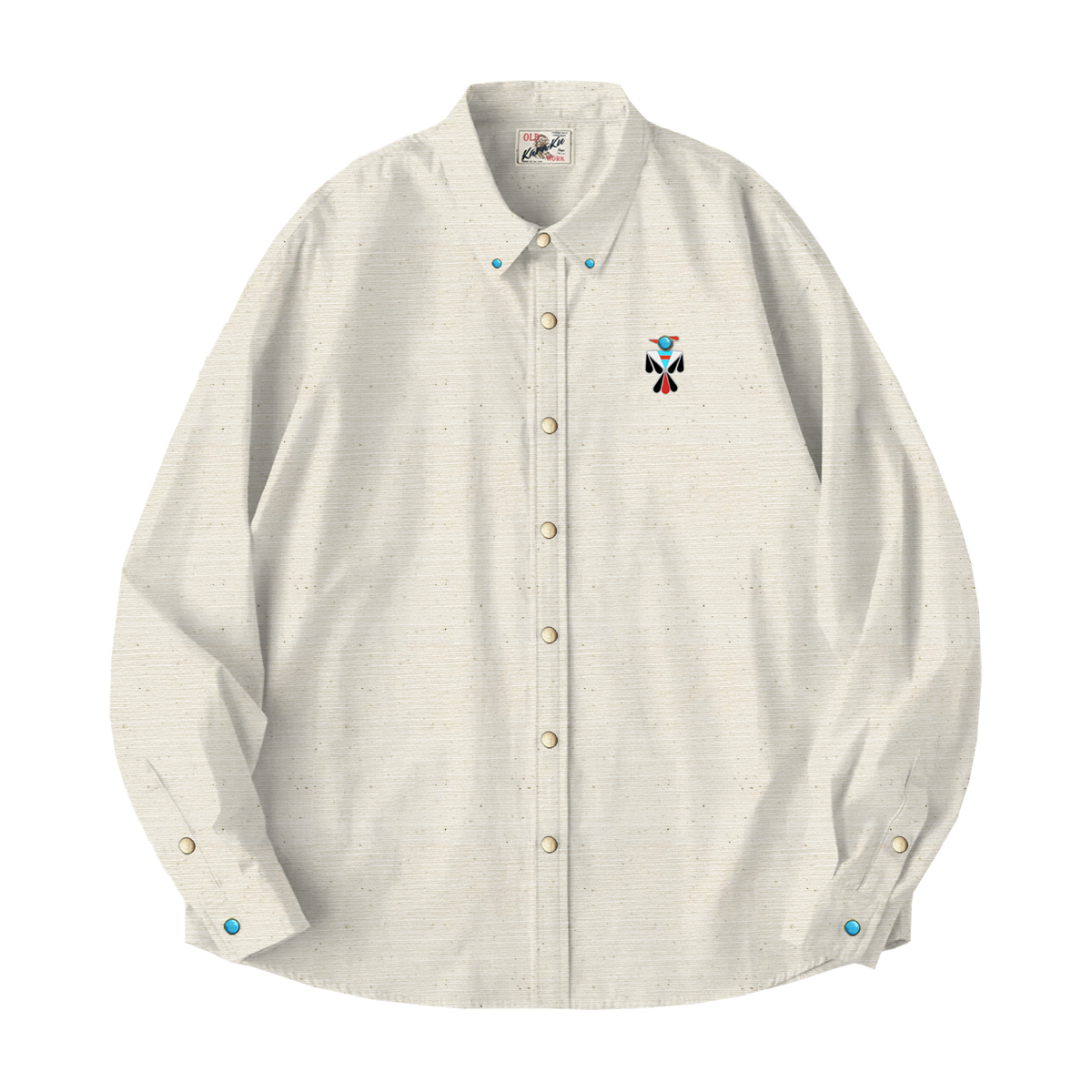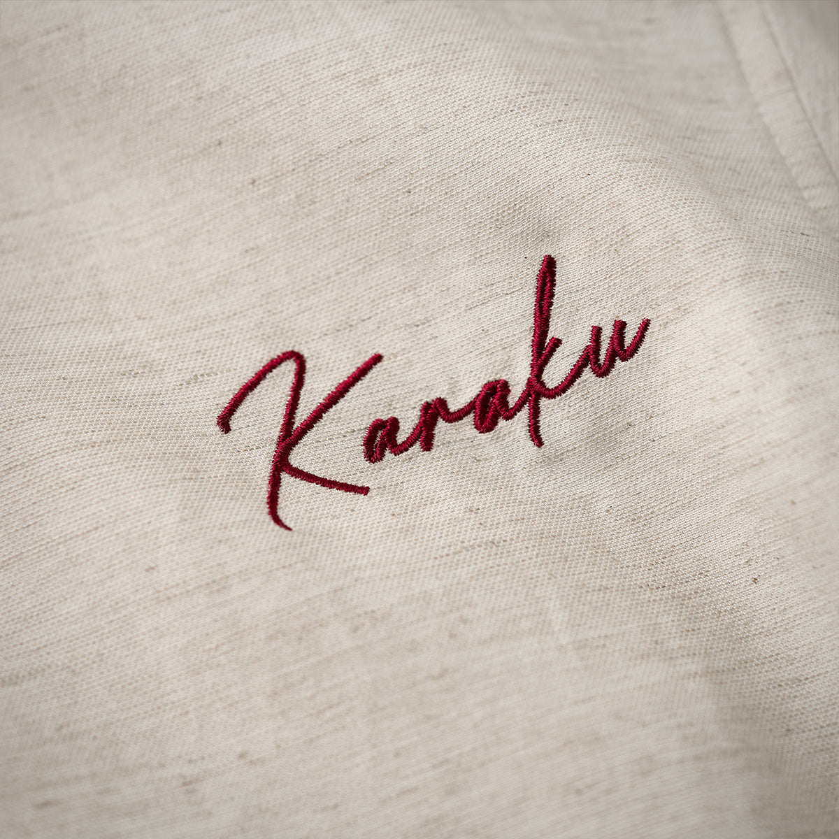 【予約】紅白ヒモ付き 「Karaku」刺繡ロゴ 先染めストライプ長袖シャツ