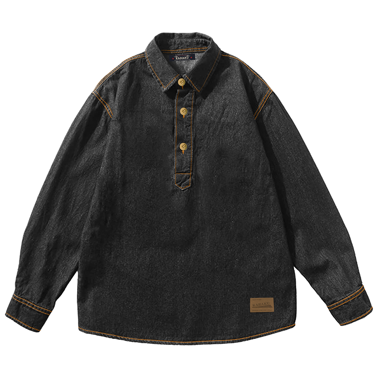 【予約】肘パッチ入り ハーフボタン付きストライプ柄デニムプルオーバーシャツ
