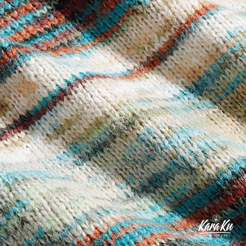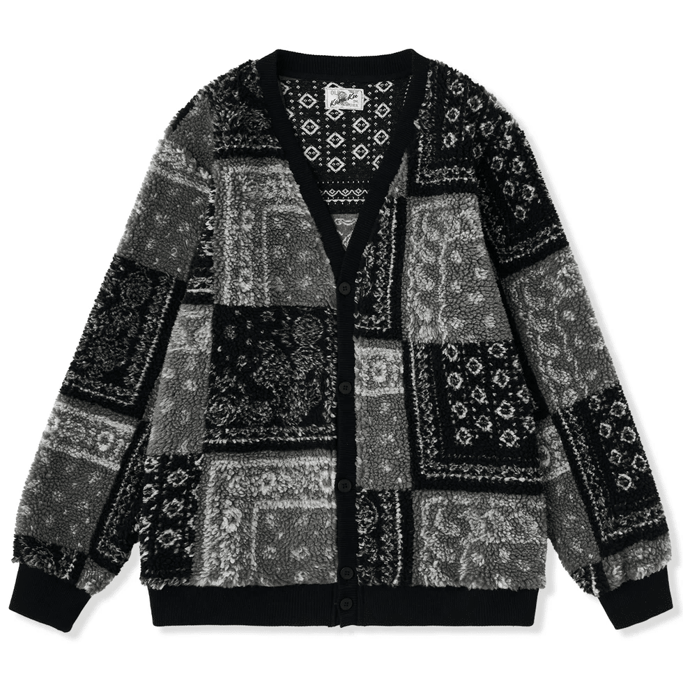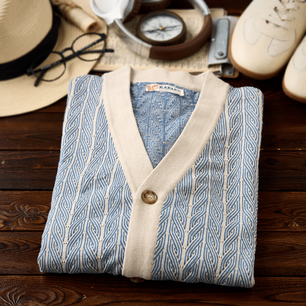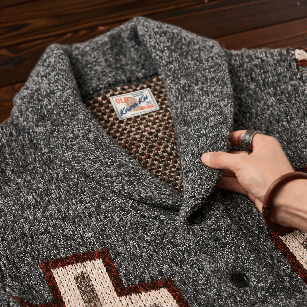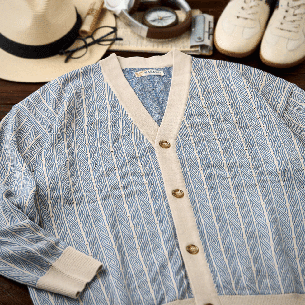 カーディガン全体に、ペイズリー模様や幾何学的な模様がジャガード織り込まれ、テクスチャーの深みを感じさせる。ペイズリーは古代からの模様で、曲線的な形や植物的なモチーフが特徴。