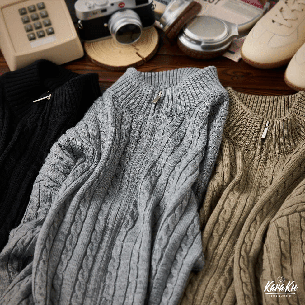 リブ編みの襟、袖口や裾が、全体のバランスを整えつつ、フィット感を持たせ、ゆったりとしたデザインで、動きやすさを重視。