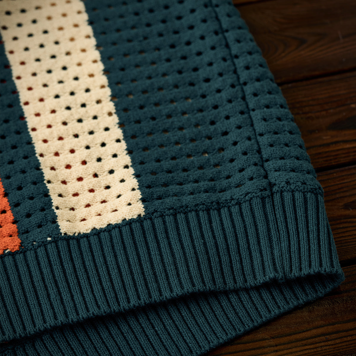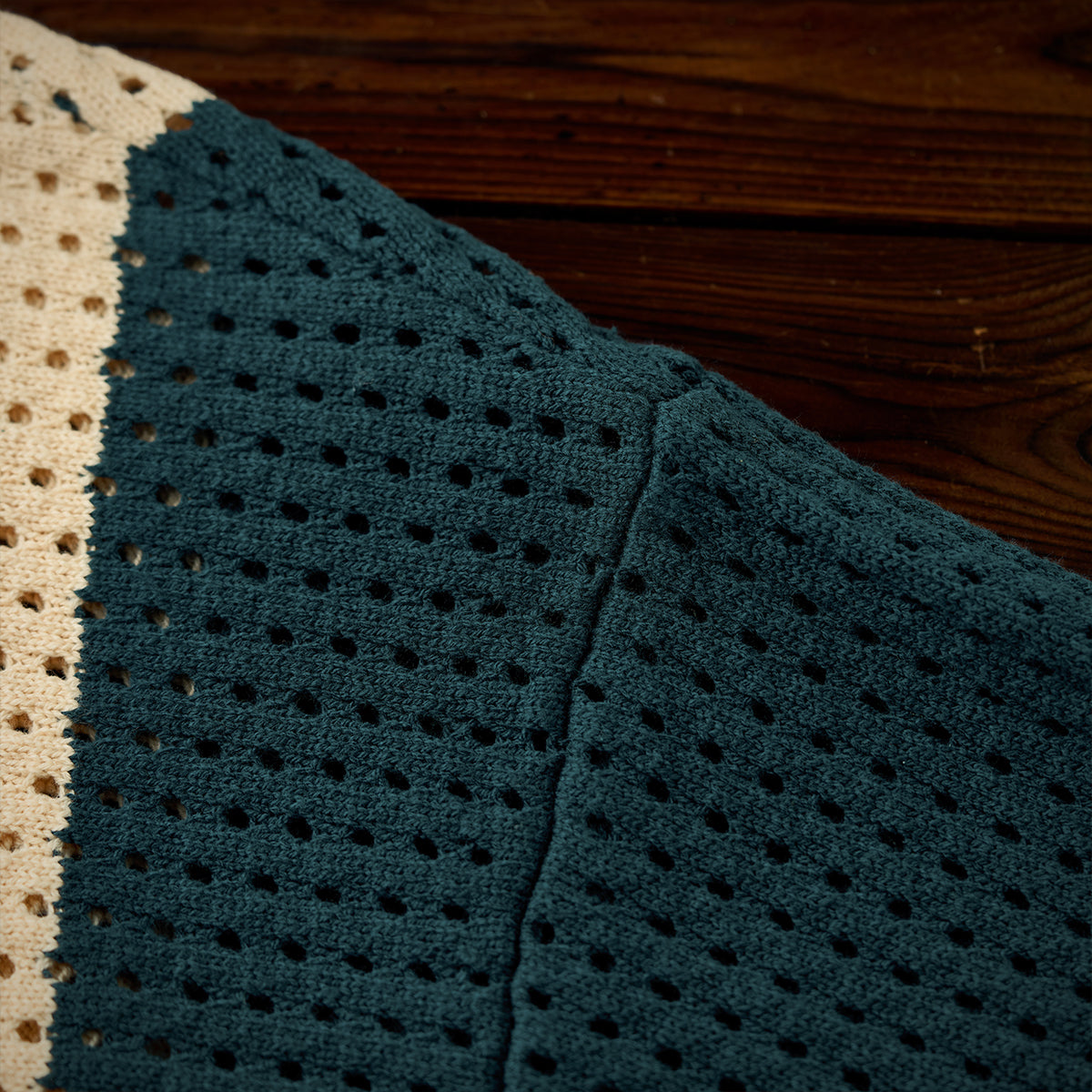全体に透かし模様が施され、軽やかさと通気性を強調しています。袖部分や裾のリブ編みが全体のシルエットを引き締めています。