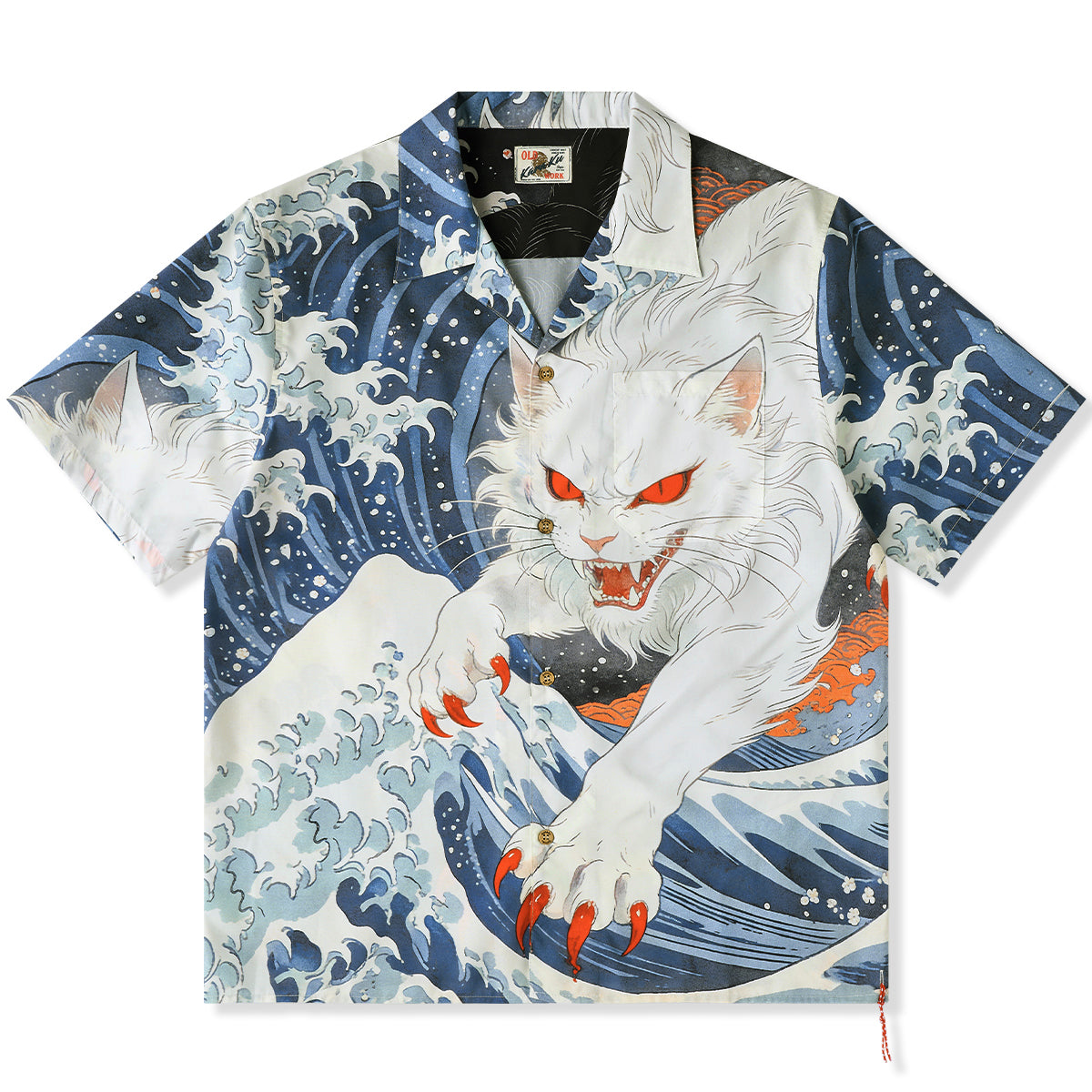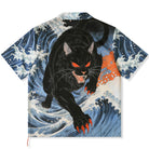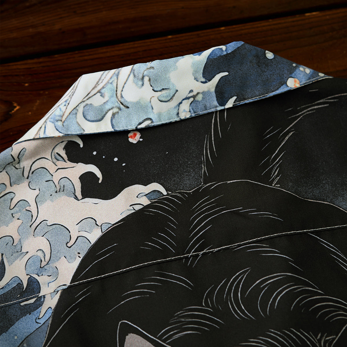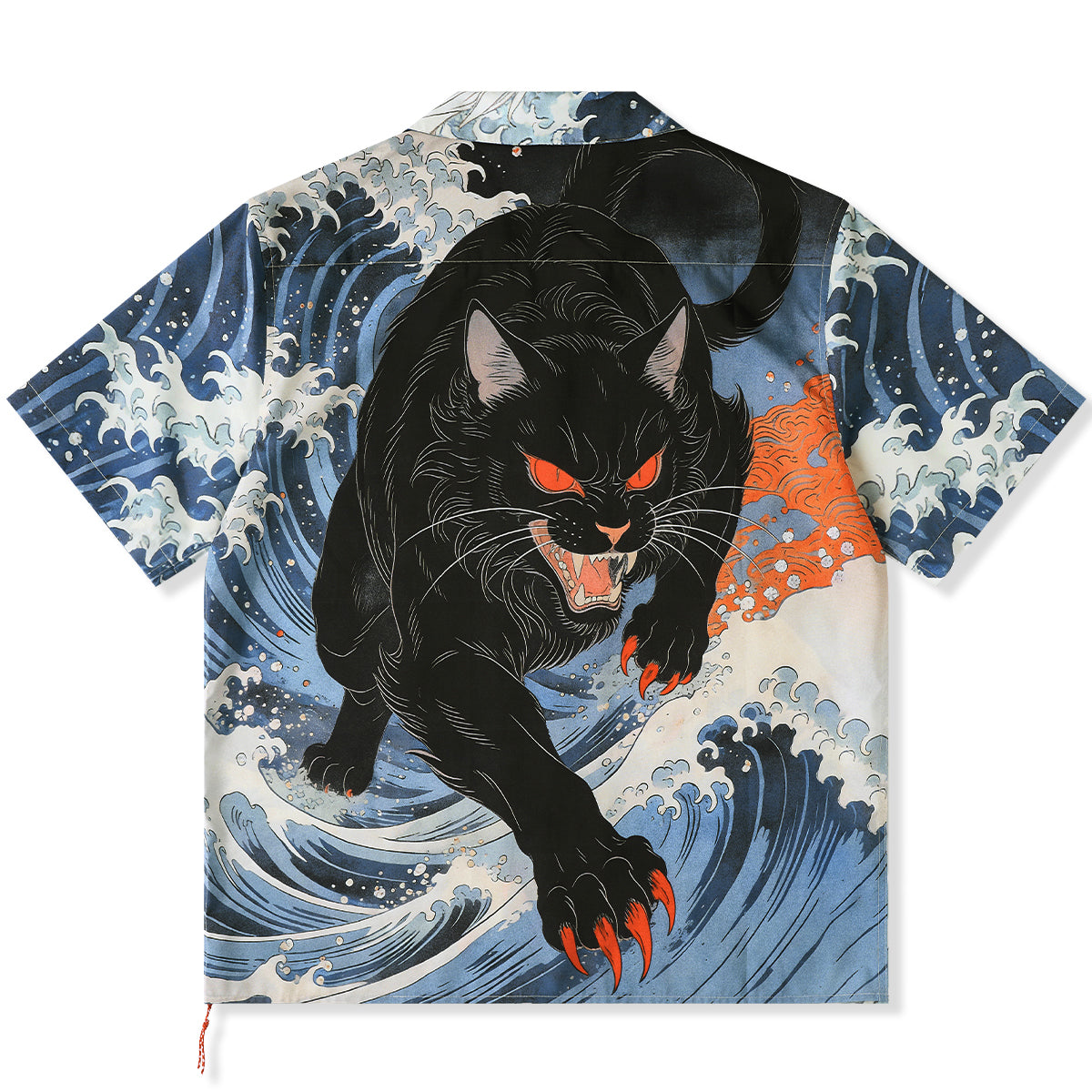 「沖浪裏・踏波化け猫」前後アシンメトリープリントオープンカラーシャツ