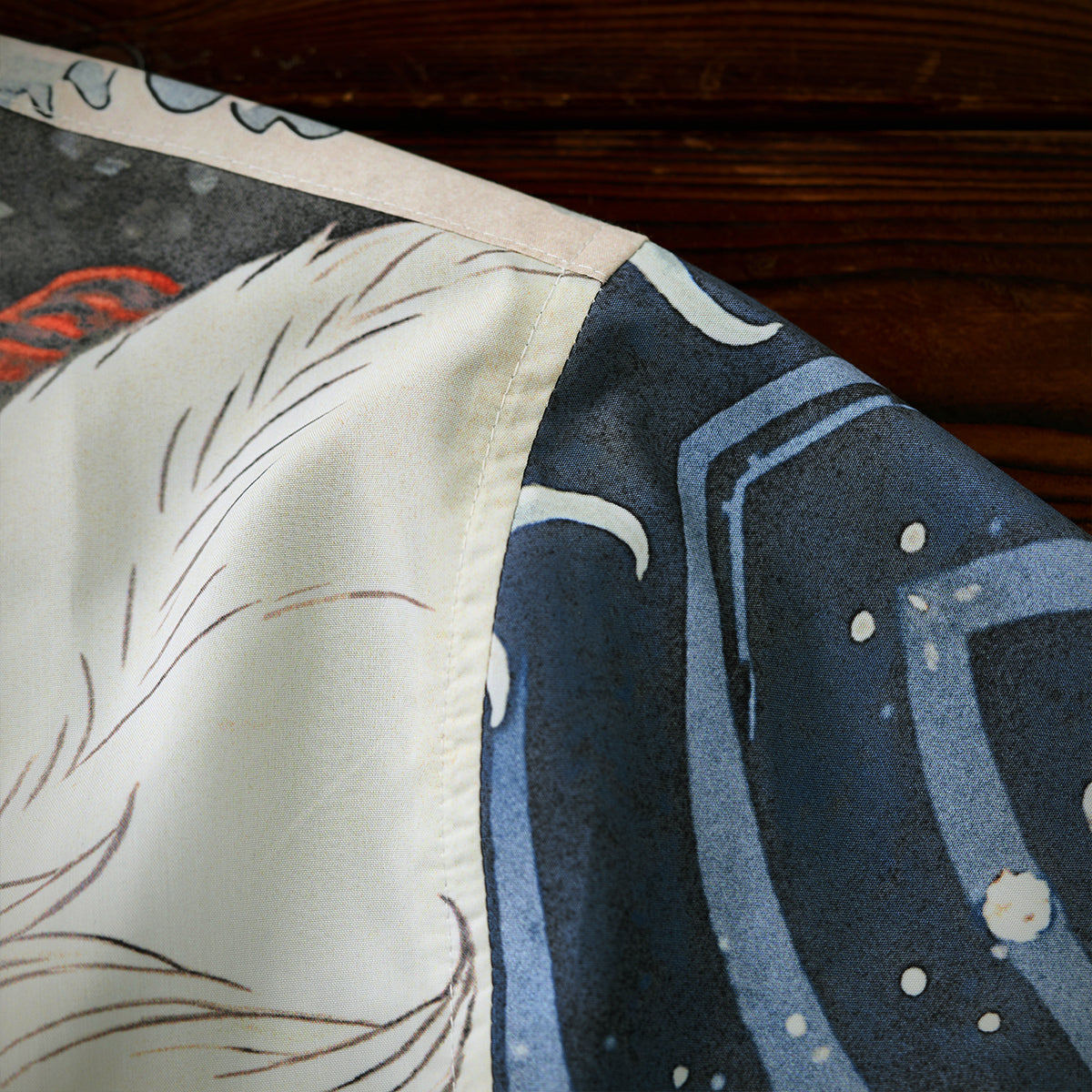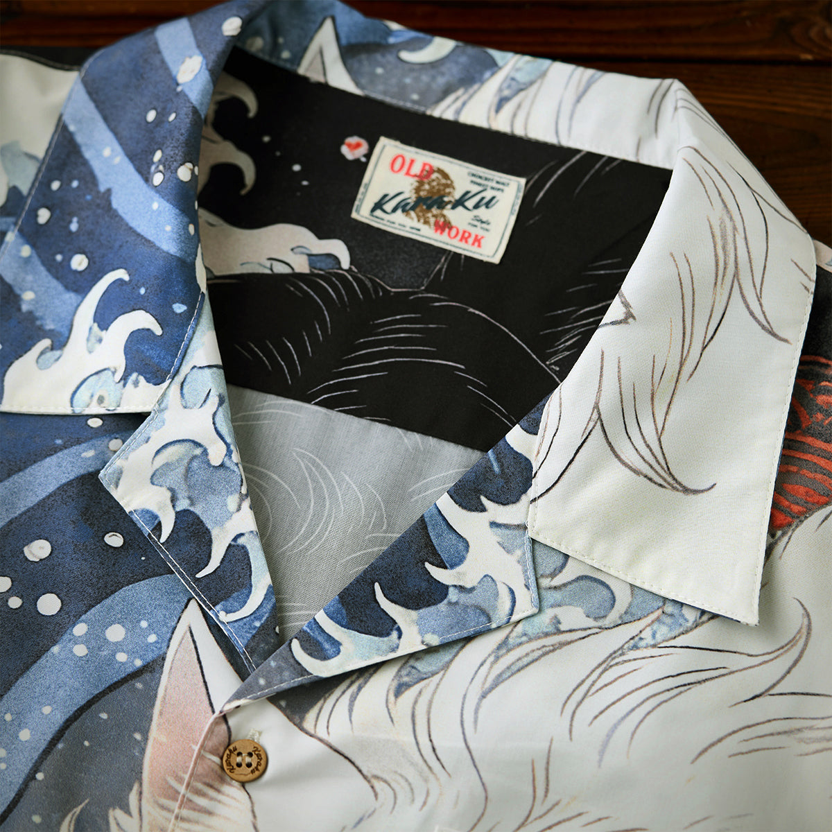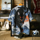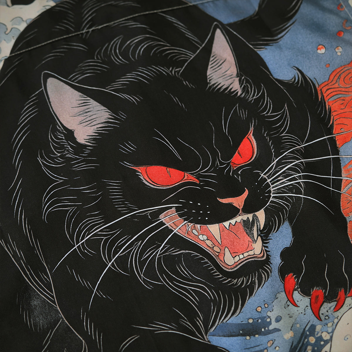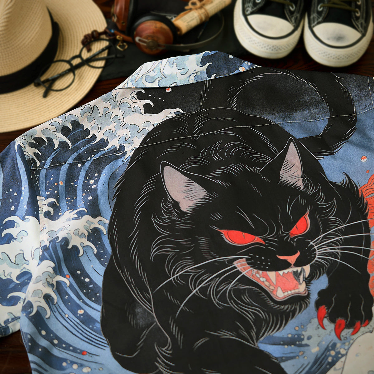 「沖浪裏・踏波化け猫」前後アシンメトリープリントオープンカラーシャツ