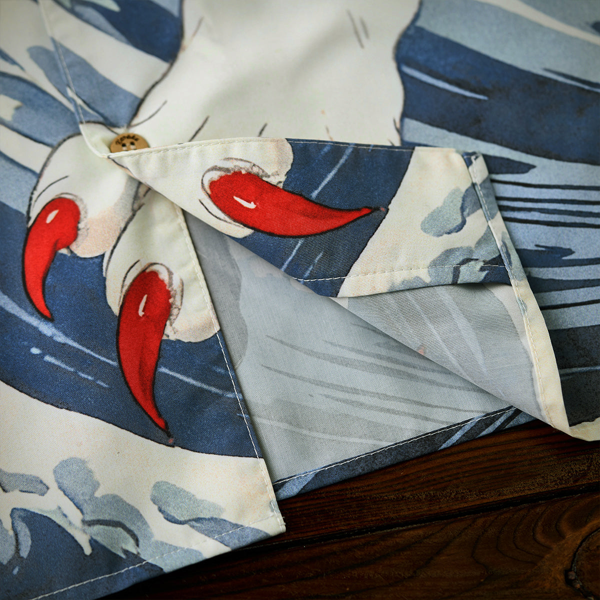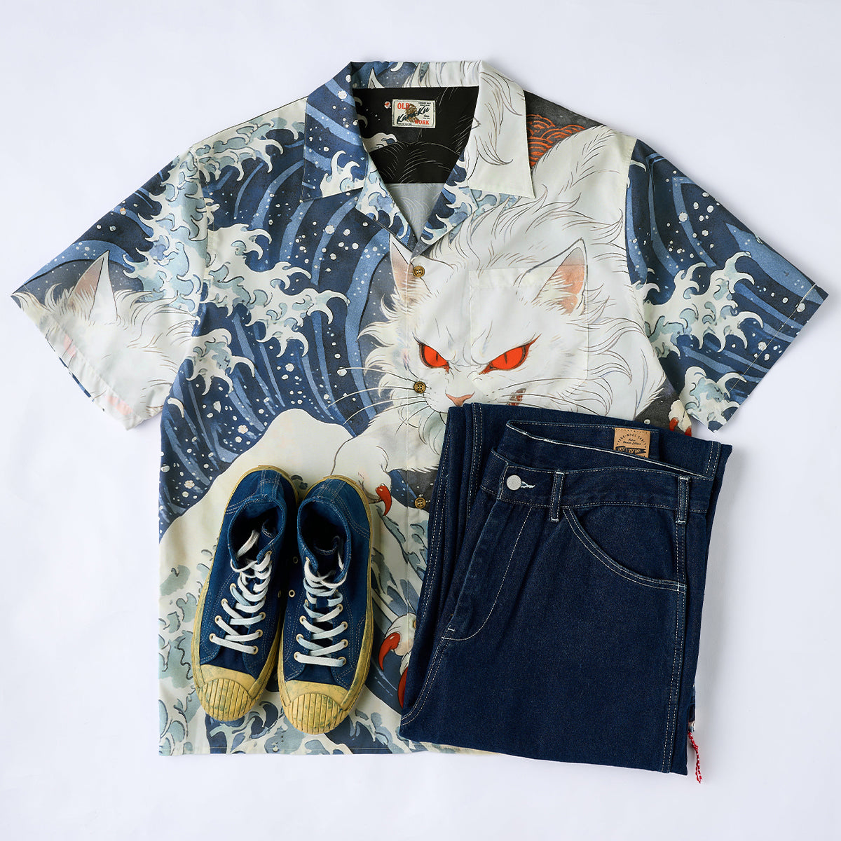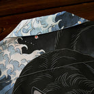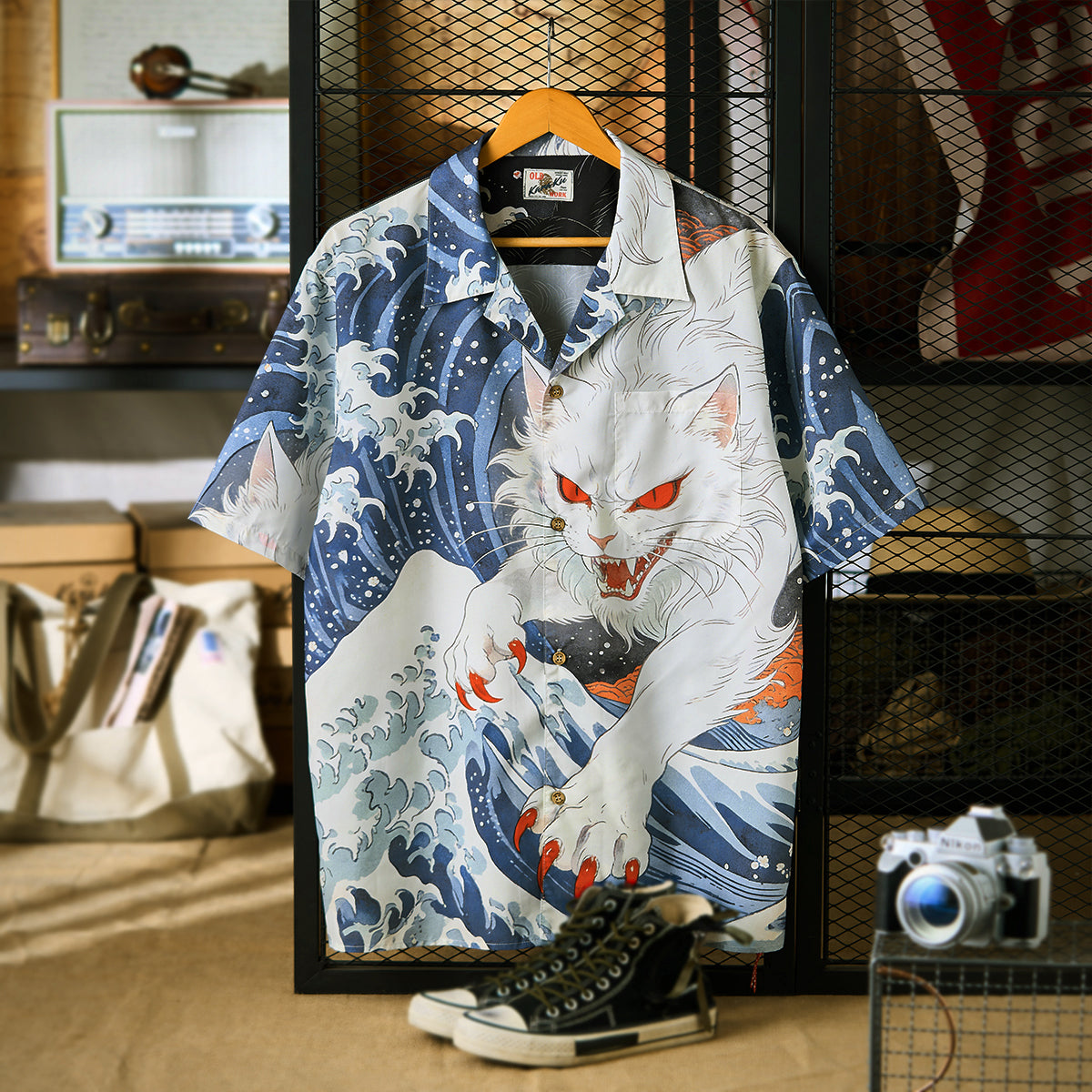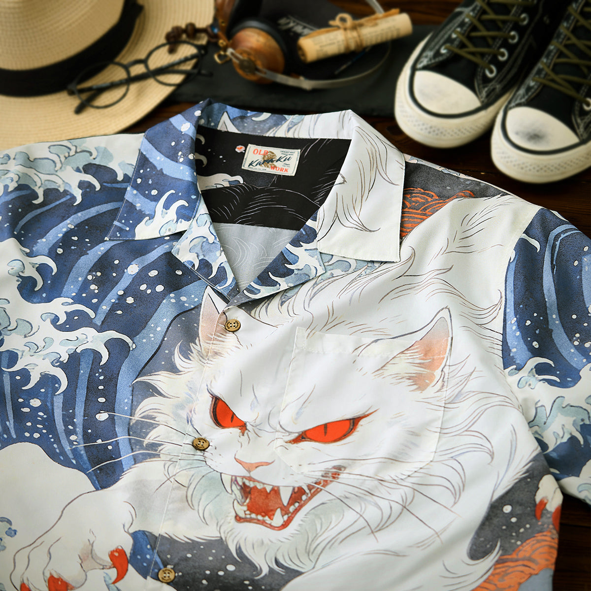 葛飾北斎の代表作「神奈川沖浪裏」からインスピレーションを得て、荒々しくうねる大波のモチーフと、和の世界観に潜む“化け猫”を融合させたアートアロハシャツ。フロントには、静けさを纏いながらもどこか神秘的な存在感を放つ“白猫”を配置。一方バックスタイルでは、巨大な波を背にしながら躍動する“黒猫の化け猫”が大胆に描かれ、見る者に強烈なインパクトを与える構成に。動くたびに表情を変え、和柄アートの奥深さとストリート的な遊び心を同時に表現しています。オープンカラー仕様でリラックス感のあるシルエットを採用し、夏のスタイリングに軽やかさと存在感をプラス。