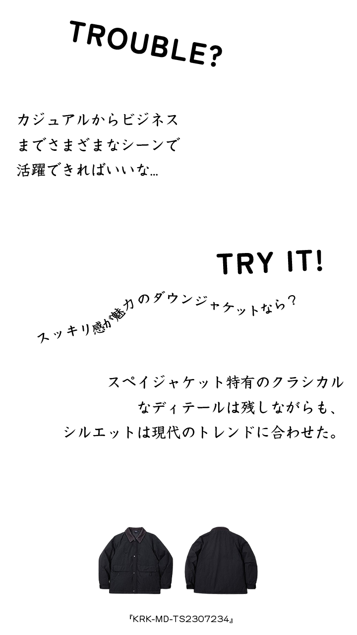 スッキリ感が魅力のダウンジャケットなら?スペイジャケット特有のクラシカルなディテールは残しながらも、シルエットは現代のトレンドに合わせた。