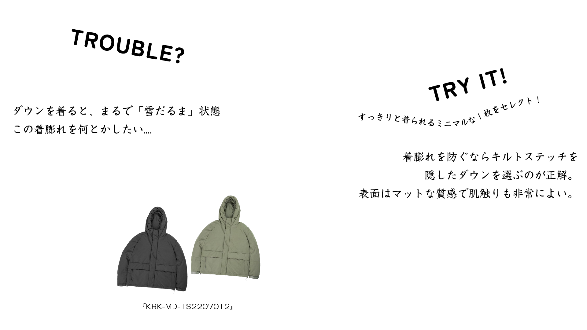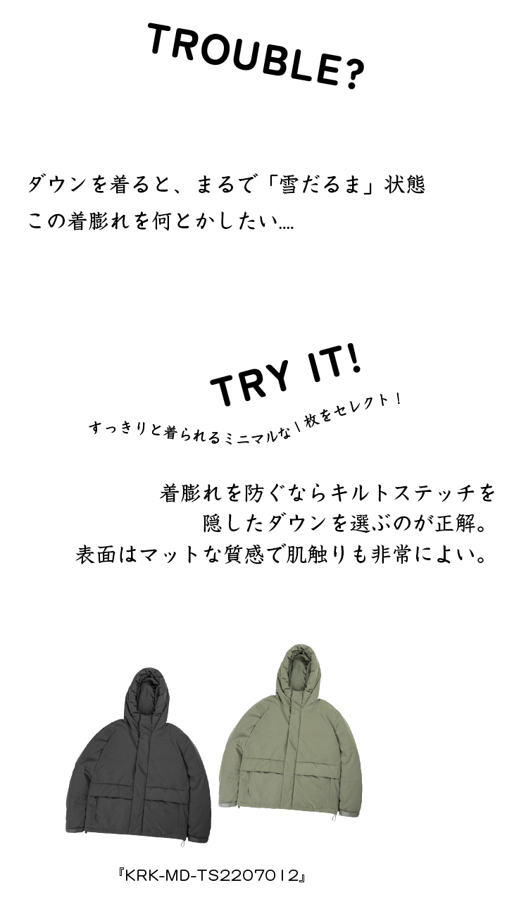 すっきりと着られるミニマルな1枚をセレクト!着膨れを防ぐならキルトステッチを隠したダウンを選ぶのが正解。表面はマットな質感で肌触りも非常によい。