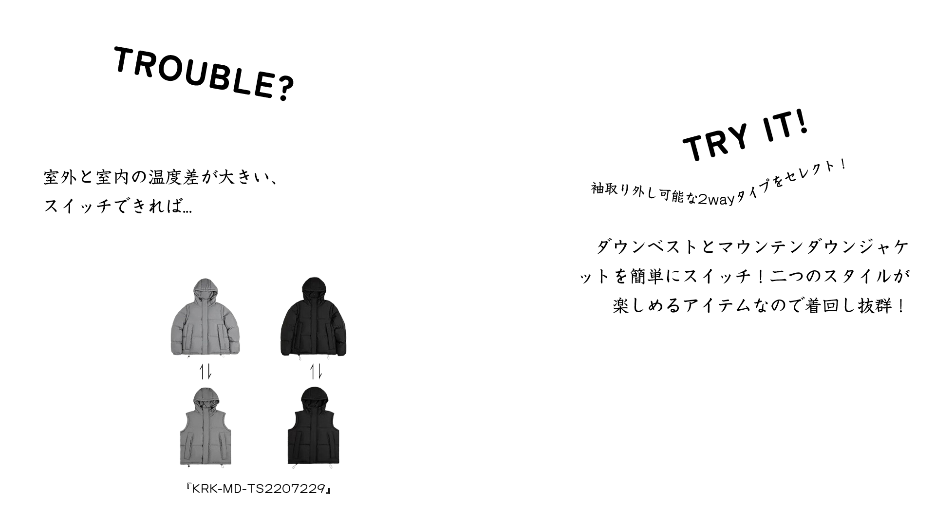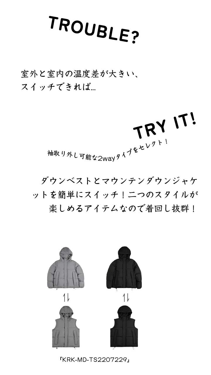 袖取り外し可能な2wayタイプをセレクト!ダウンベストとマウンテンダウンジャケットを簡単にスイッチ!二つのスタイルが楽しめるアイテムなので着回し抜群!