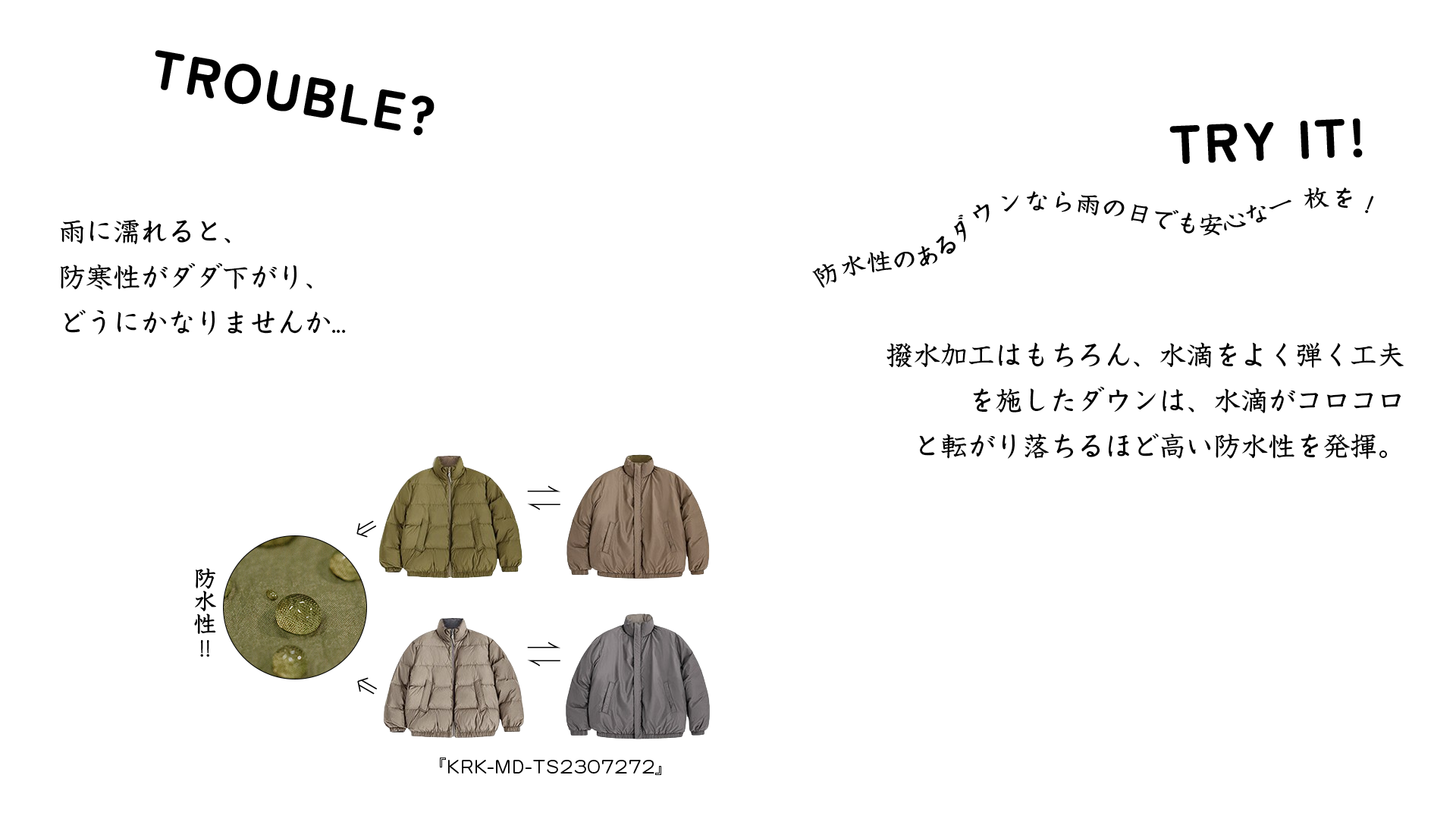 防水性のあるダウンなら雨の日でも安心な一枚を!撥水加工はもちろん、水滴をよく弾く工夫を施したダウンは、水滴がコロコロと転がり落ちるほど高い防水性を発揮。