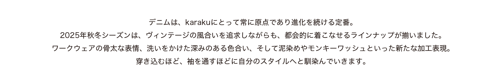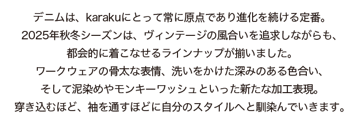 生地には適度な厚みのあるコットンデニムを採用。着込むほどに味わいが増し、経年変化を楽しめるのも魅力。