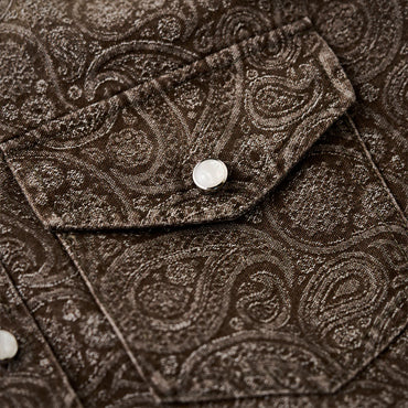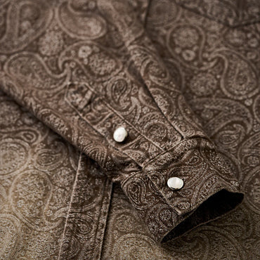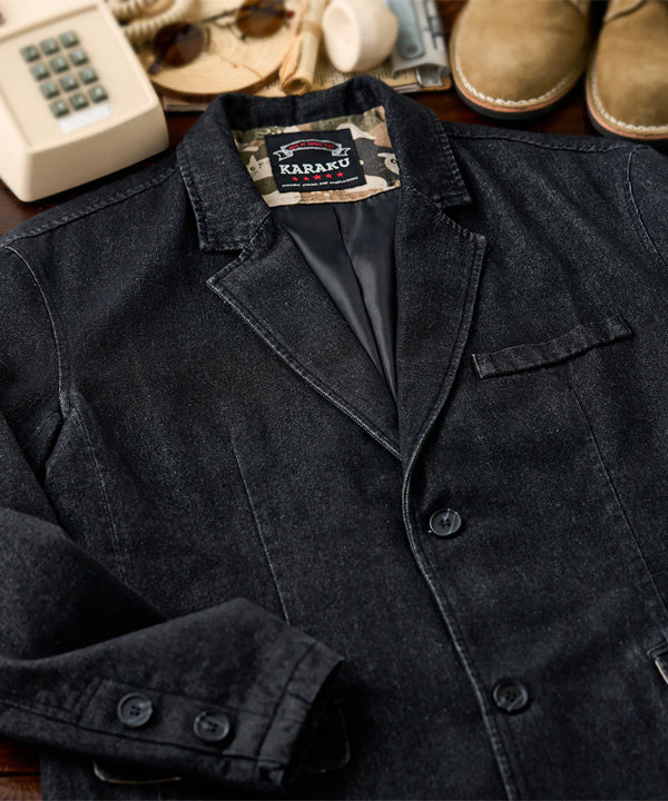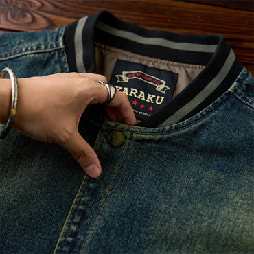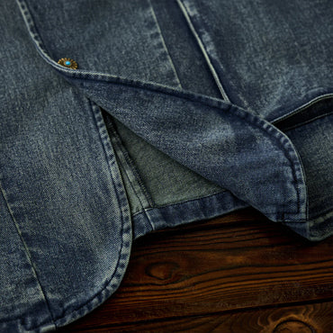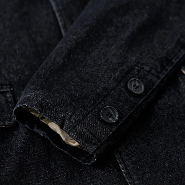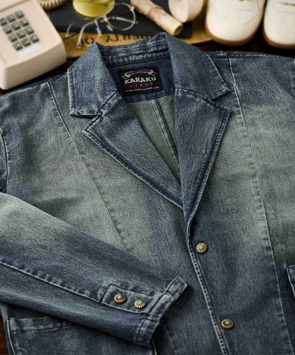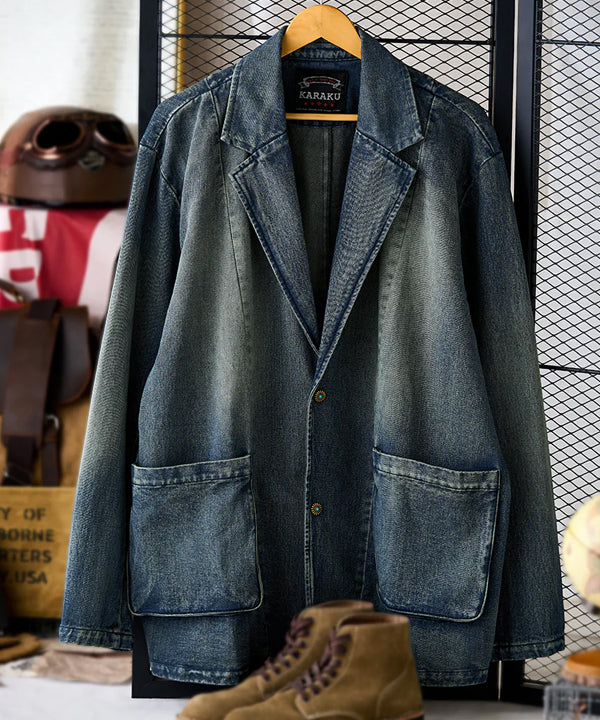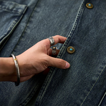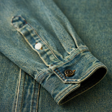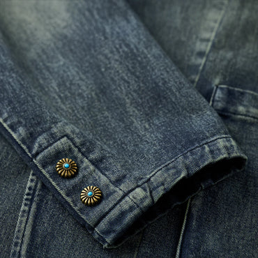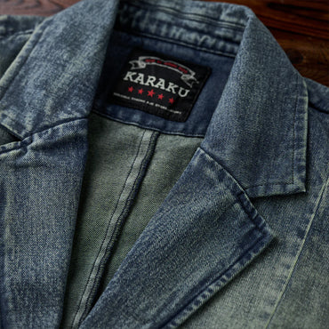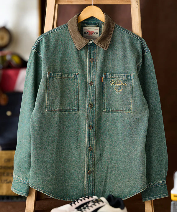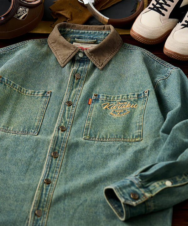襟部分には、風合いの異なるコーデュロイ生地を使用し、デニムとのコントラストが印象的。コーデュロイの温かみとデニムの丈夫さが絶妙に融合し、クラシックでありながらも現代的な雰囲気を感じさせます。