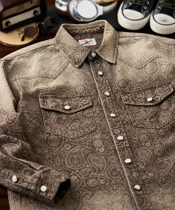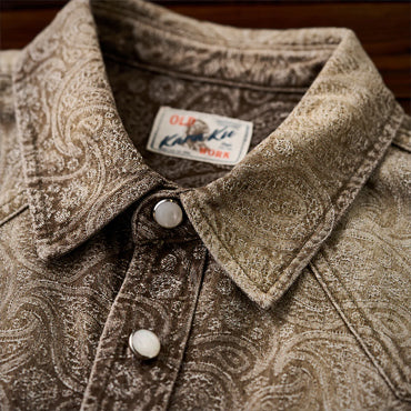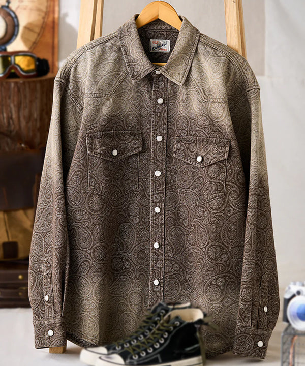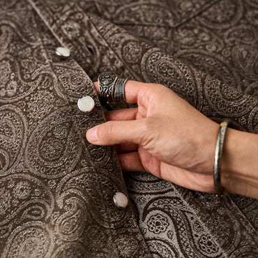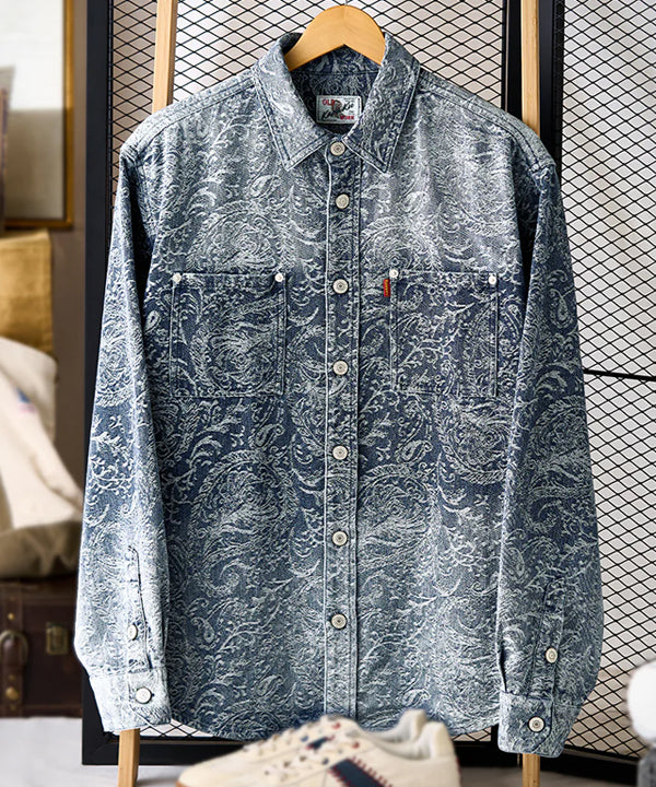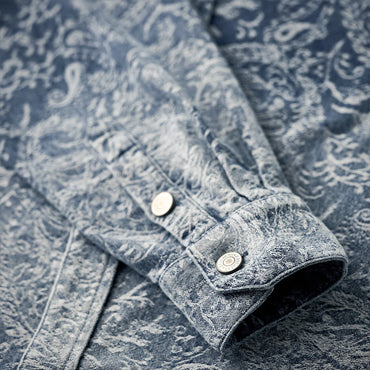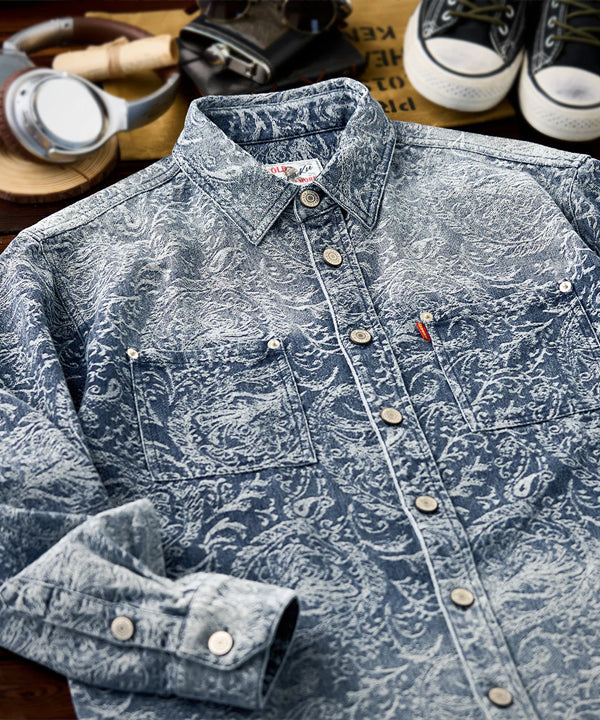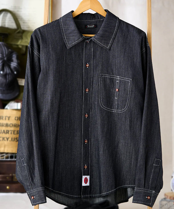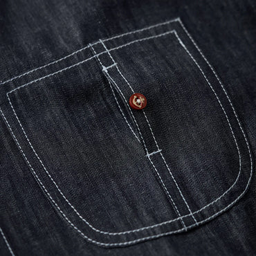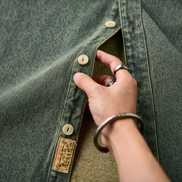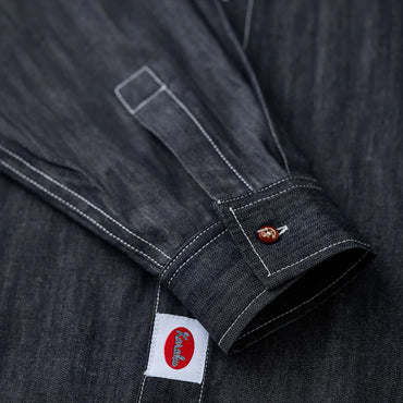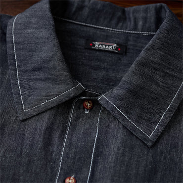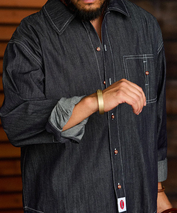 グラデーションは上下で色の濃淡を切り替えた仕上がりで、胸から腰にかけては深みのある濃色、襟元や裾にかけてはやや淡い色合いに。染めではなく織りで魅せるこの風合いは、デニムシャツとしての新たな個性を演出します。