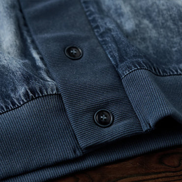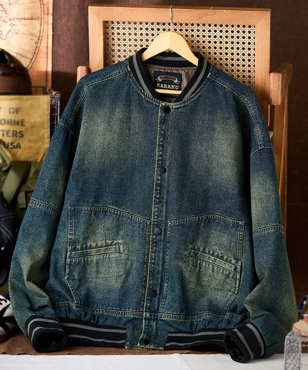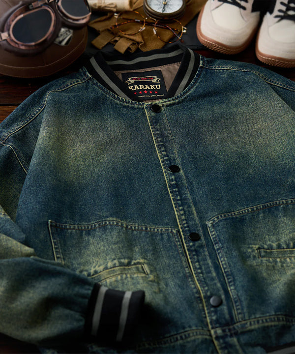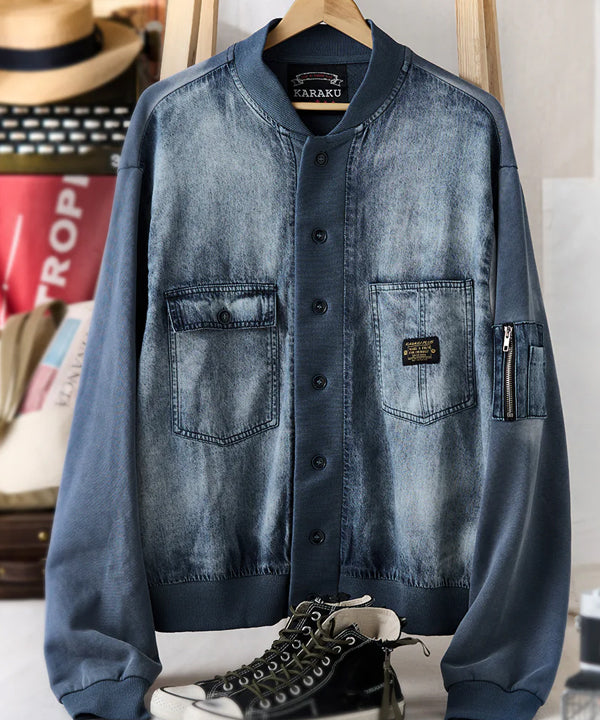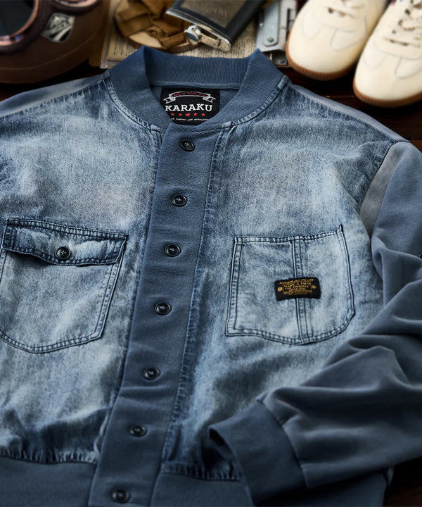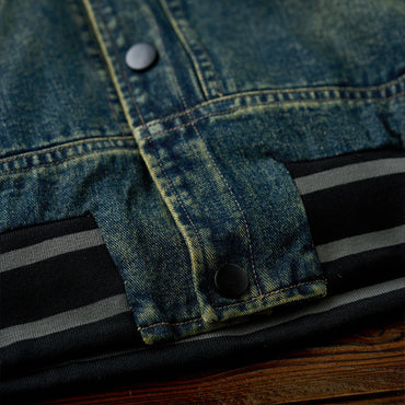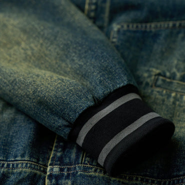 デニムの硬さとリブの柔らかさが対比的で、視覚的にも触覚的にも異素材のコントラストを楽しめます。襟と袖口、裾にリブ素材を使用し、スポーティな印象を与えます。リブ部分にはダークカラーとライトグレーのストライプが入って、アクセントになっています。