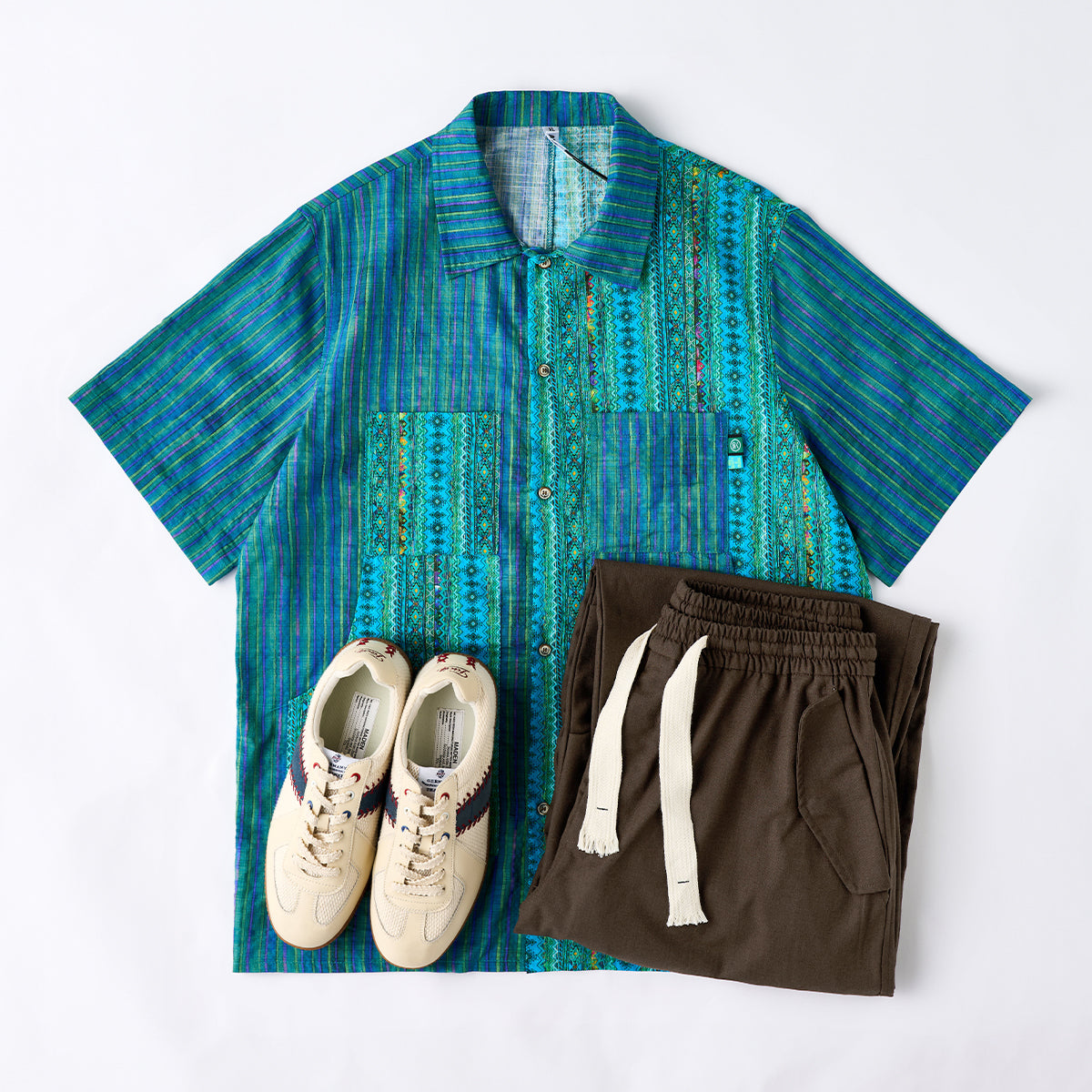 ターコイズ風ボタン付き ストライプ柄コットン開襟シャツ