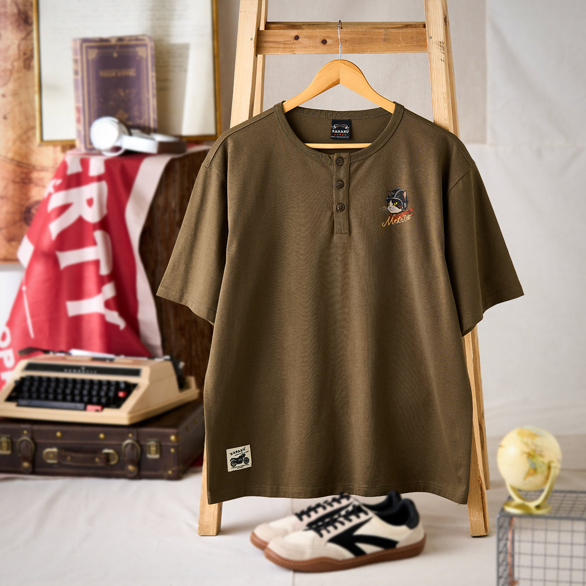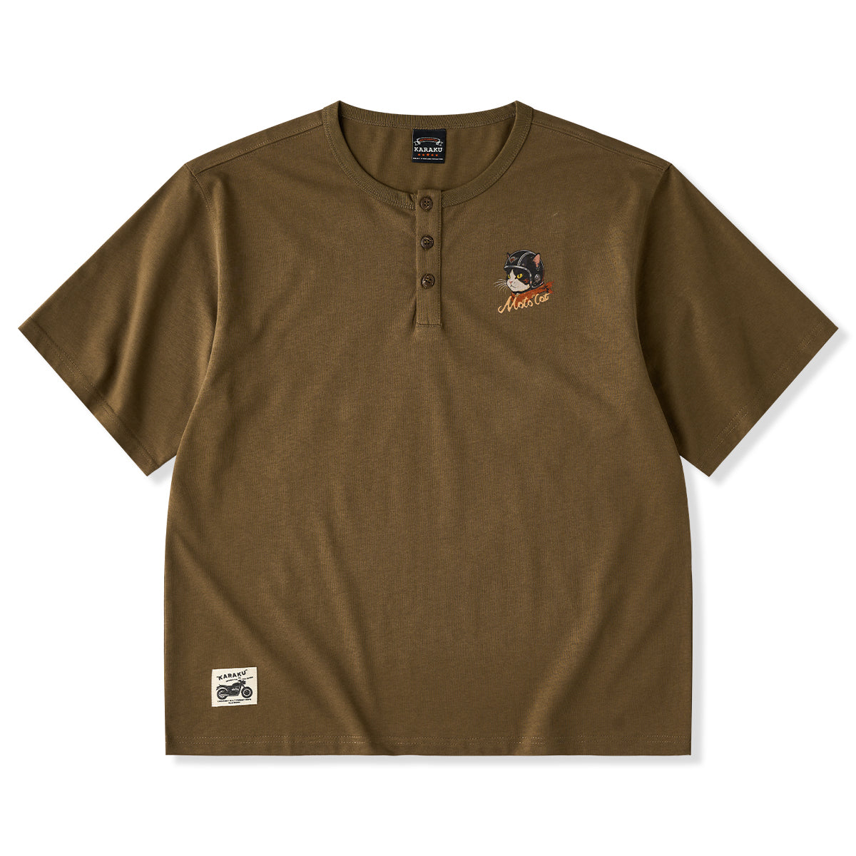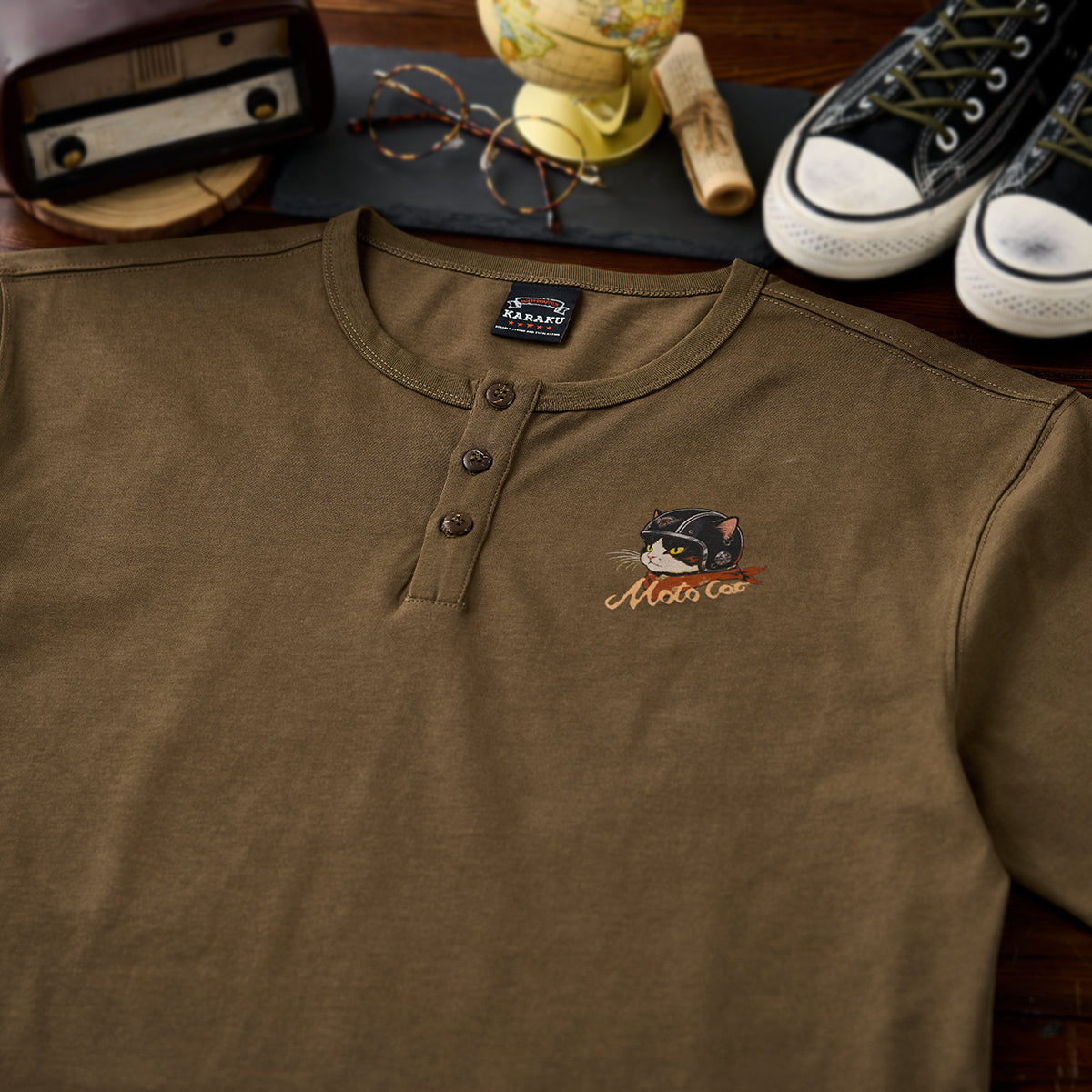 「ヘルメットを被った猫」プリントヘンリーネックTシャツ