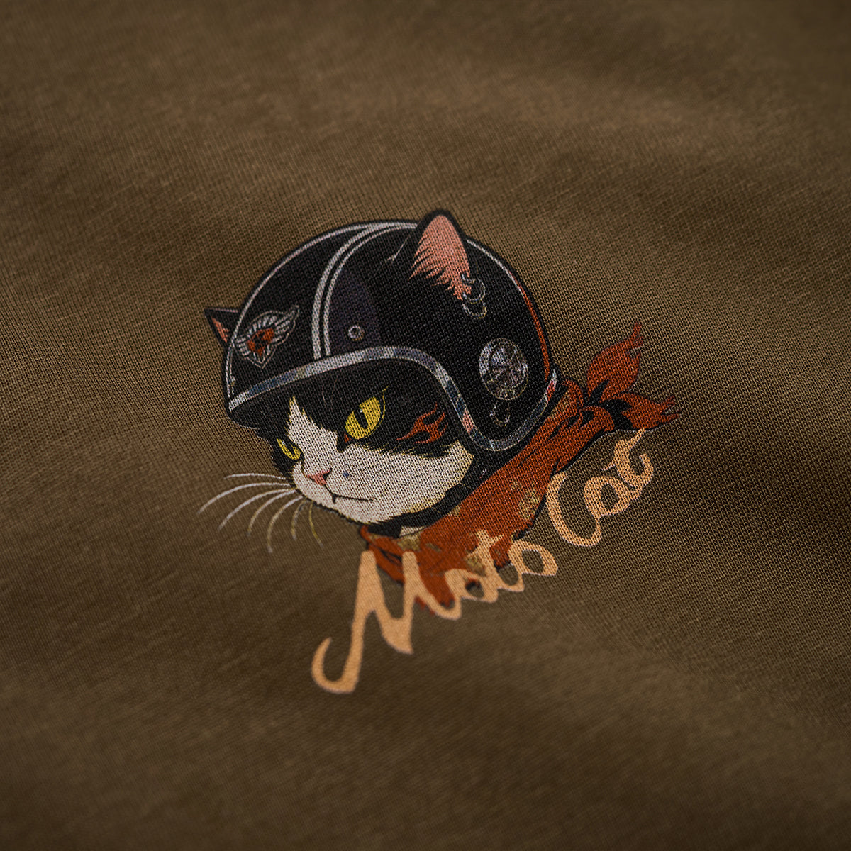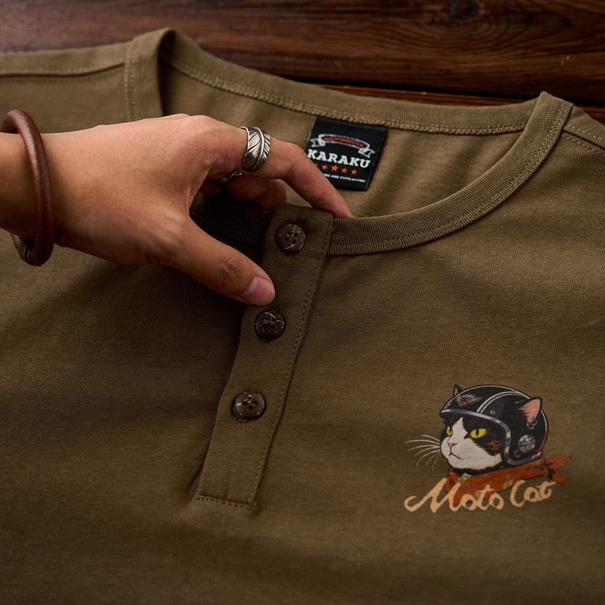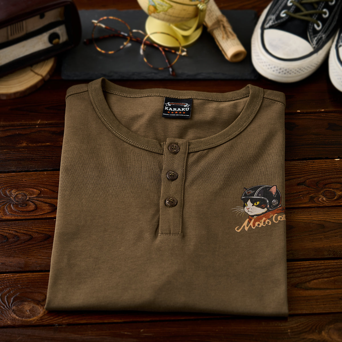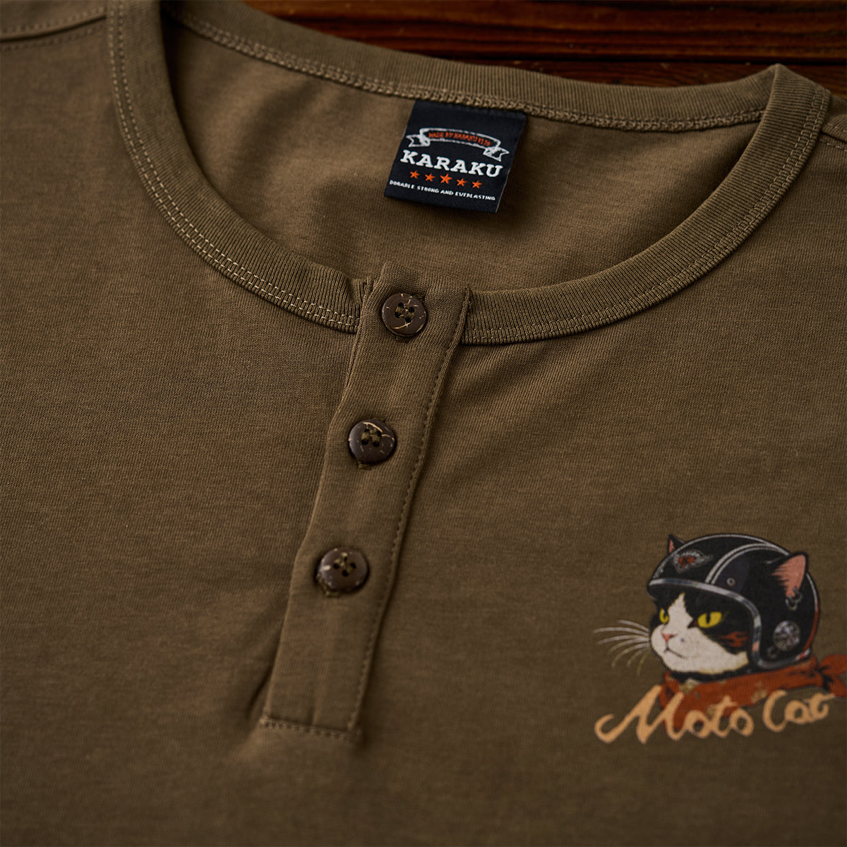 「ヘルメットを被った猫」プリントヘンリーネックTシャツ