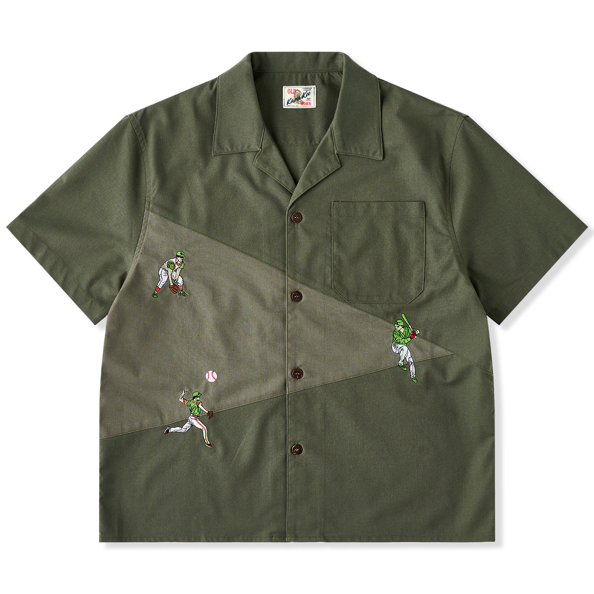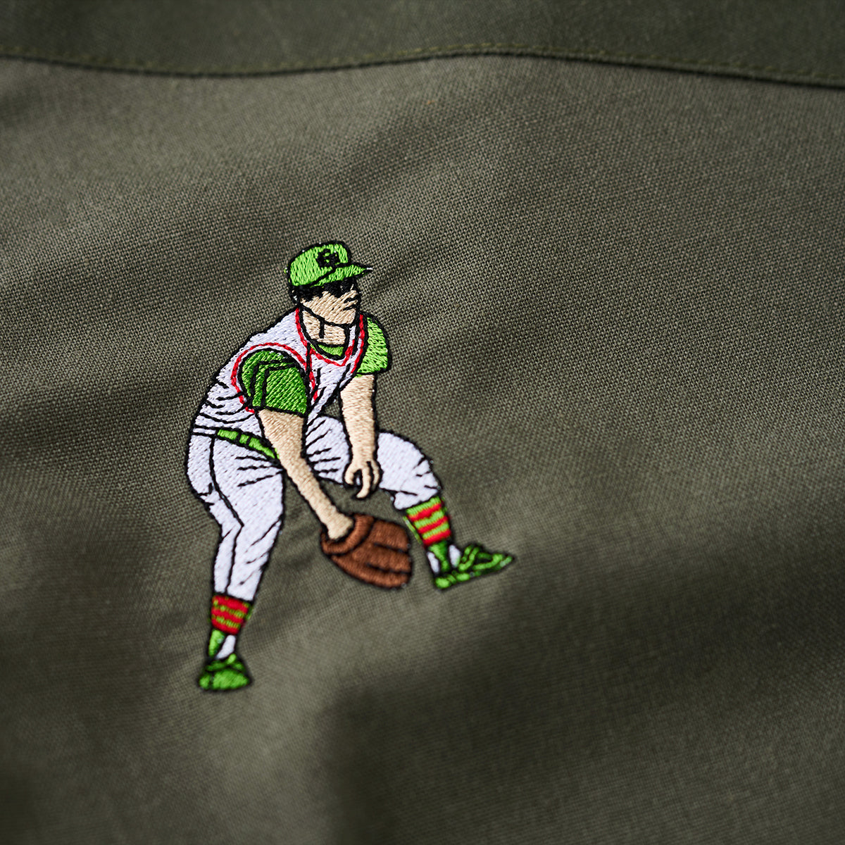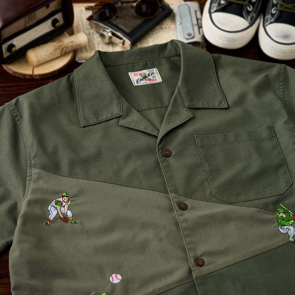 「野球のポジション」刺繍入りリネン混オープンカラーシャツ