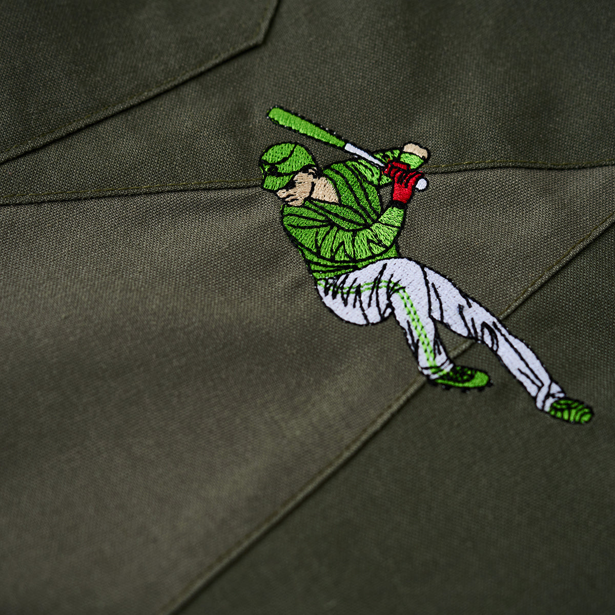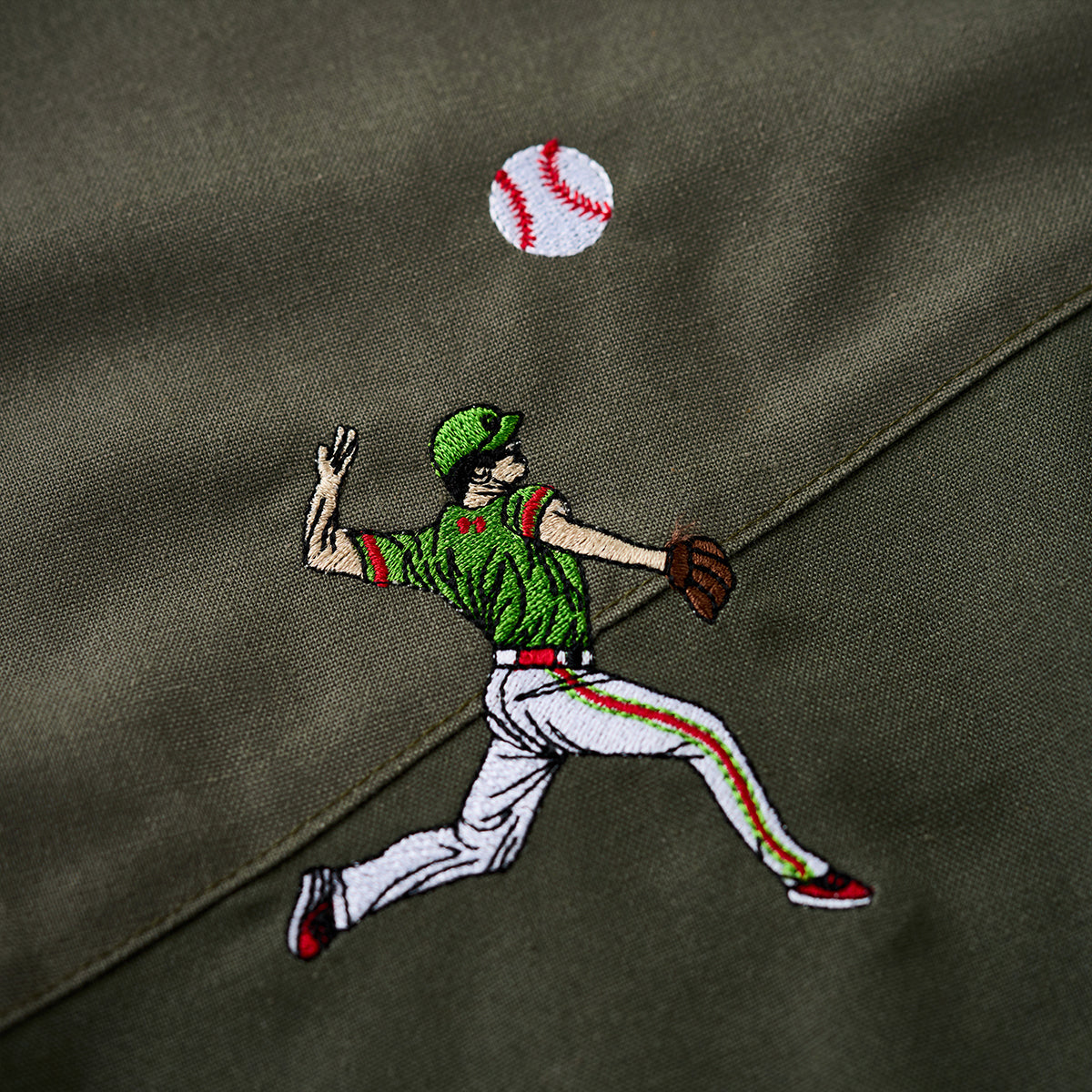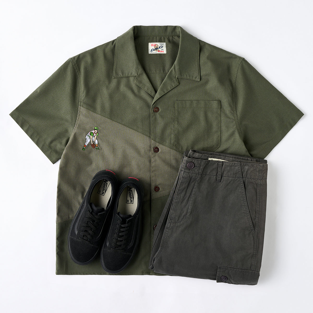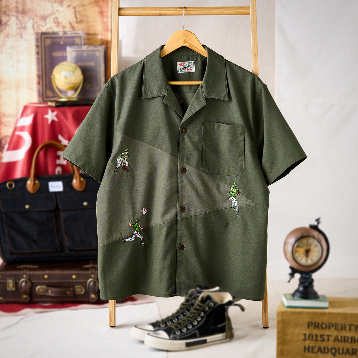 「野球のポジション」刺繍入りリネン混オープンカラーシャツ